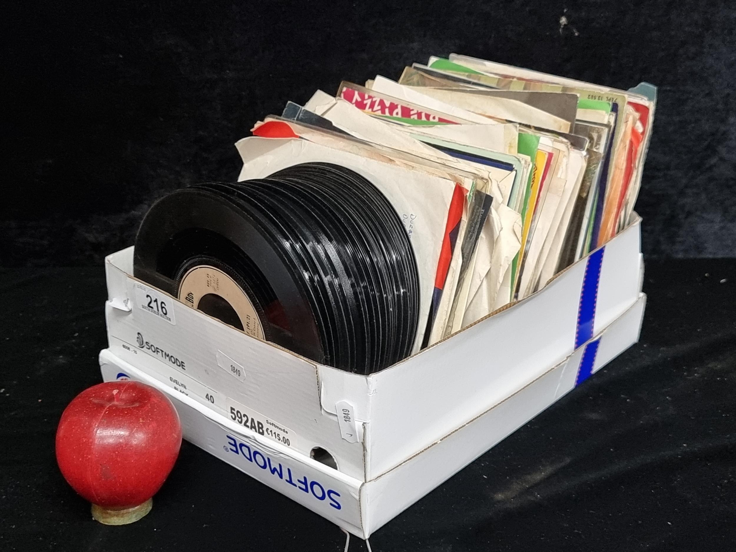 A box containing a collection of 127 vinyl singles including artists such as Don McLean, Frank Sinatra, Wolfe Tones, ABBA, Lionel Richie and Kylie Minogue etc.