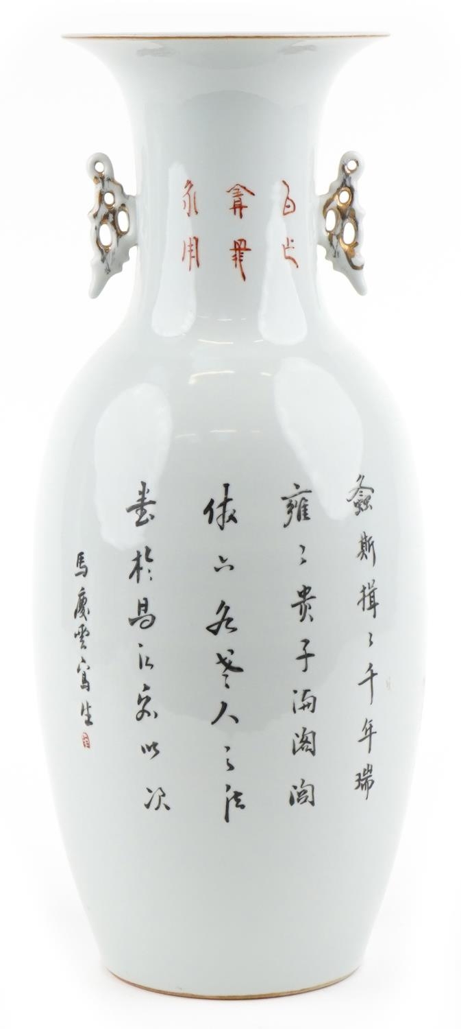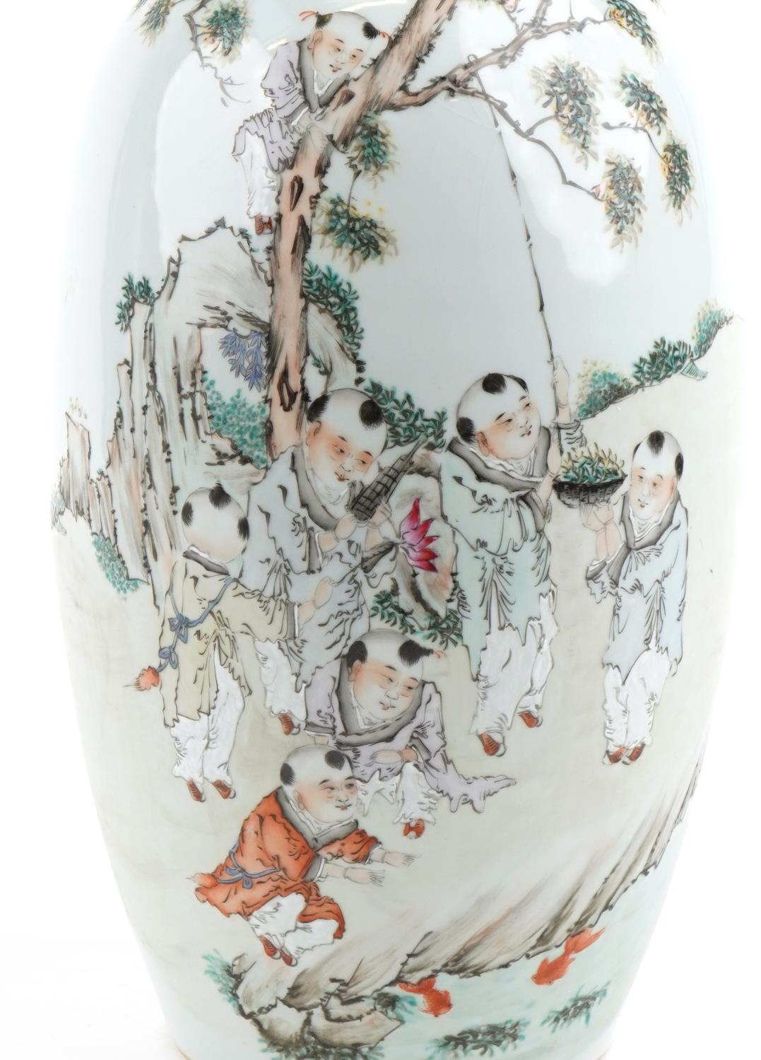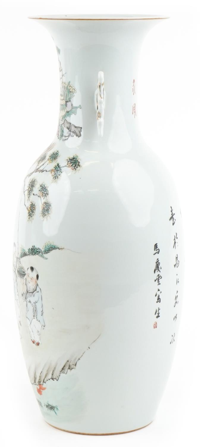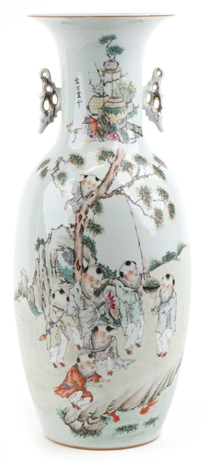 A large Chinese porcelain vase with twin handles hand painted with children playing under a tree and script, 47.5cm high.