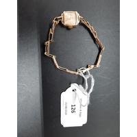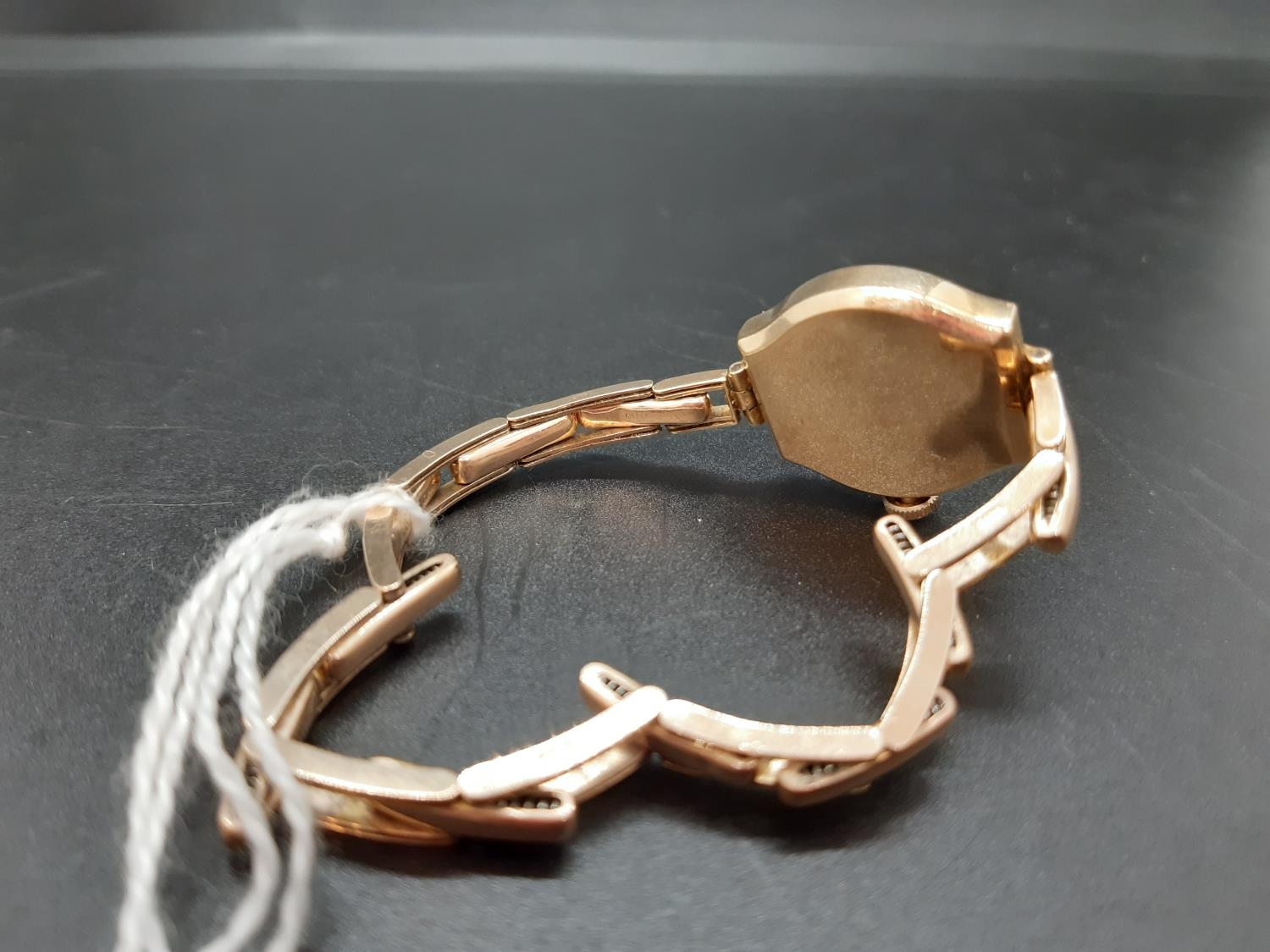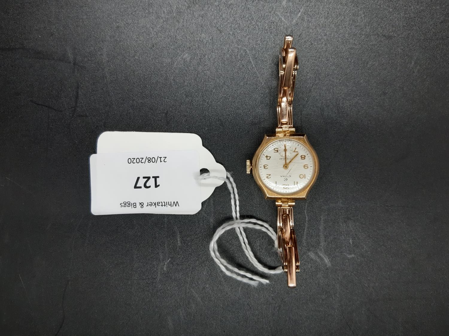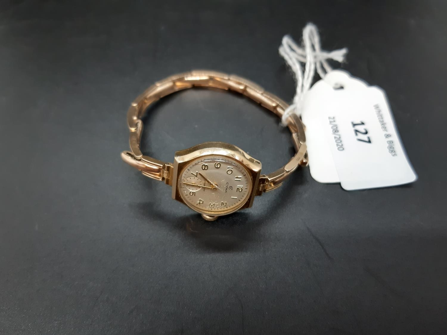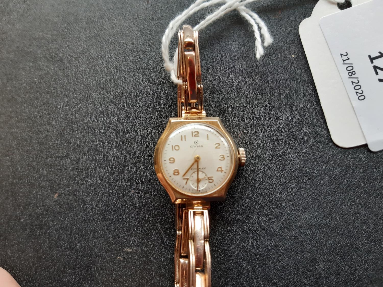 A vintage ladies hallmarked 9ct gold manual wind Swiss, Cyma Cymaflex ladies wrist watch with white enamel face, elasticated strap and second hand dial - total approx. weight (with movement) 16 grams