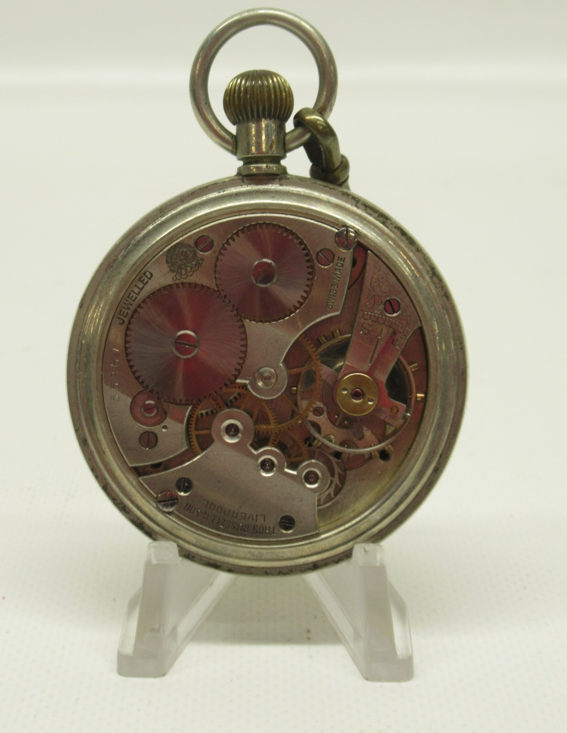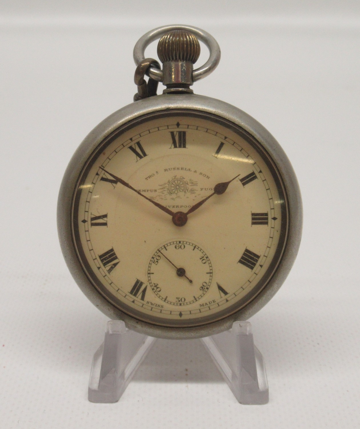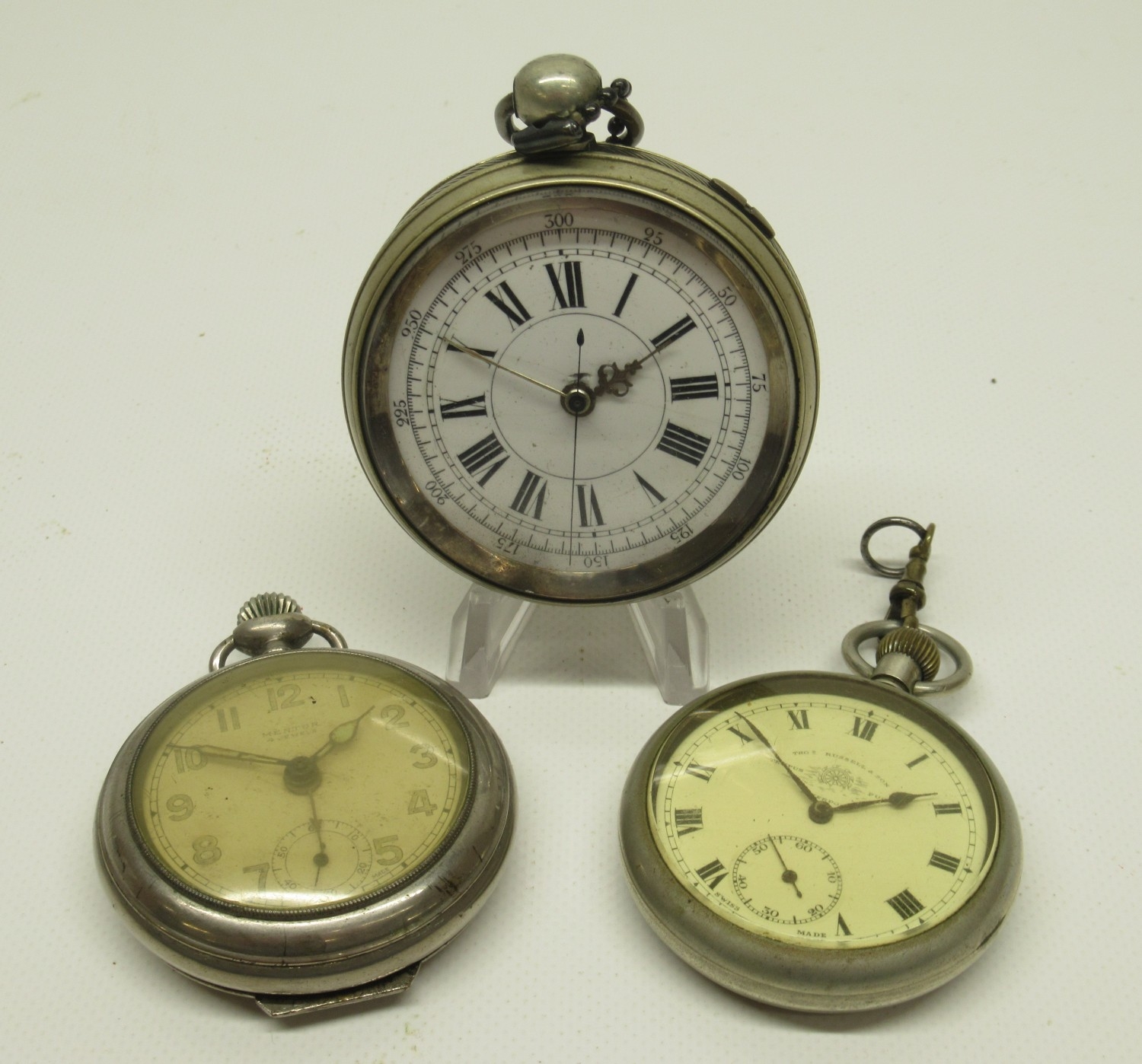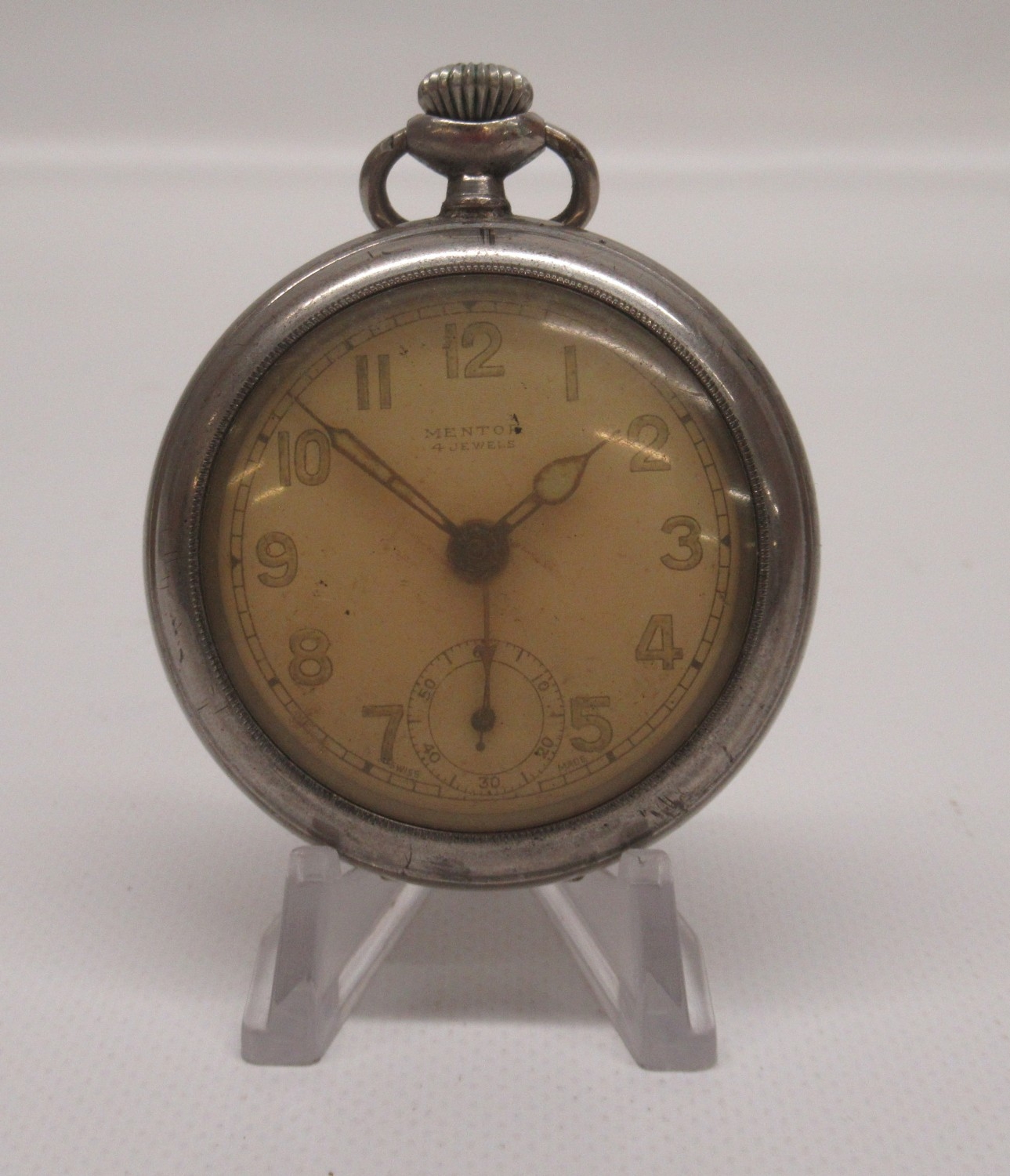 Thos. Russell & Son Liverpool, Silvernus keyless pocket watch, signed white enamel Roman dial with subsidiary seconds, screw on case back no. 181/9191082, signed Swiss Made jewelled movement no. 55867, D51.1mm; Swiss nickel key wound chronograph type pocket watch, D63.2mm and Mentos keyless alarm pocket watch, D54.1mm