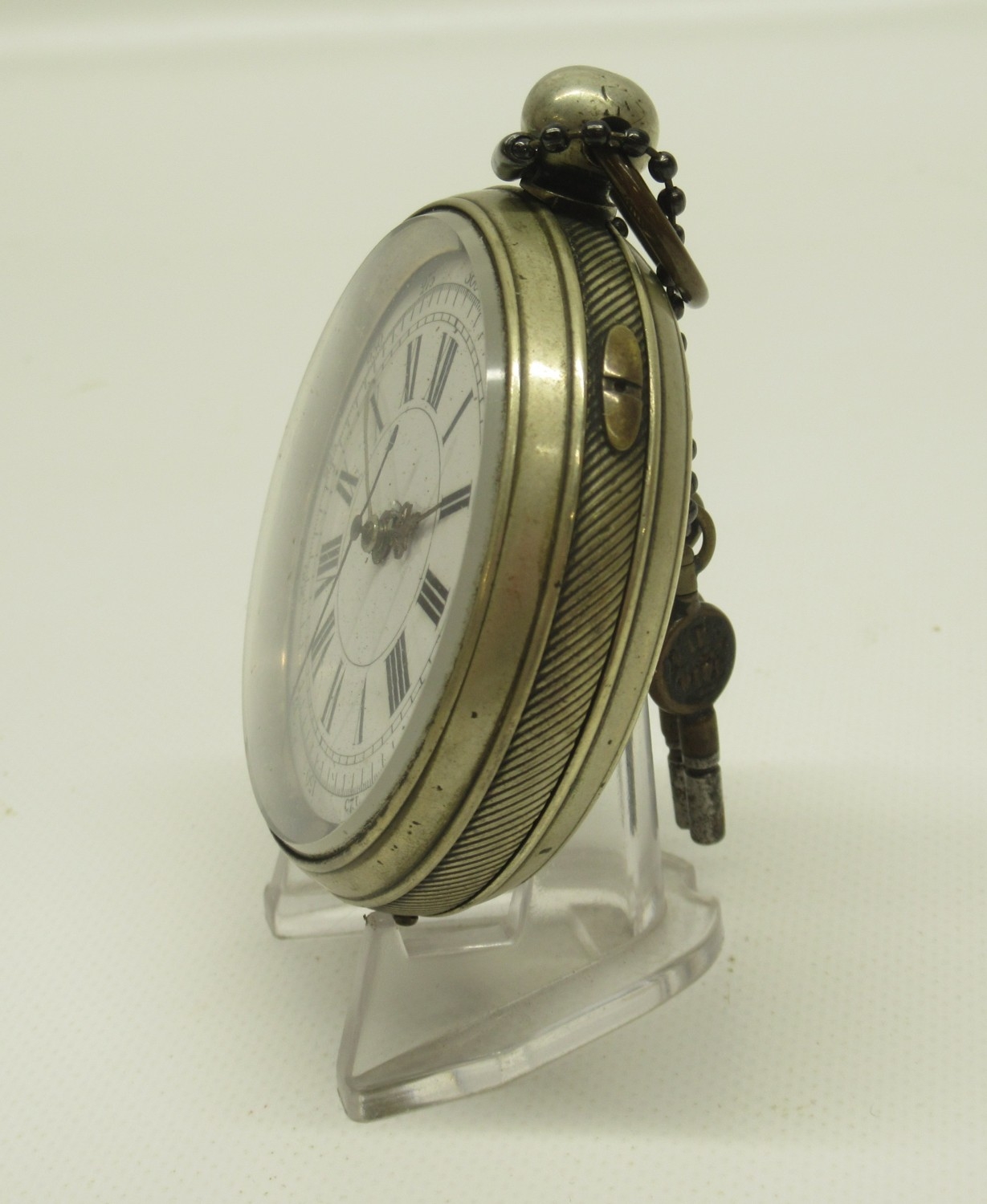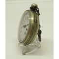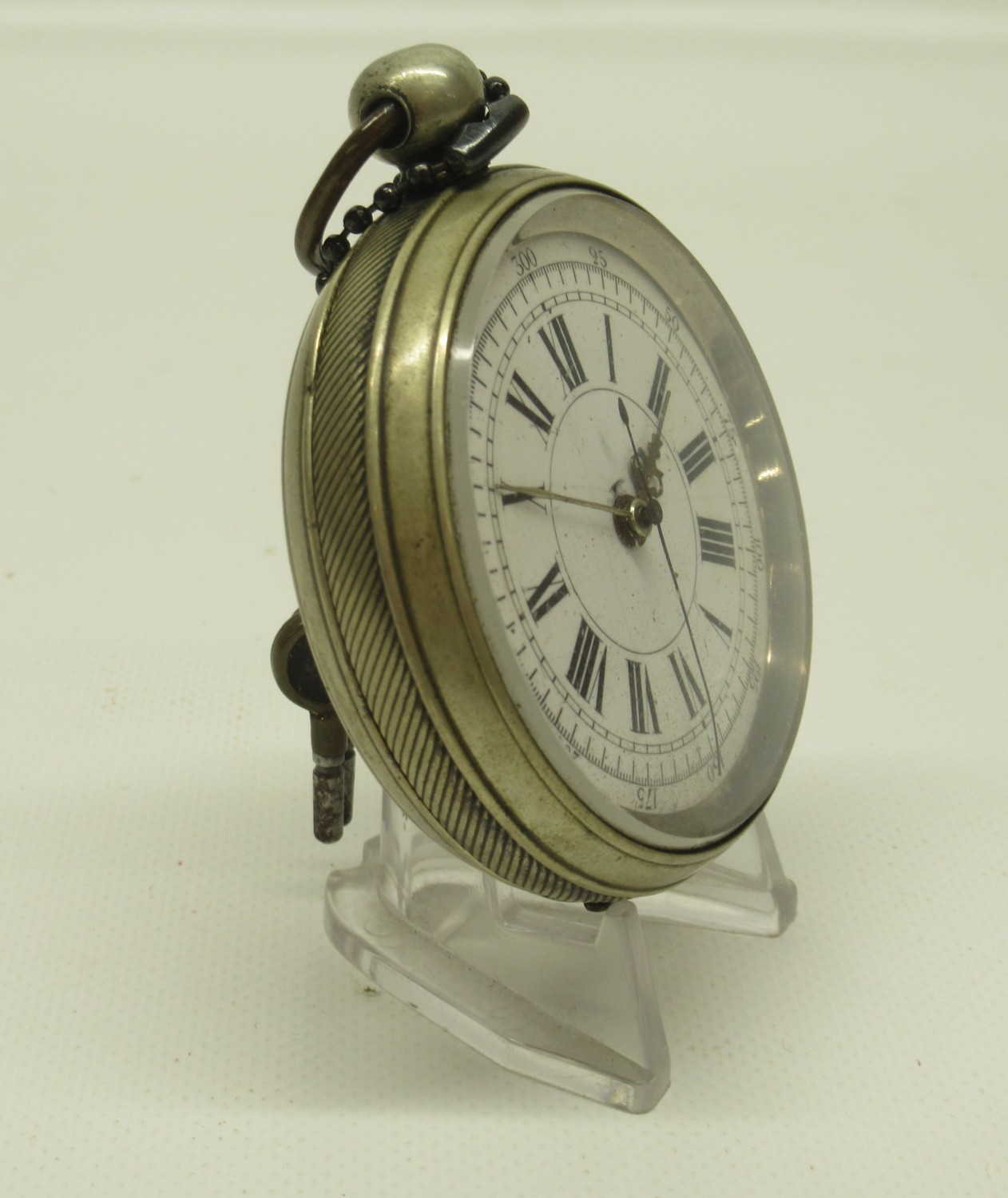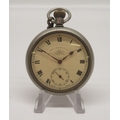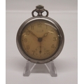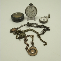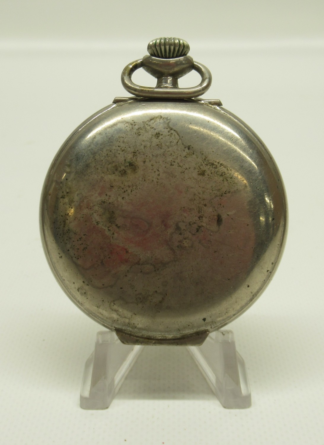 Thos. Russell & Son Liverpool, Silvernus keyless pocket watch, signed white enamel Roman dial with subsidiary seconds, screw on case back no. 181/9191082, signed Swiss Made jewelled movement no. 55867, D51.1mm; Swiss nickel key wound chronograph type pocket watch, D63.2mm and Mentos keyless alarm pocket watch, D54.1mm