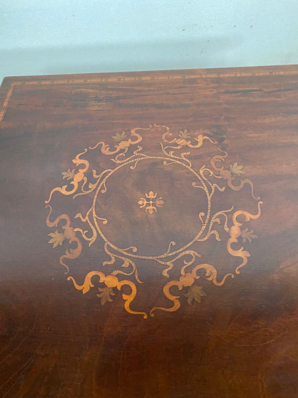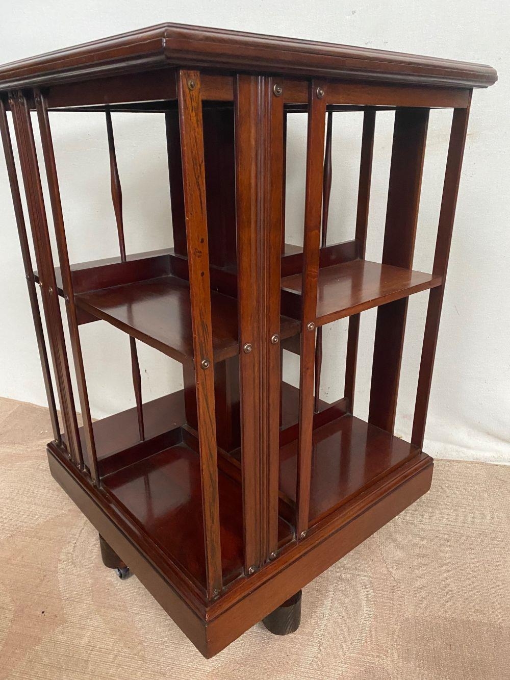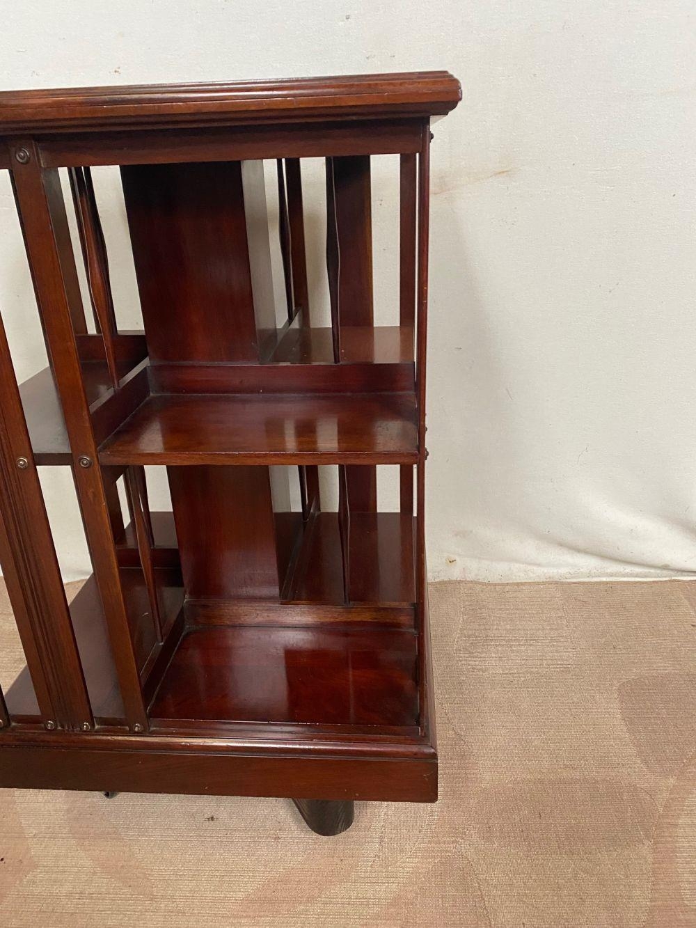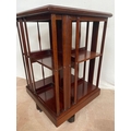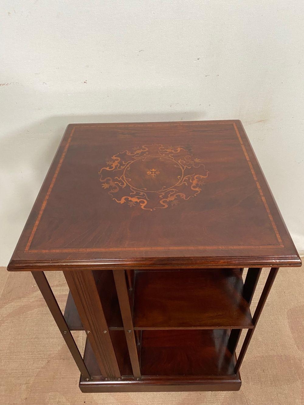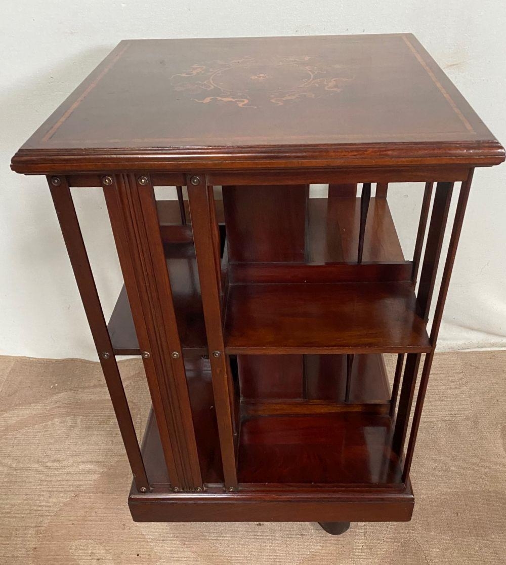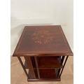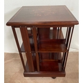 A MAHOGANY INLAID REVOLVING BOOKCASE, with intricate inlay design to centre and border of top. Dimensions: 51cm x 51cm x 81cm high approx