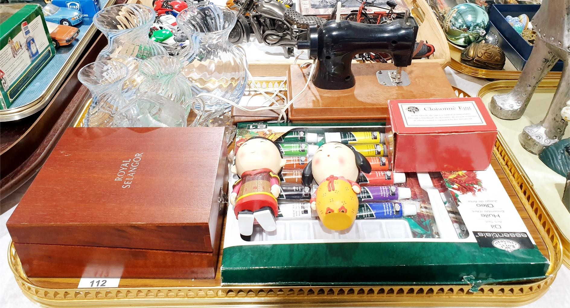 Caithness glass, a child's sewing machine and a cased Royal Selangor teddy bear spoon and egg cup. No shipping. Arrange collection or your own packer and shipper, please. Electricals are sold as scrap.