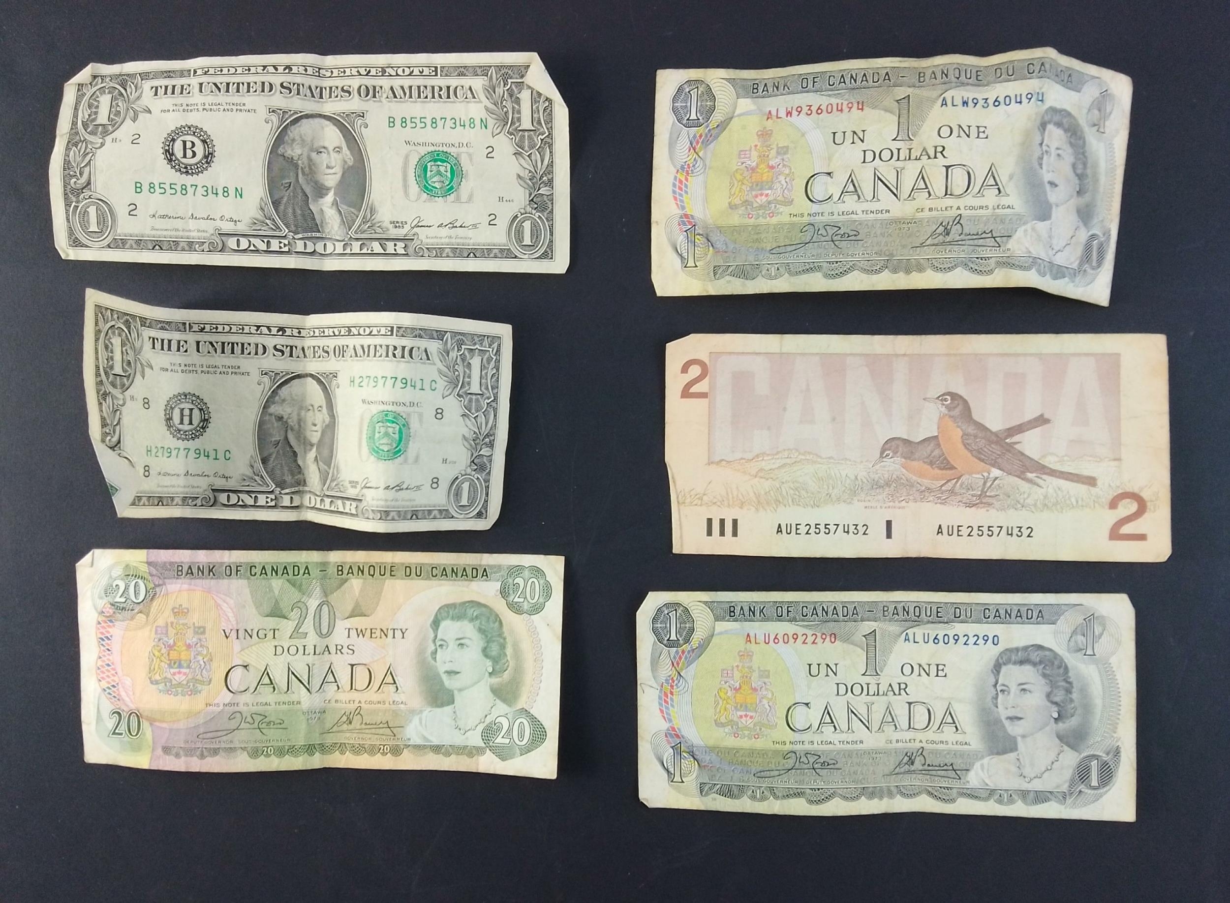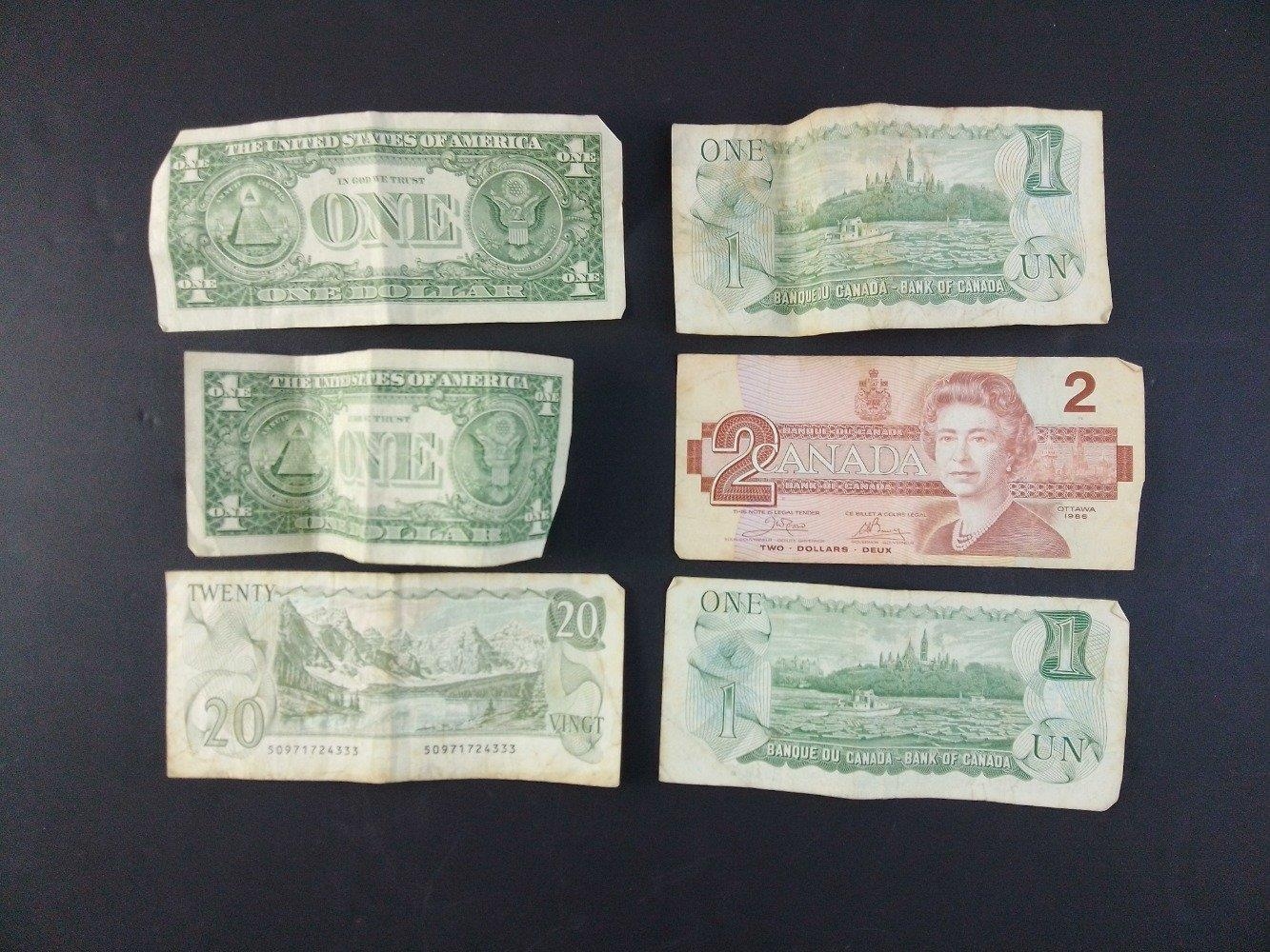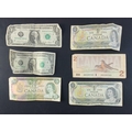 A super little lot of older banknotes to include Canadian and US Dollars. All with wear.