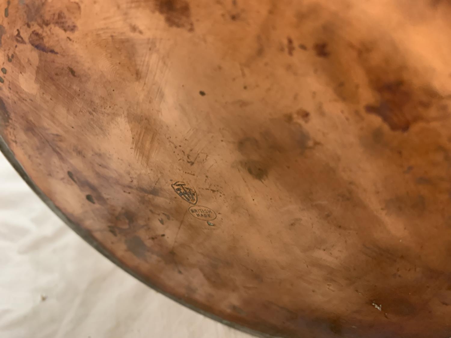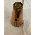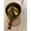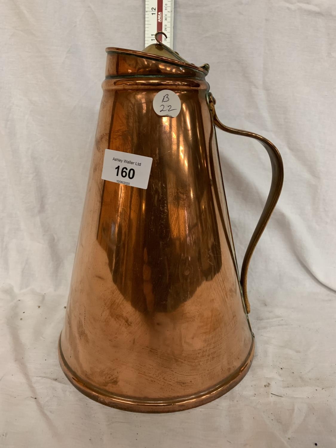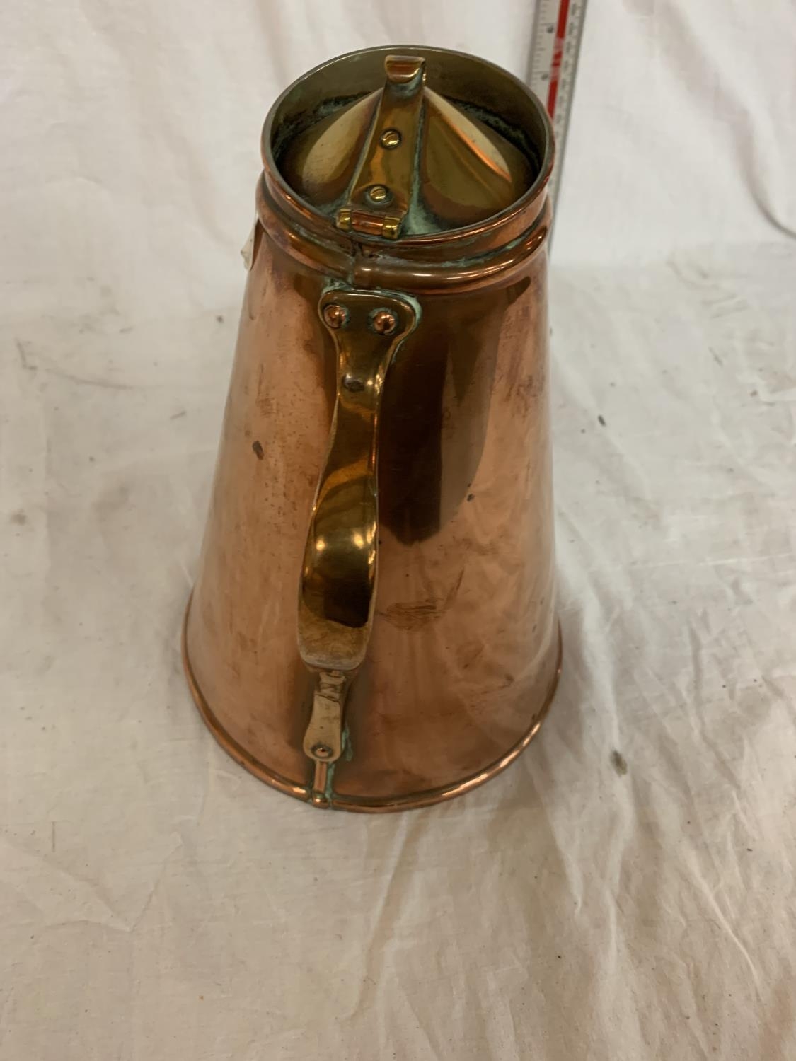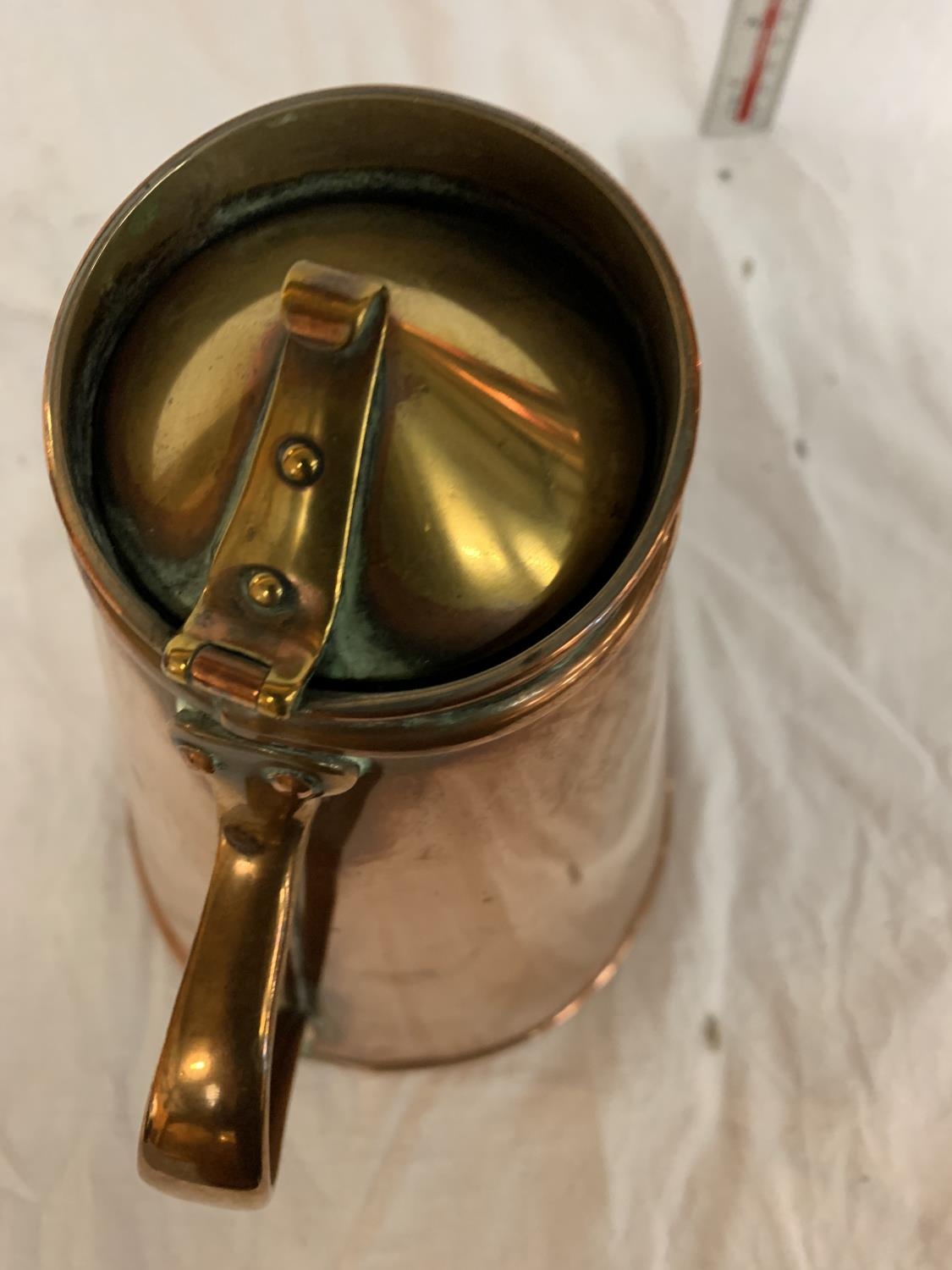 AN ARTS AND CRAFTS COPPER AND BRASS LIDDED JUG 25CM TALL