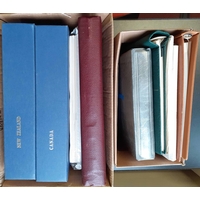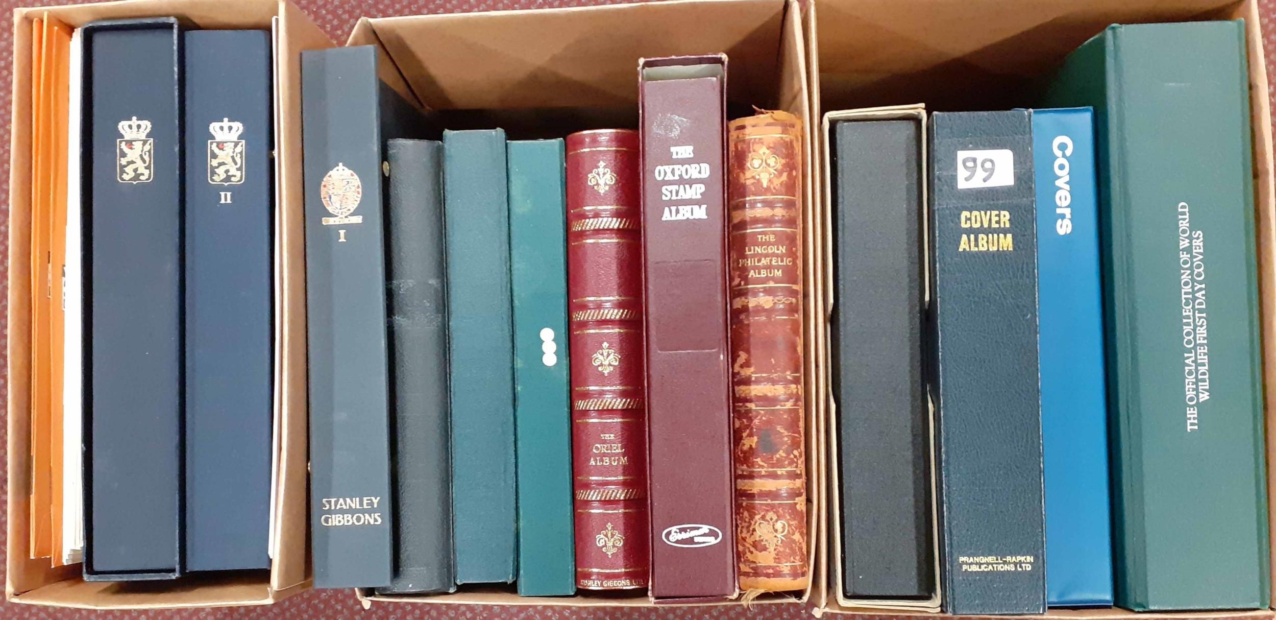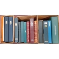 ASSORTED QUALITY 2-PEG ALBUMS: Three boxes containing a variety of 'better' types of albums and binders inc. slip-cased Davo Belgie/Belgique Vol.I with pages 1-84 for 1849-1961 (many hingeless mounts applied and a few light pencil annotations) plus numerous back-of-the-book supplementary pages and Vol II with pages 148-174 for 1978-1985 plus some back-of-the-book, also a range of supplements for Suisse/Helvetia from 1950s-1970s and a range of 2009 supplements for Scandinavian countries still in original wrappers; slip-cased Errimar 'Oxford' Stamp album complete with apparently new and unused pages; empty Stanley Gibbons 2-peg binder for Great Britain with supplement pages for 2009, plus 'Exeter' albums (2), one with apparently unused pages, a 'Plymouth' binder (end-papers slightly foxed), and a half-leather 'Oriel' binder; also other publishers. A useful lot of albums in good used condition. (13 binders and c.20 packs) Sold in aid of the Trussell Trust supporting a nationwide network of food banks and campaigning for change to end the need for food banks in the UK. Cross Reference: BELGIUM