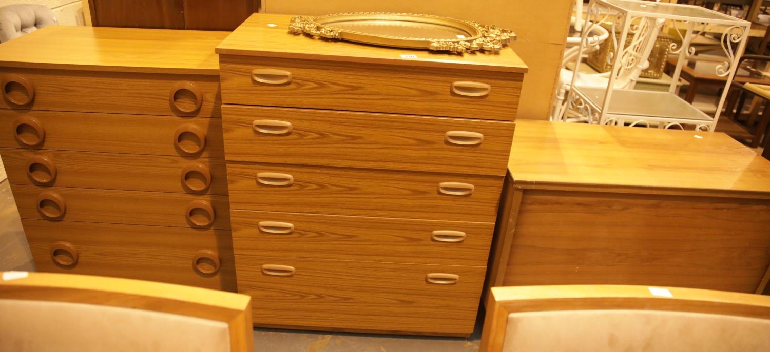Two modern five drawer chest of drawers with a blanket chest. This lot is not available for in-house P&P.