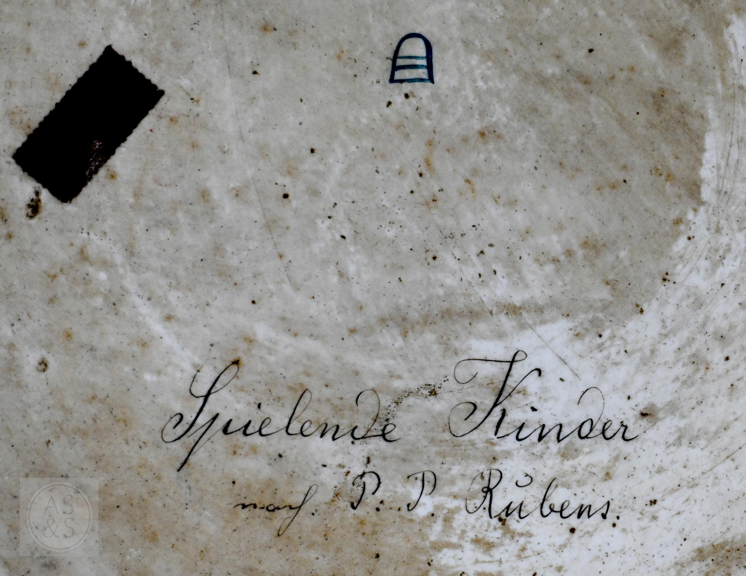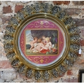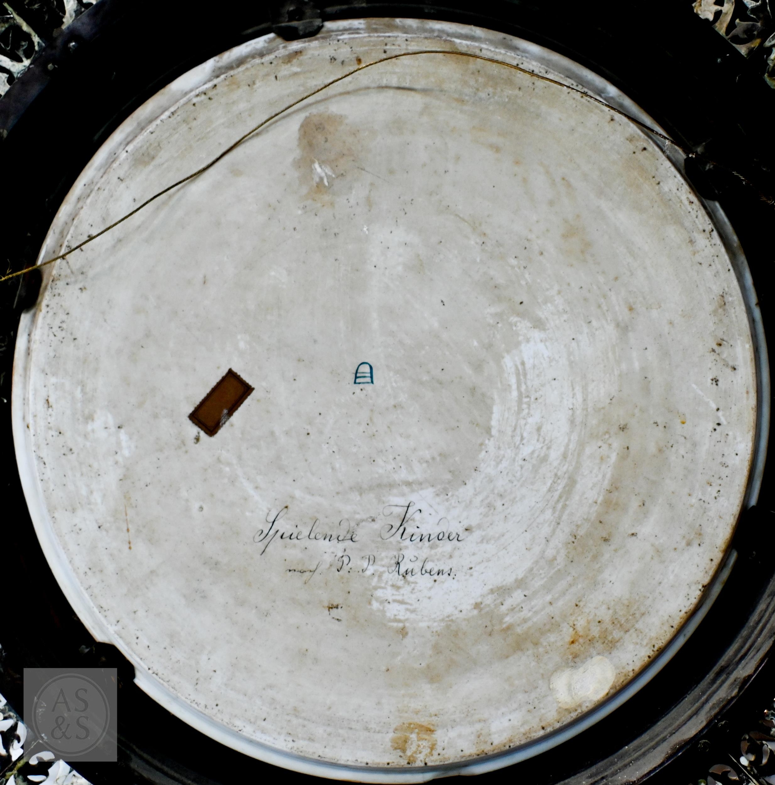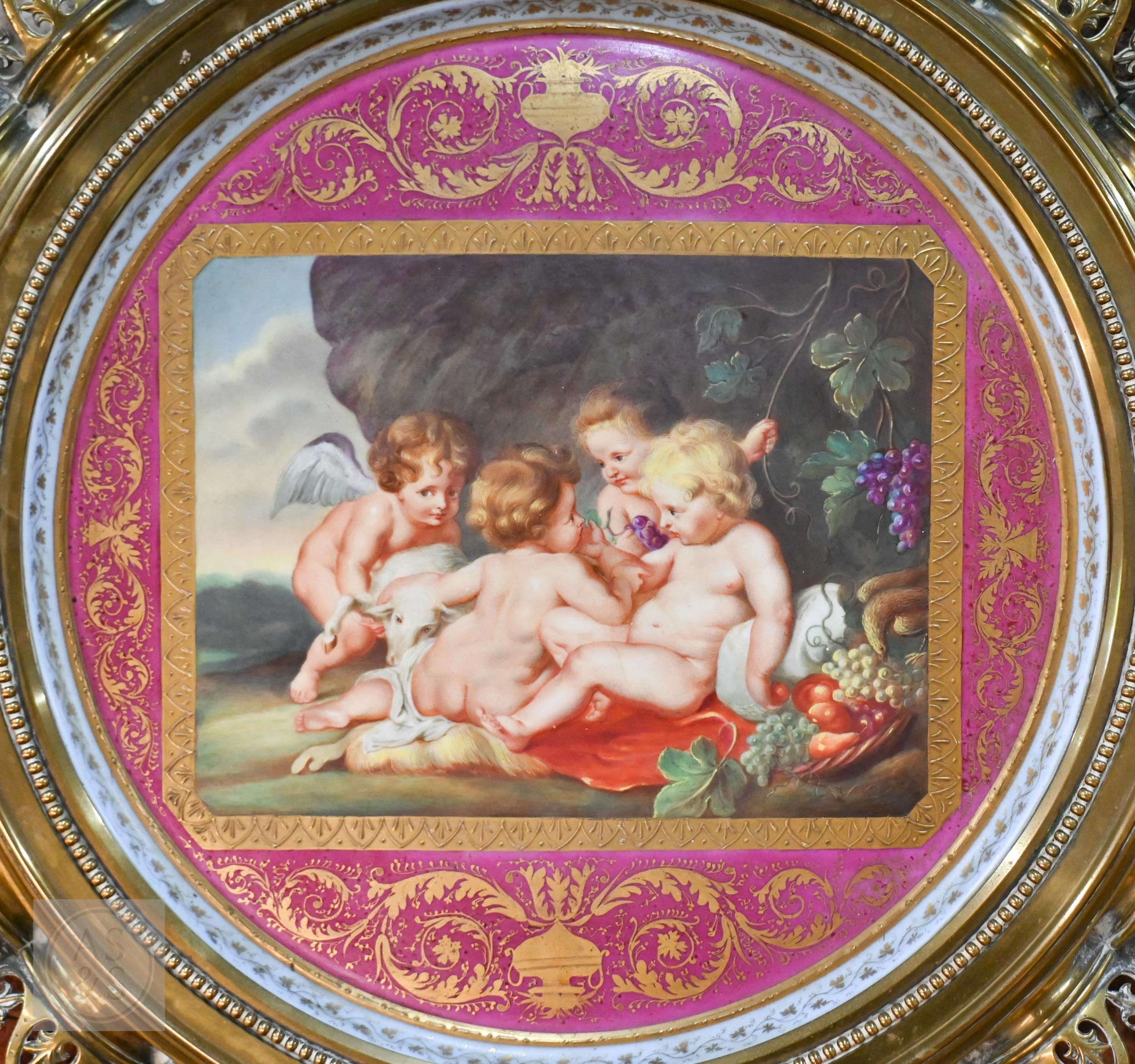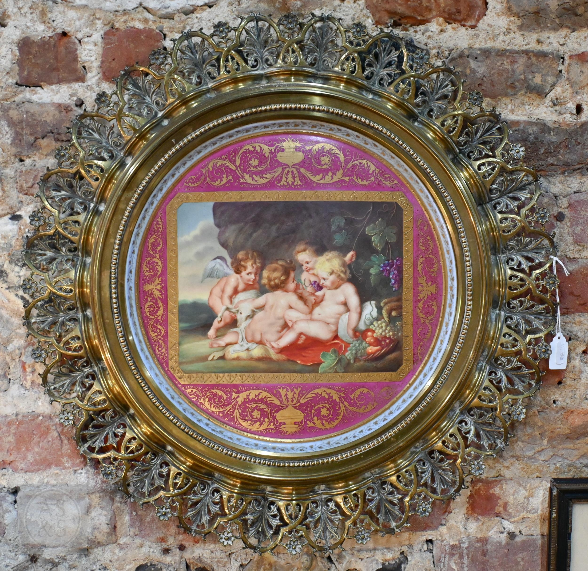 A 19th Century Vienna porcelain cabinet tray, painted with Rubens' 'Christ and John the Baptist as Children with two Angels', on puce ground with gilding, inscribed on reverse 'Spielende Kinder ... P.P. Rubens', 35cm diameter, mounted in moulded and pierced brass frame, 55cm diameter o/a