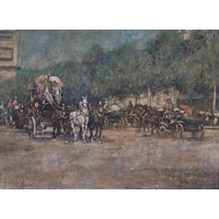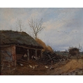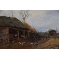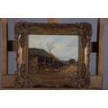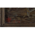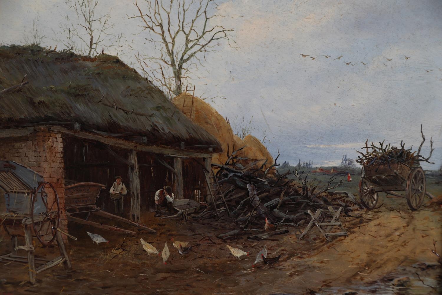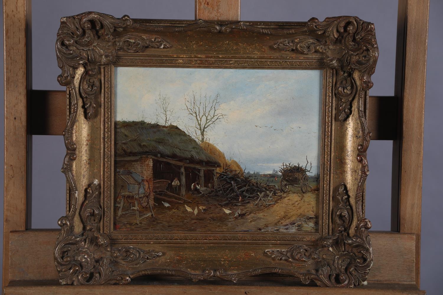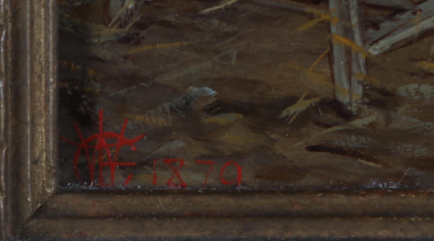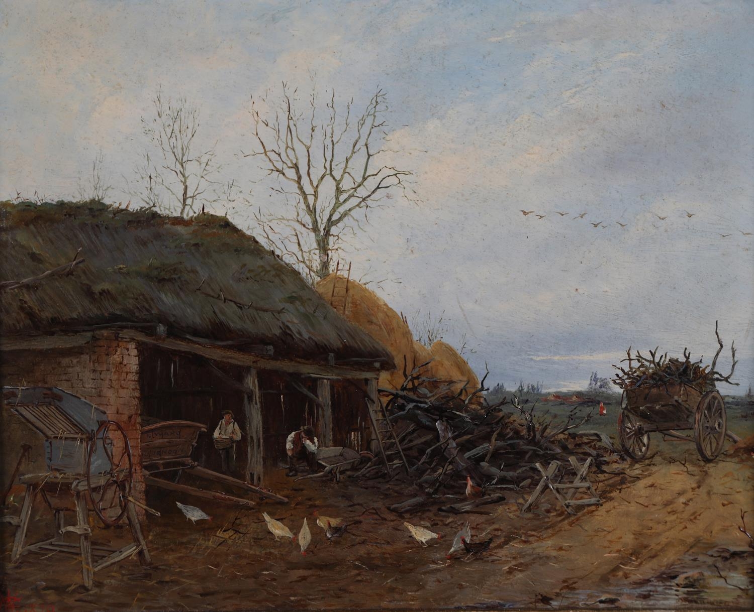 C WARD, Woodsmen working in a cartshed, oil on panel, signed to cart boards and initialled and dated 1870 in red to lower left
