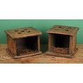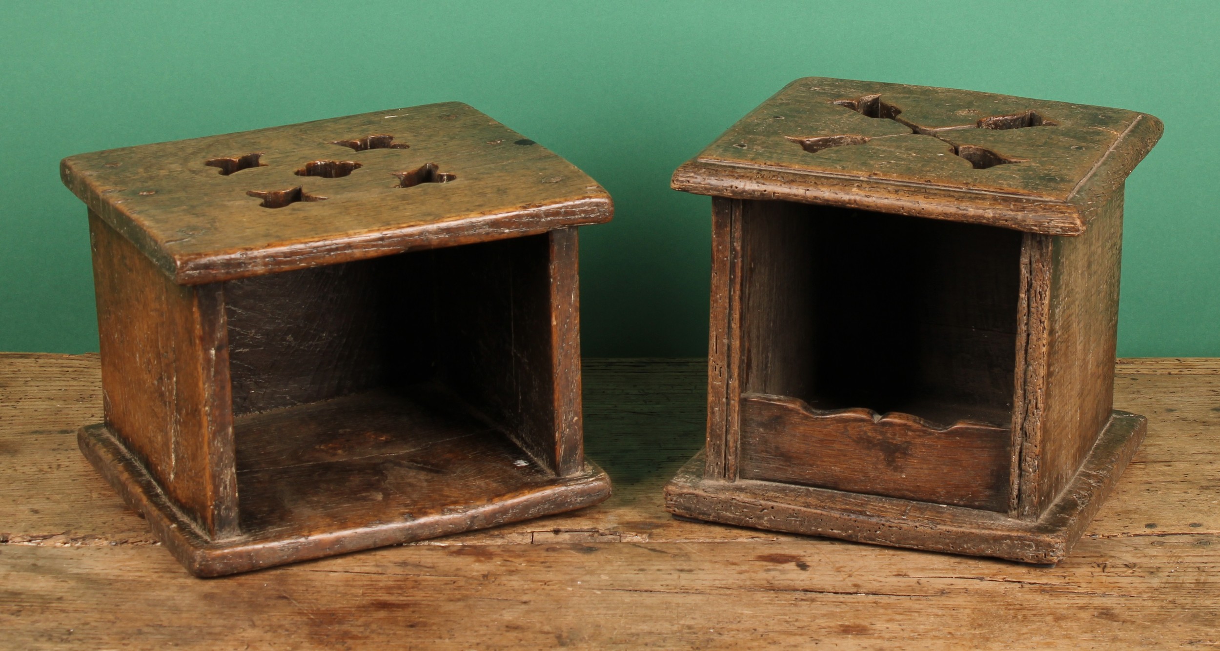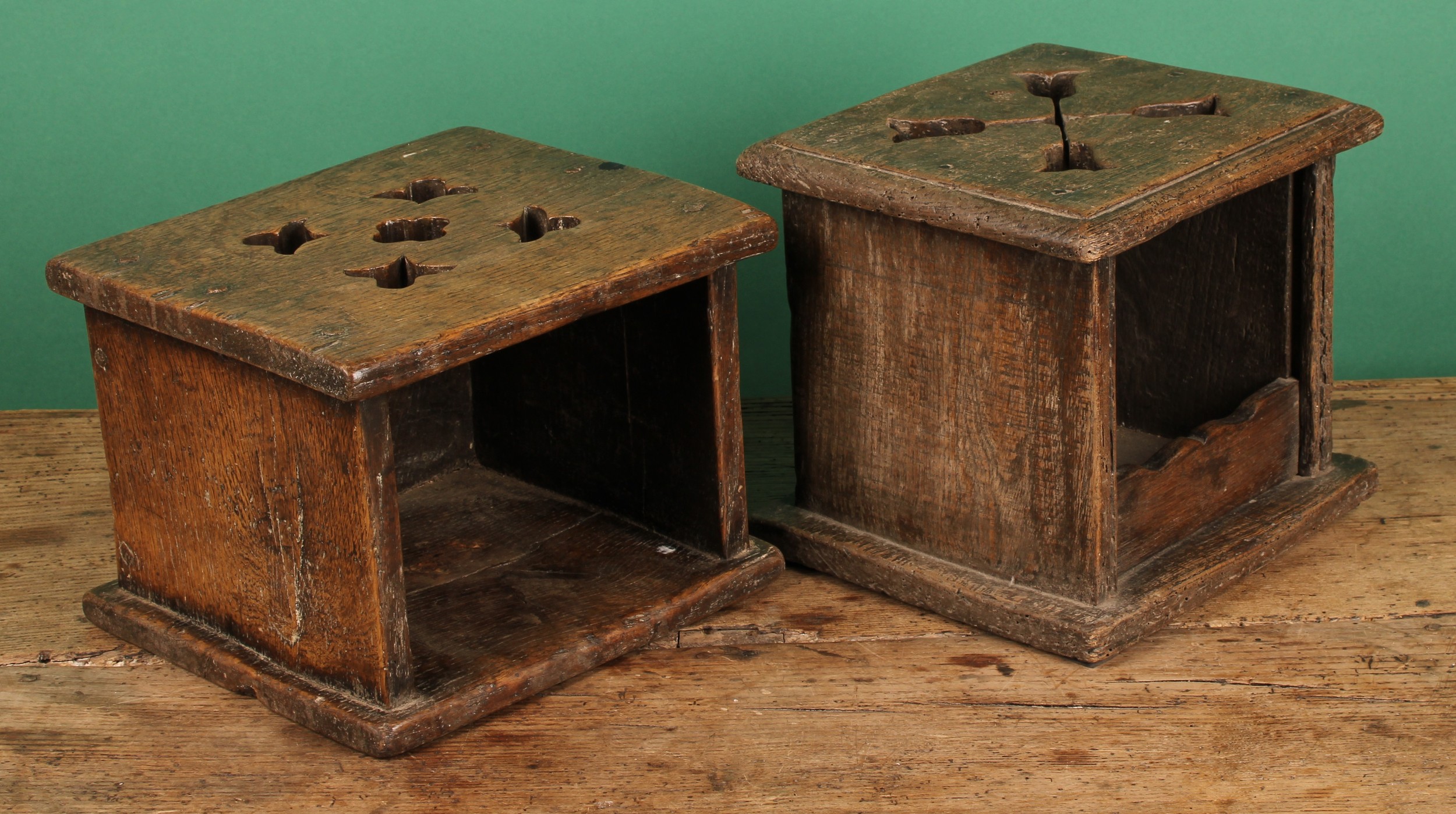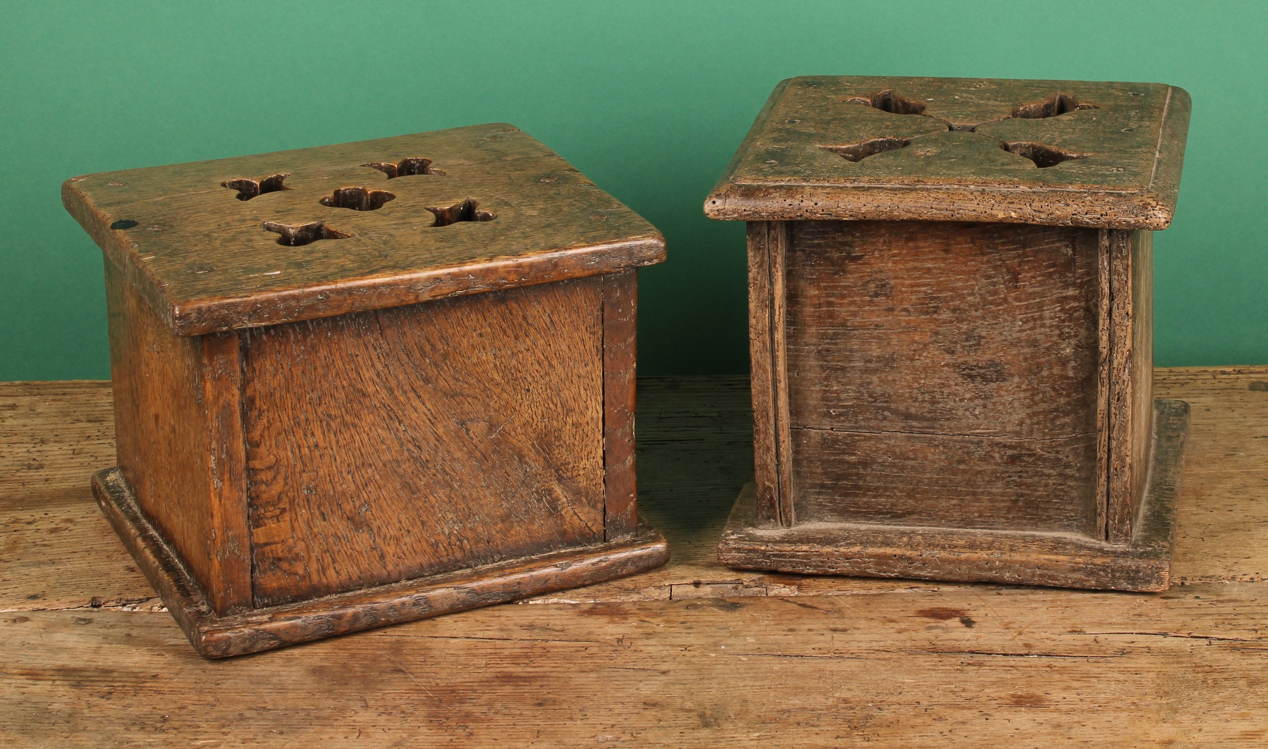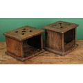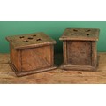 A 19th century Dutch oak carriage foot warmer, the oversailing top pierced with tulips, 23cm high, 26cm wide, 23cm deep; another (2)