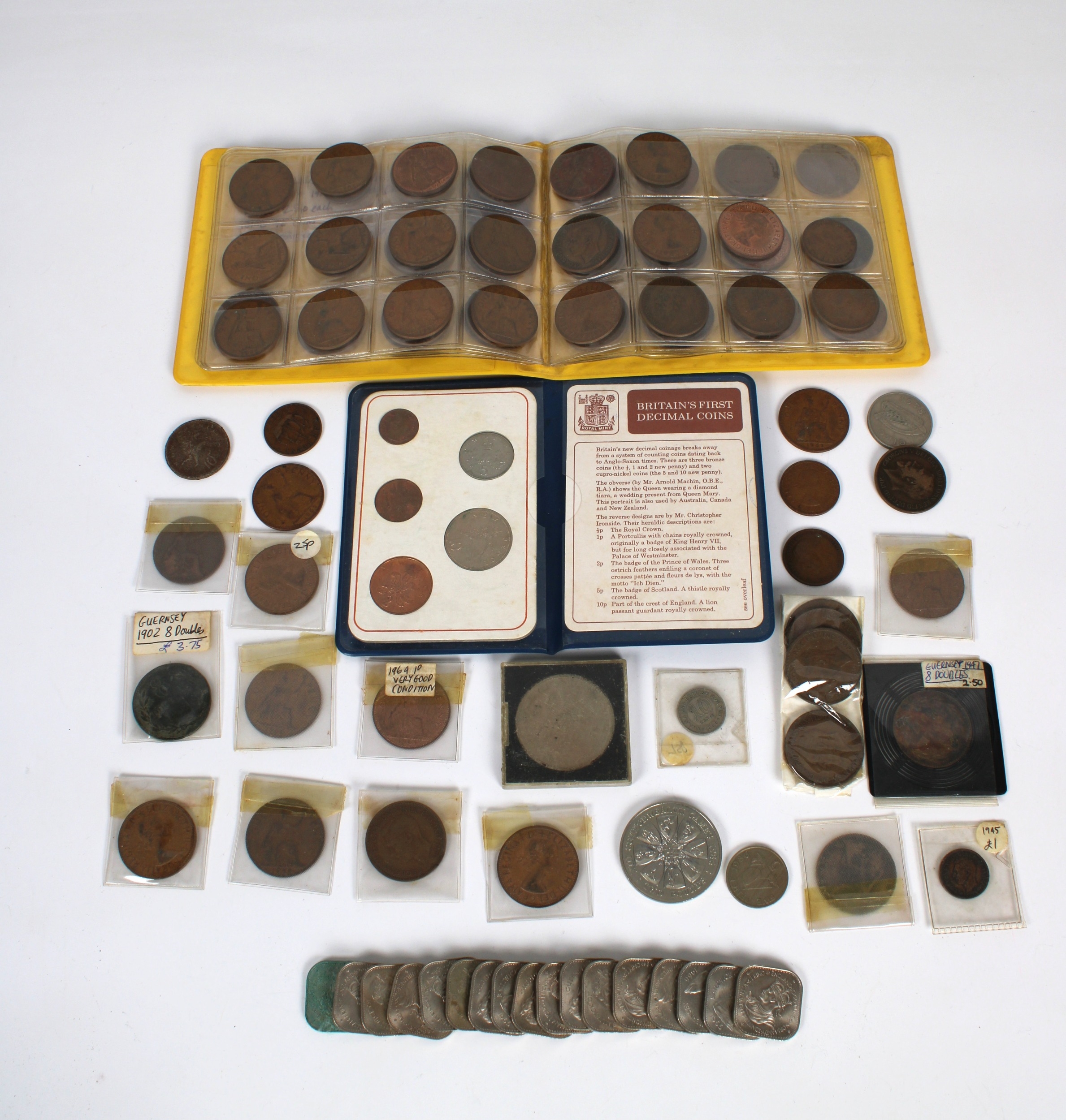 A collection of vintage Guernsey and British coinage to include Guernsey square 10 shillings, Doubles etc. (qty)