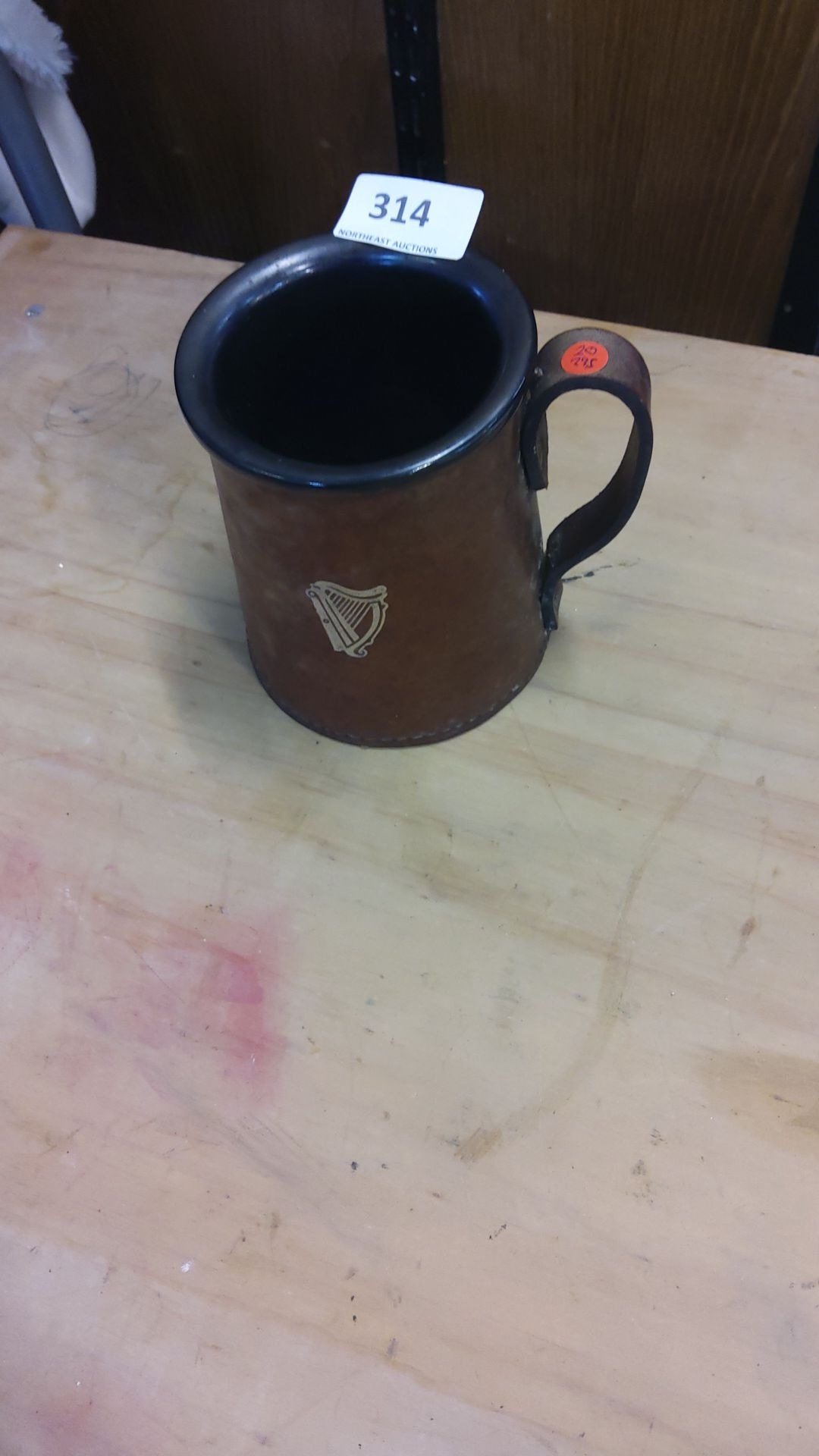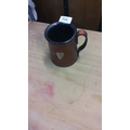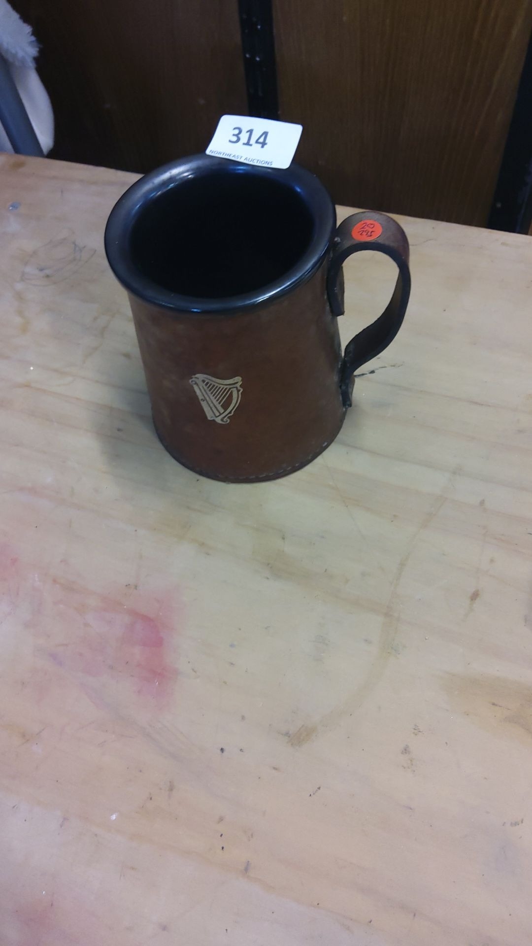 Stoneware Guinness beer mug features a harp emblem, indicative of a traditional design.