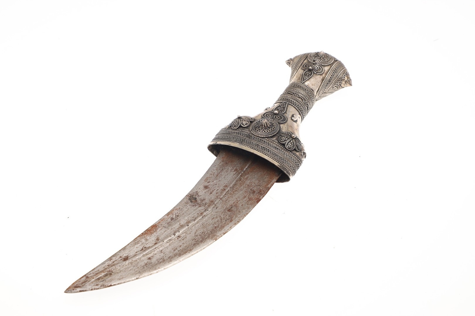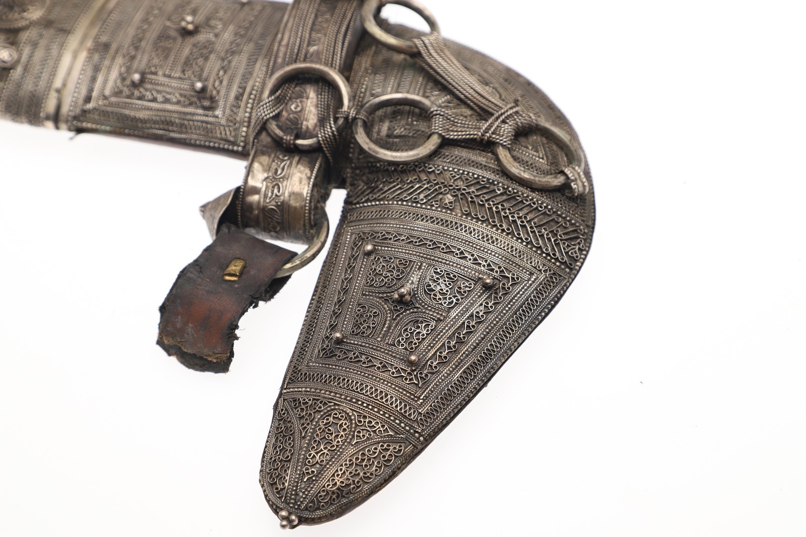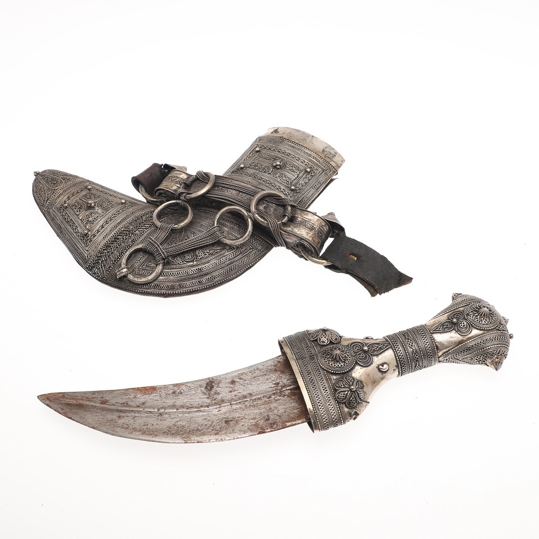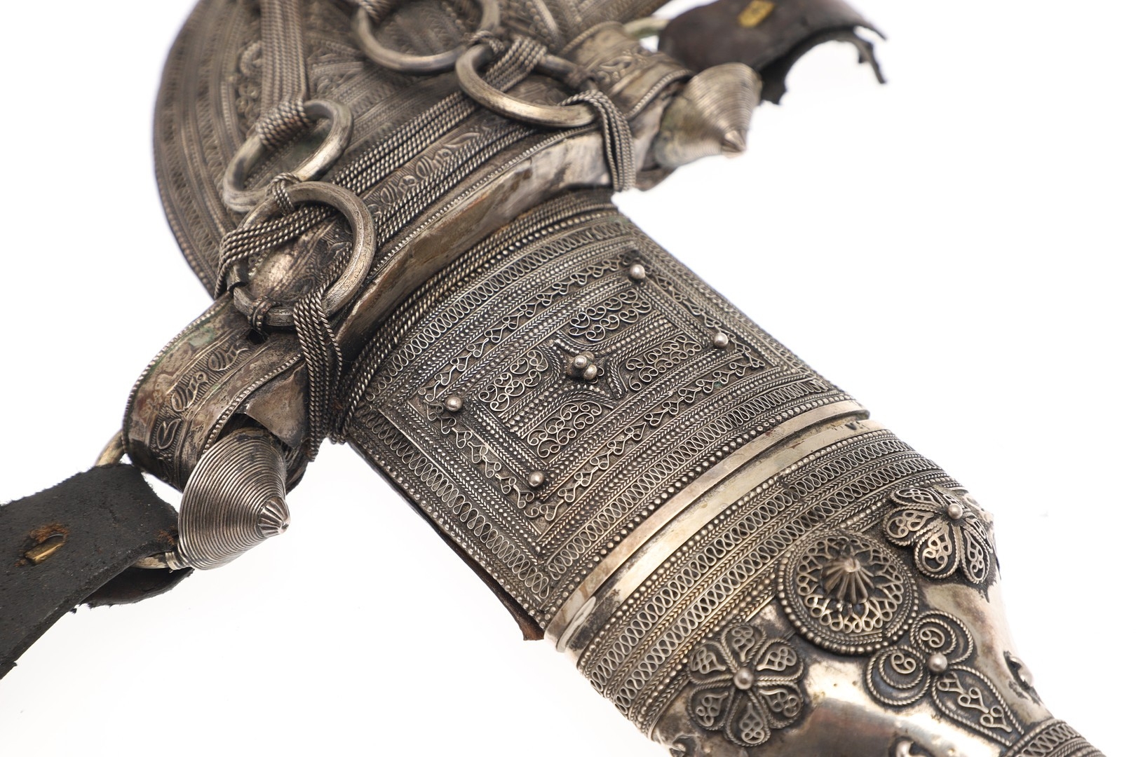 A FINE OMANI KHANJAR DAGGER AND SCABBARD. Having a 15 cm curved blade with central spine, mounted on a decorated hilt in whit- metal with applied wire-work decoration throughout. The scabbard similarly profusely decorated with five ring pattern and cross mount. 30 cm. "The silver used in Oman was often beaten out of silver Maria Theresa Thaler coins, an international currency used throughout the 19th and 20th centuries".