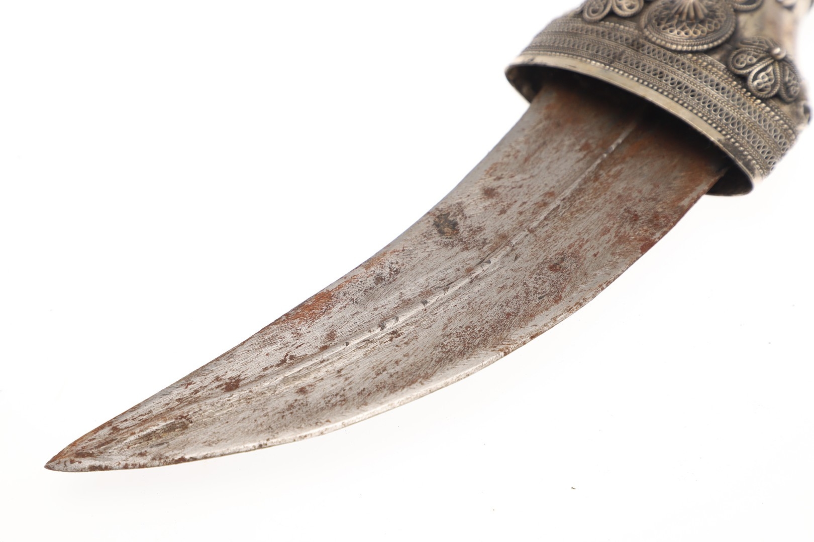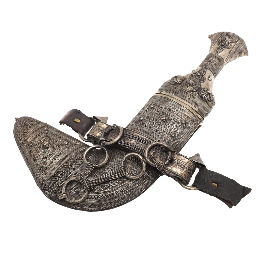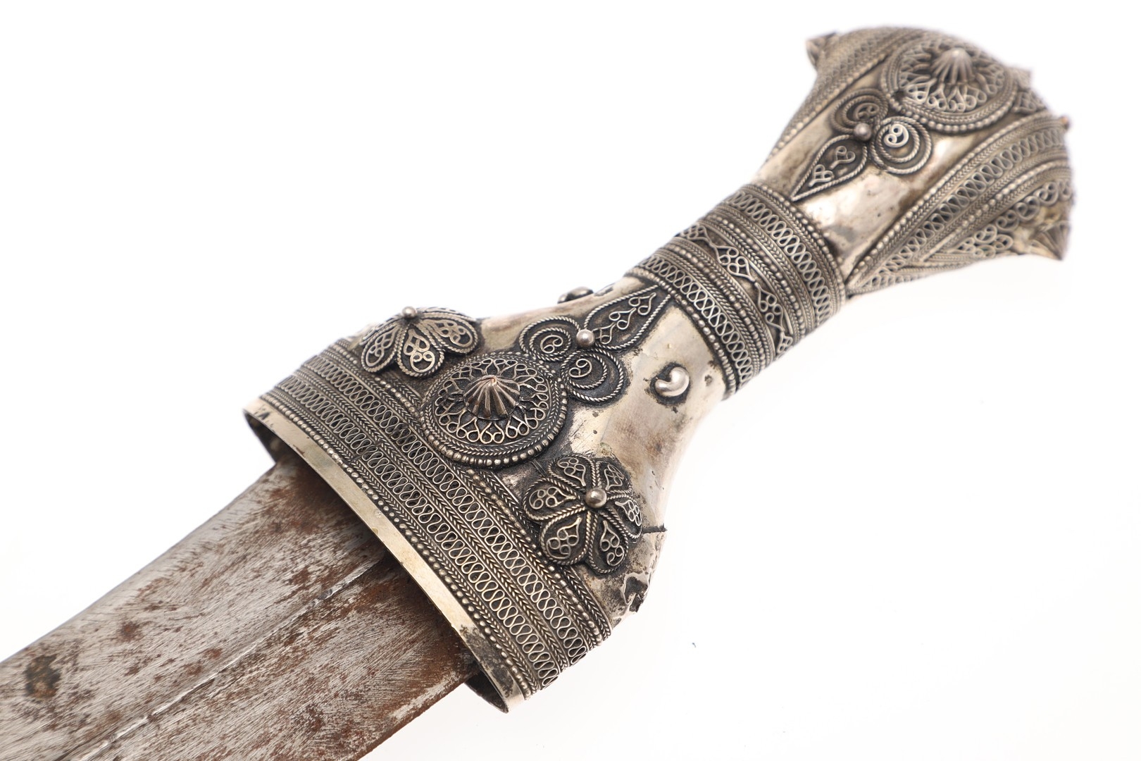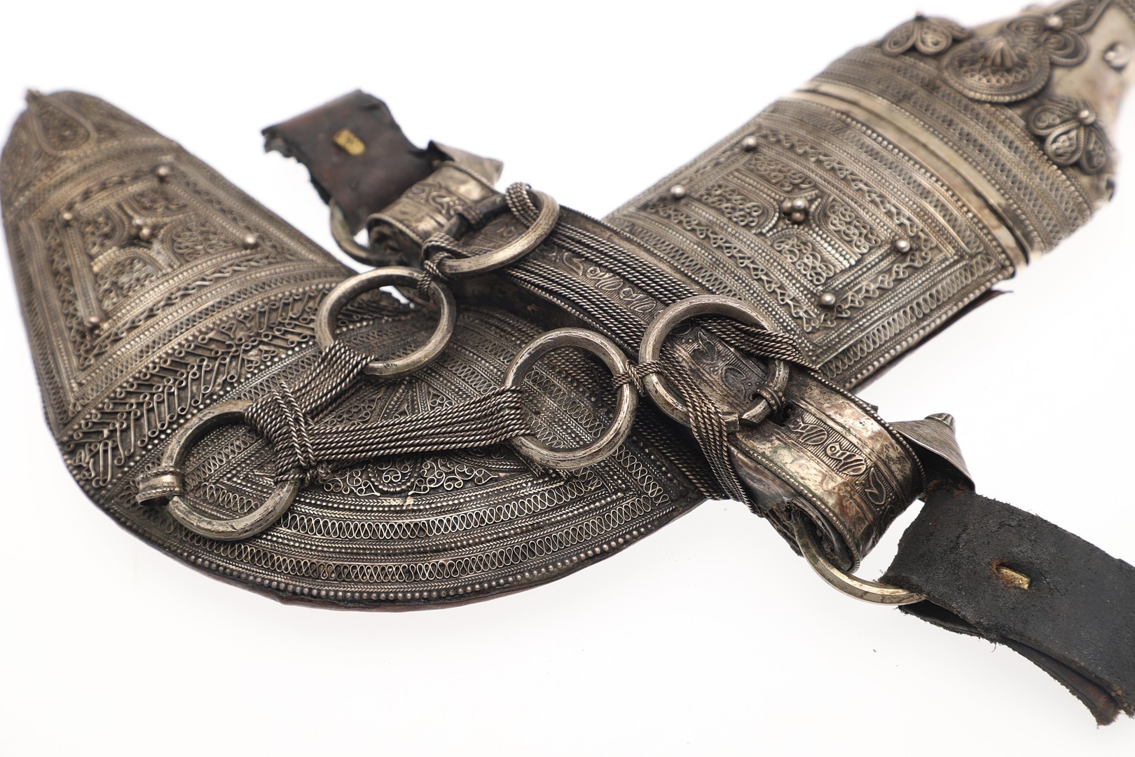 A FINE OMANI KHANJAR DAGGER AND SCABBARD. Having a 15 cm curved blade with central spine, mounted on a decorated hilt in whit- metal with applied wire-work decoration throughout. The scabbard similarly profusely decorated with five ring pattern and cross mount. 30 cm. "The silver used in Oman was often beaten out of silver Maria Theresa Thaler coins, an international currency used throughout the 19th and 20th centuries".