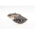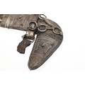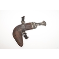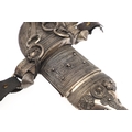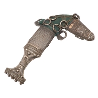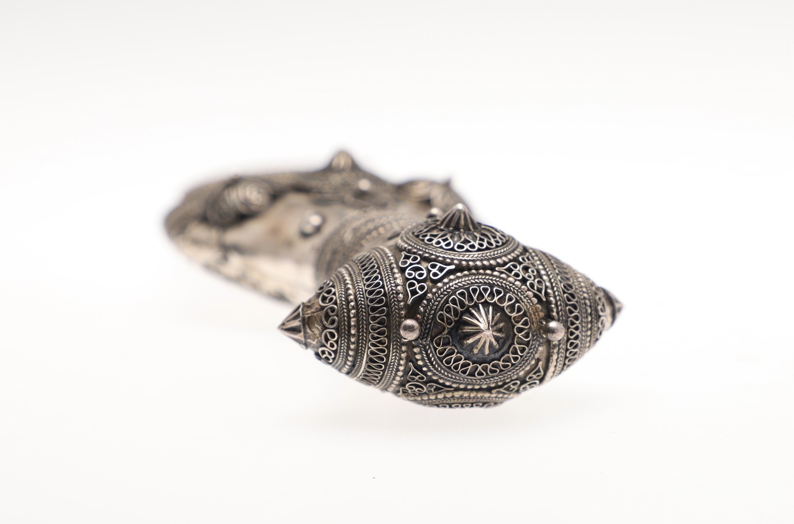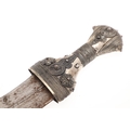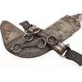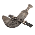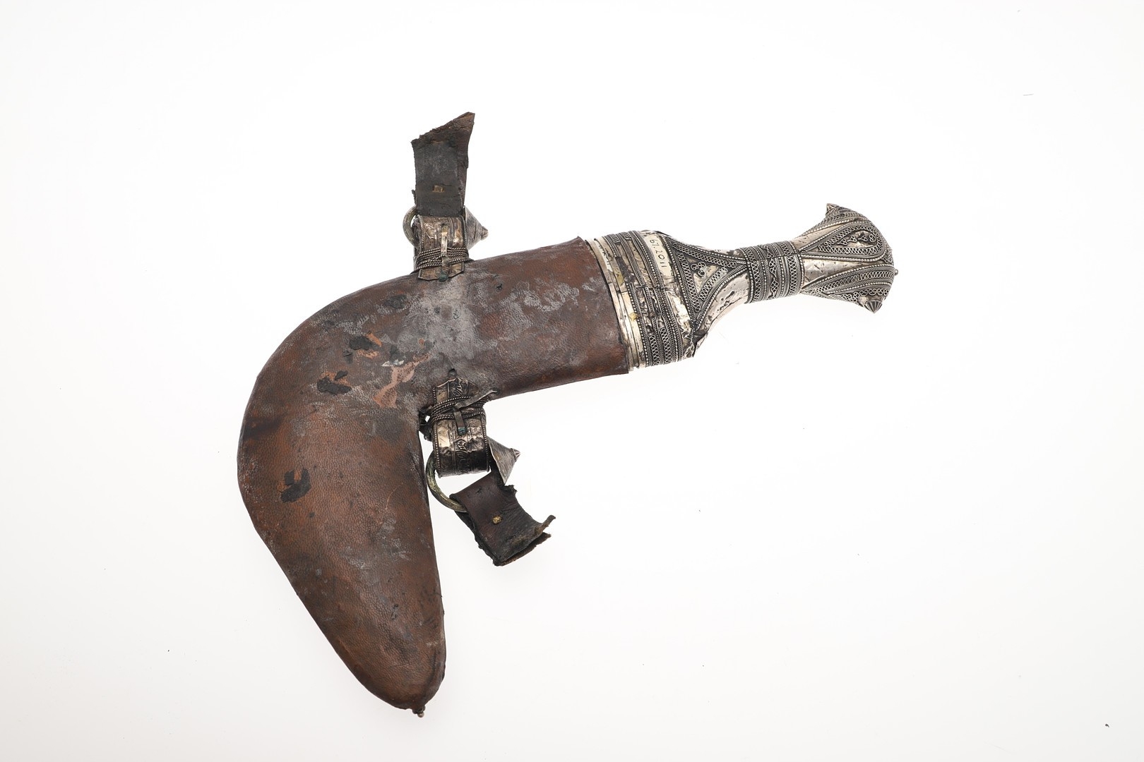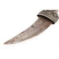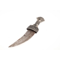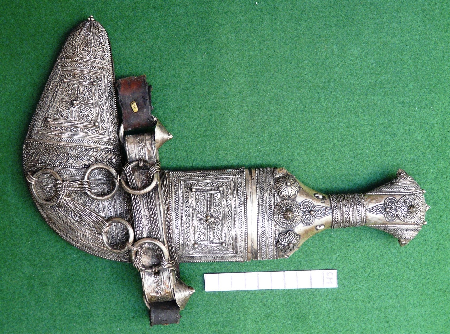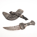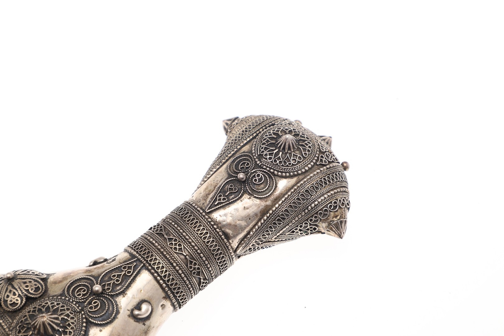 A FINE OMANI KHANJAR DAGGER AND SCABBARD. Having a 15 cm curved blade with central spine, mounted on a decorated hilt in whit- metal with applied wire-work decoration throughout. The scabbard similarly profusely decorated with five ring pattern and cross mount. 30 cm. "The silver used in Oman was often beaten out of silver Maria Theresa Thaler coins, an international currency used throughout the 19th and 20th centuries".