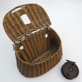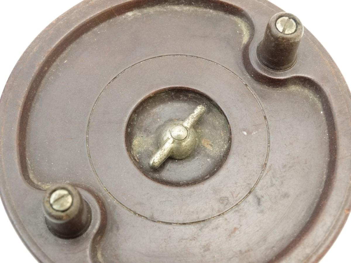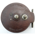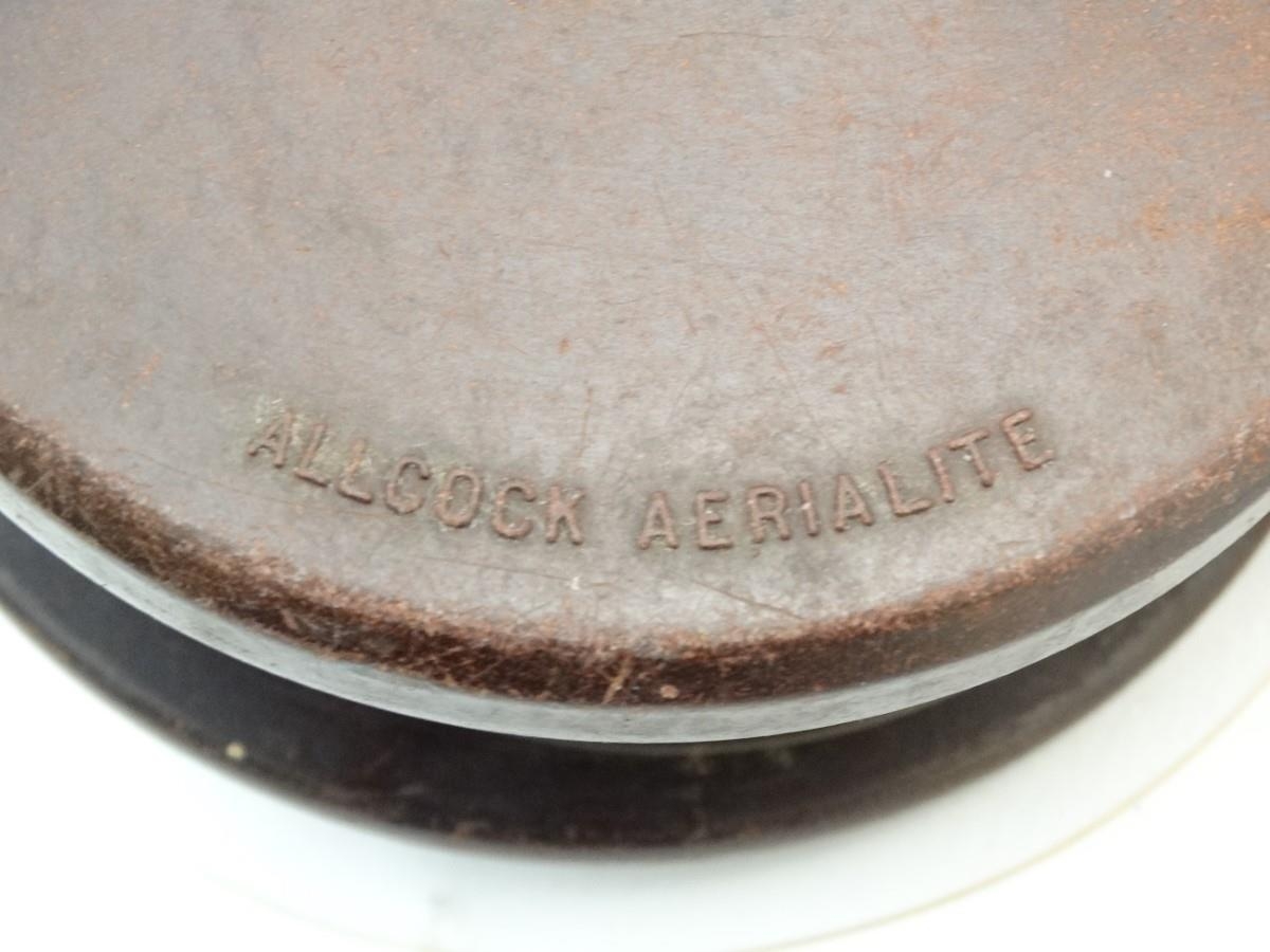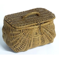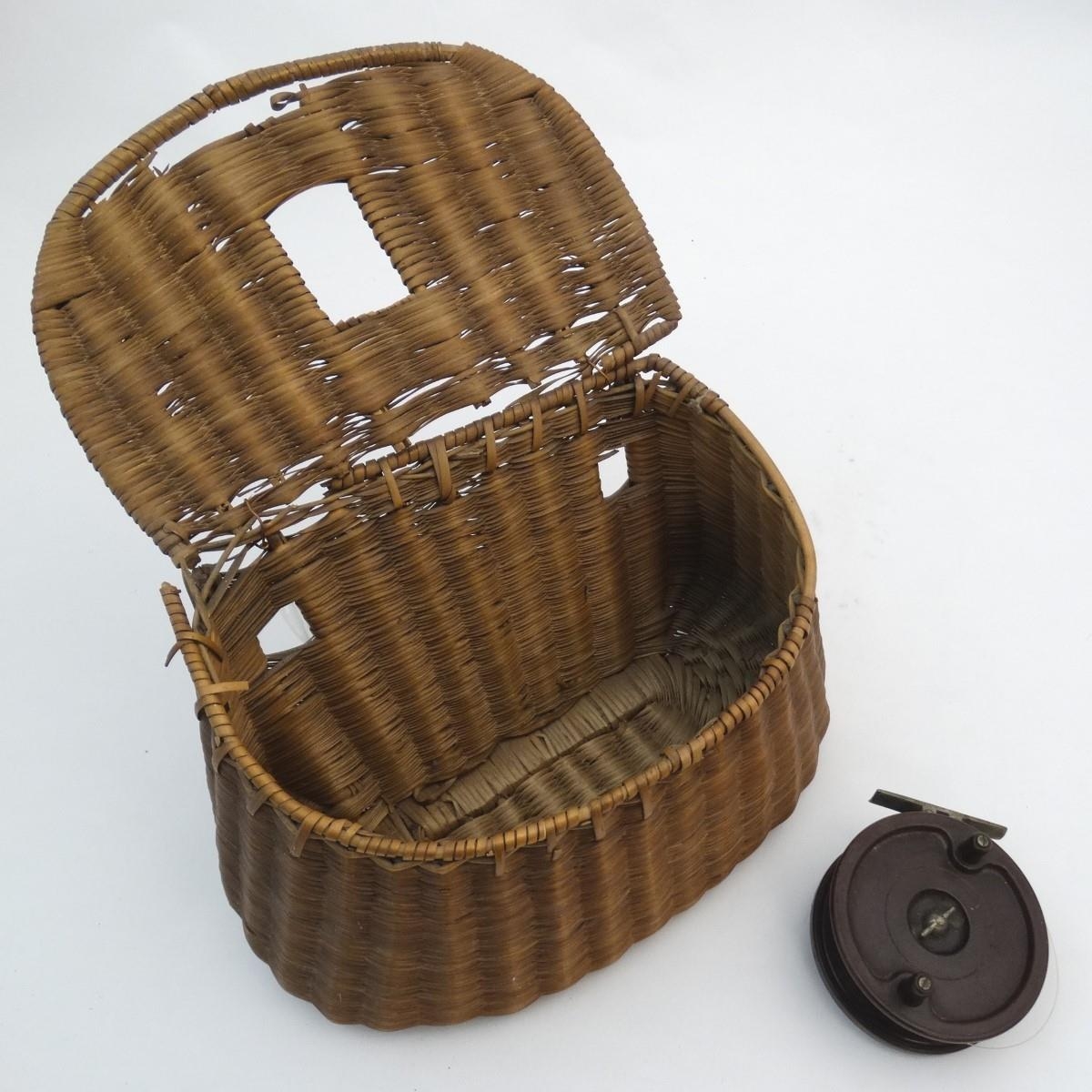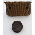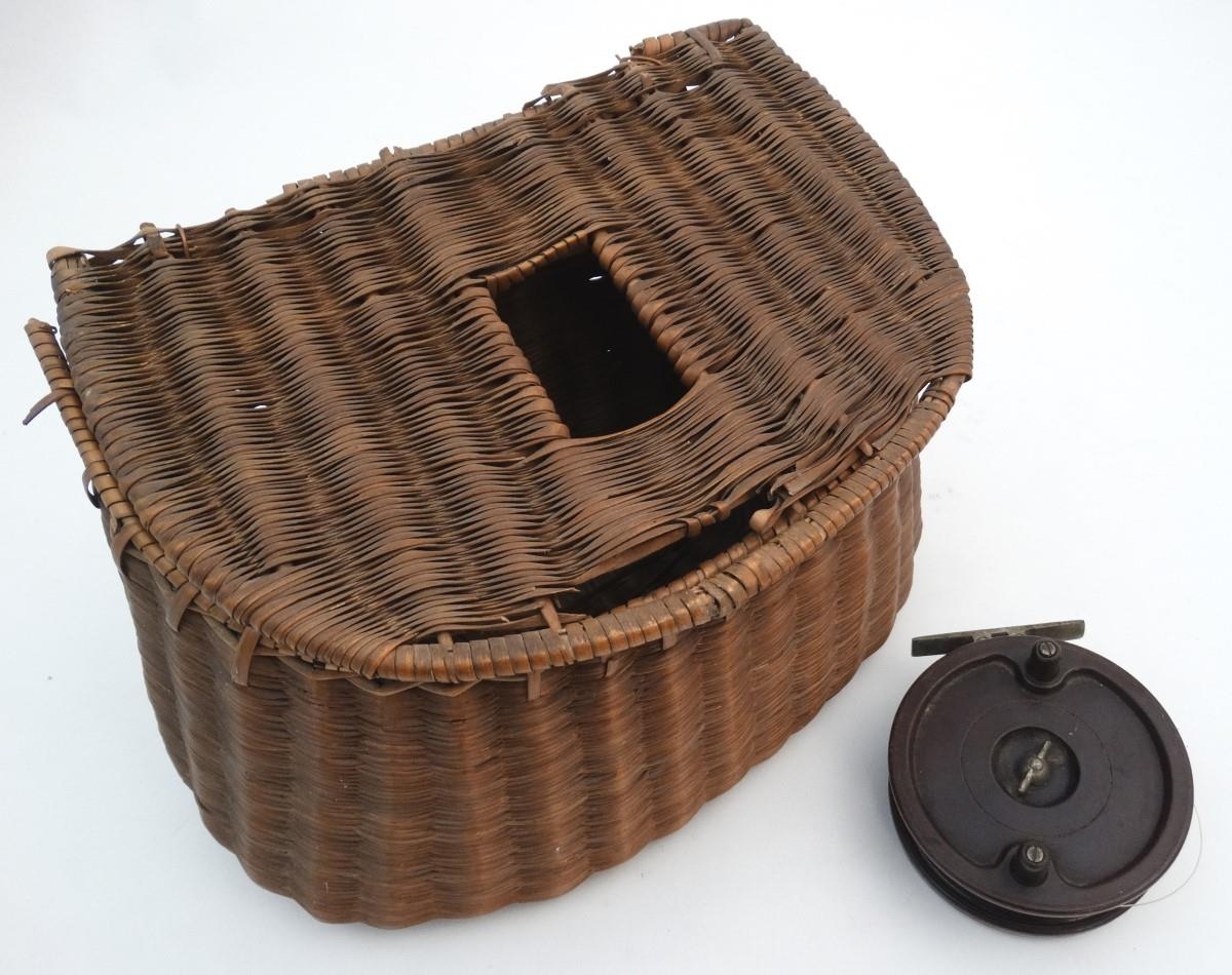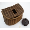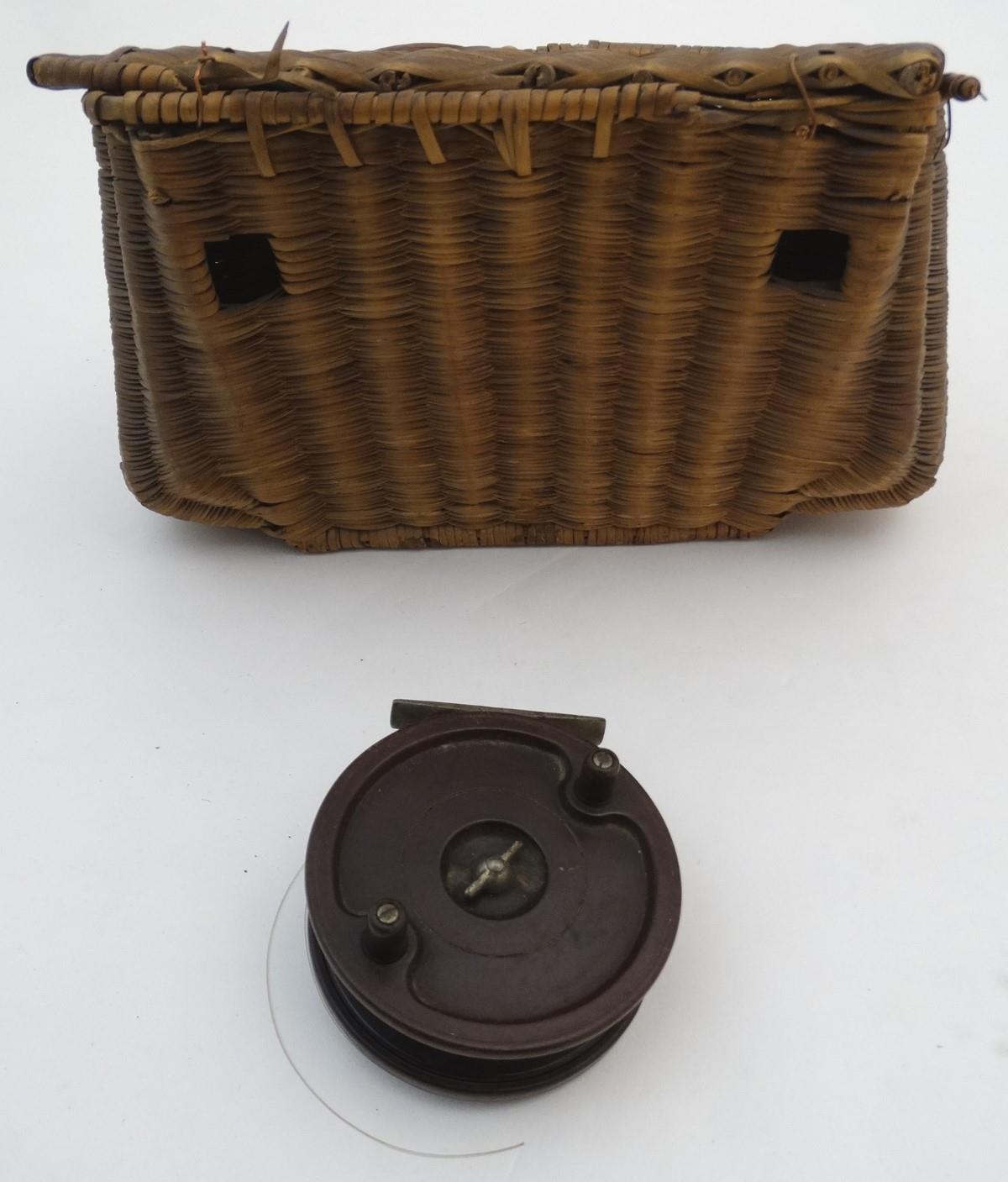 Fishing: an early to mid 20thC woven wicker fishing creel basket, 10 1/2'' wide, 7 1/2'' deep, 7 1/2'' tall, together with an Allcock 'Aerolite' Bakelite centrepin reel, with line wound, 3 3/14'' in diameter