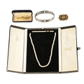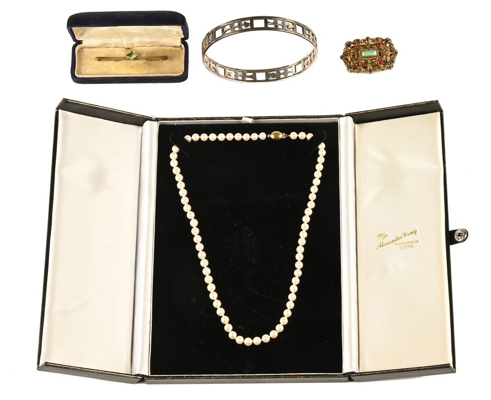 A strap of pearls, with 9 ct gold clasp, length 46 cm, together with a costume jewellery brooch, a silver coloured metal bangle and a bar brooch set with a peridot coloured stone.