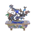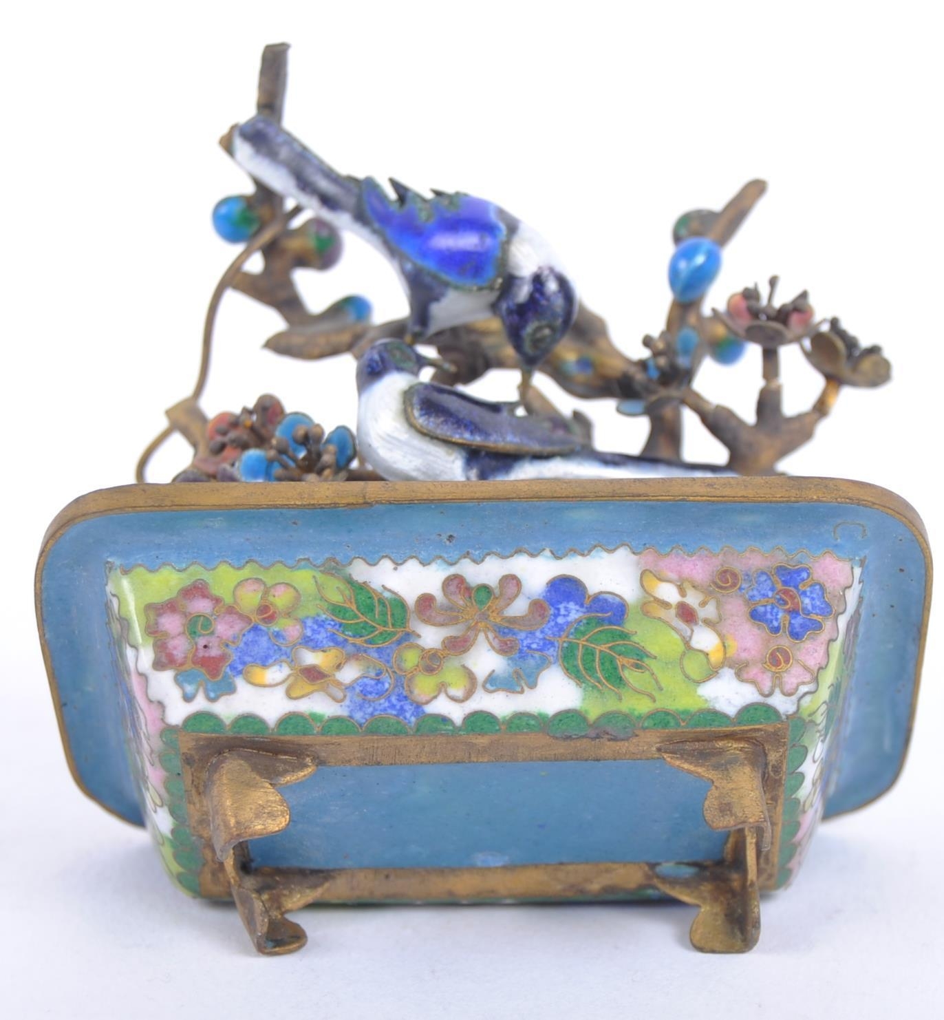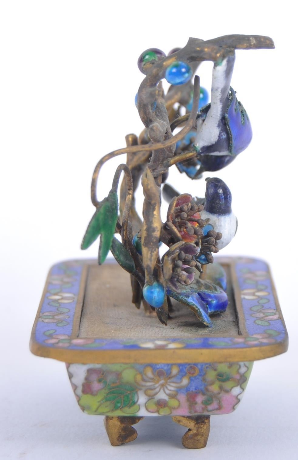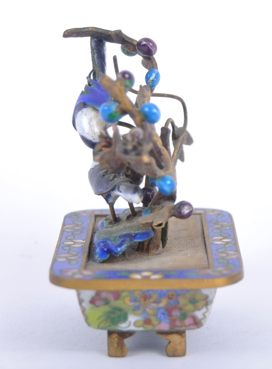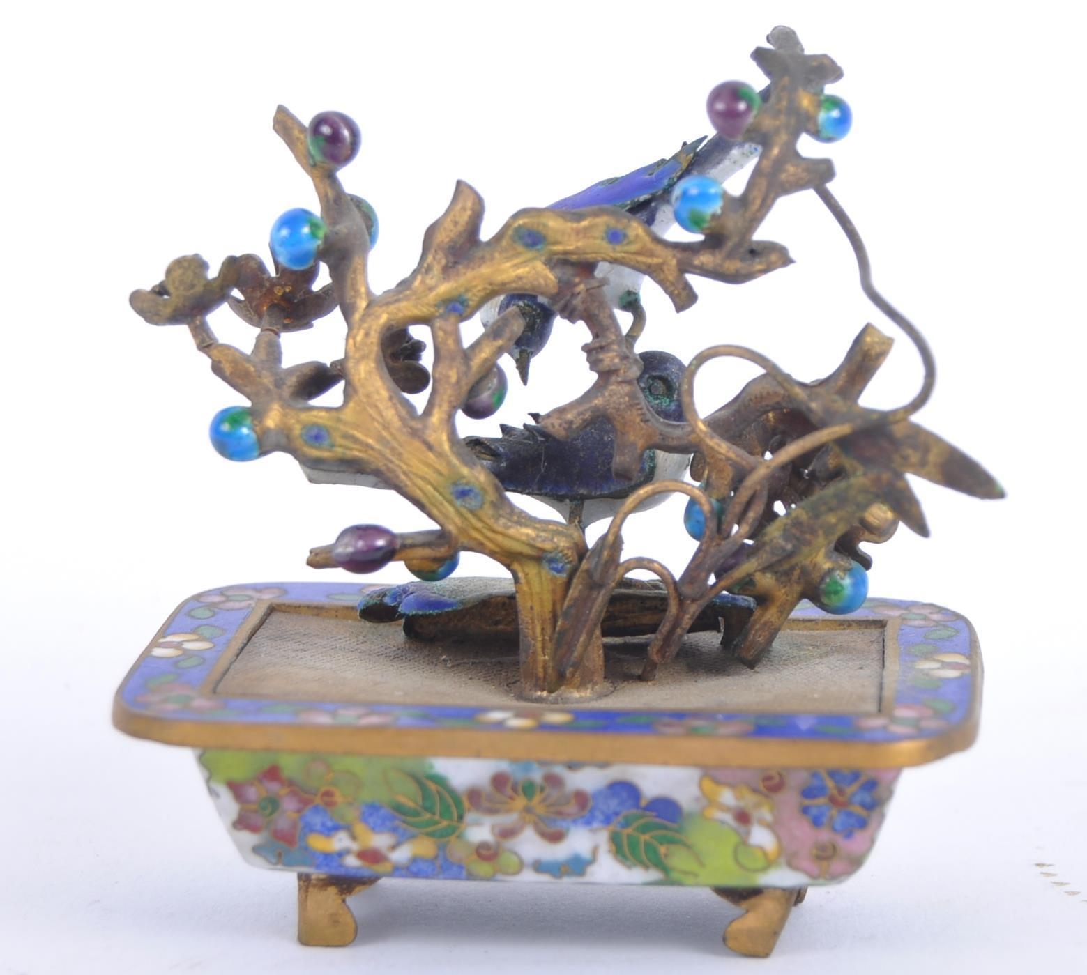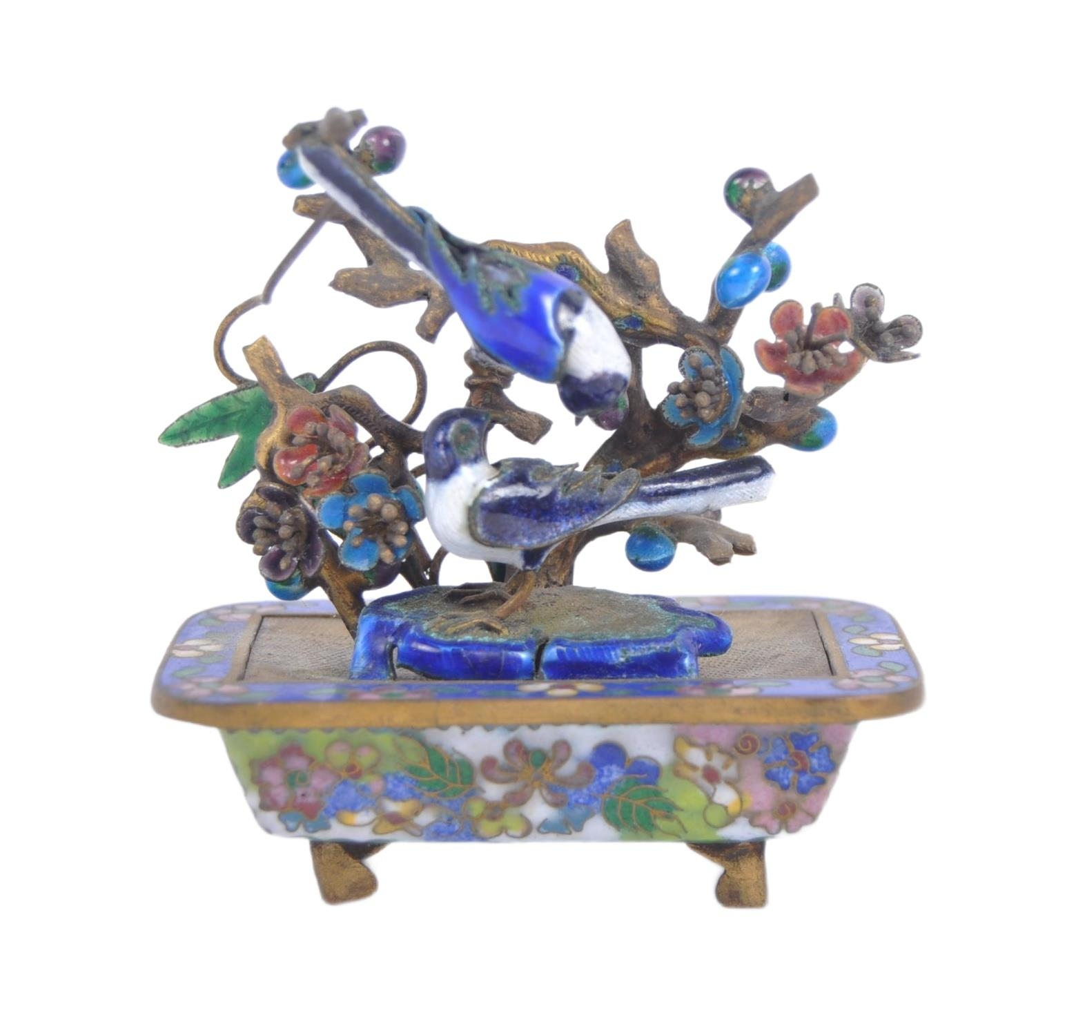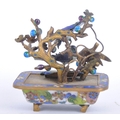 An early 20th Century Chinese Cloisonne and gilt metal bonsai tree. Comprises a small cloisonne jardinière planter with gilt metal tree set with coloured enamel fruit, flowers & birds. Measures approx; 8cm tall.