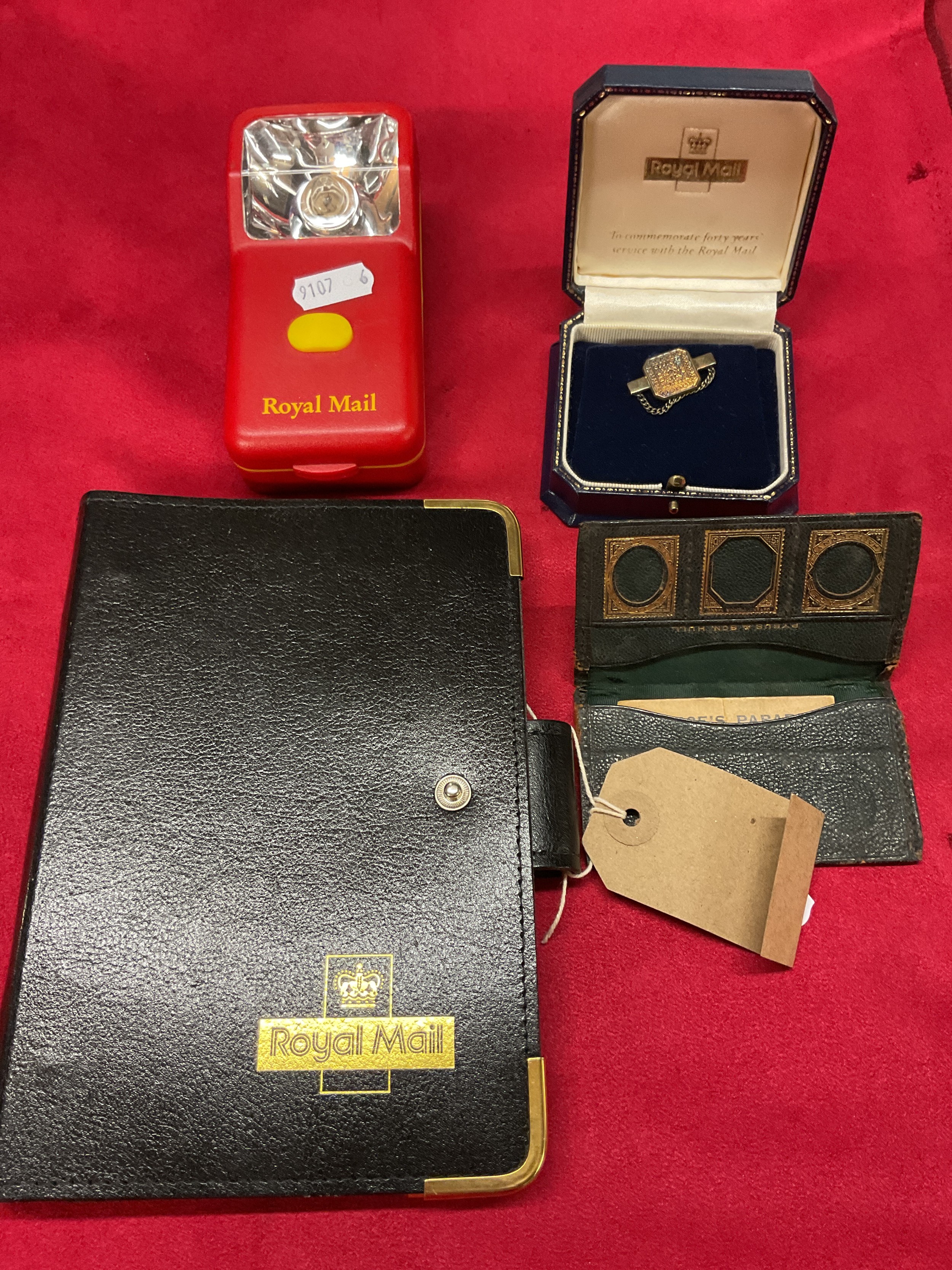 Royal Mail torch, silver 40 year service tie pin and Filofax