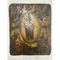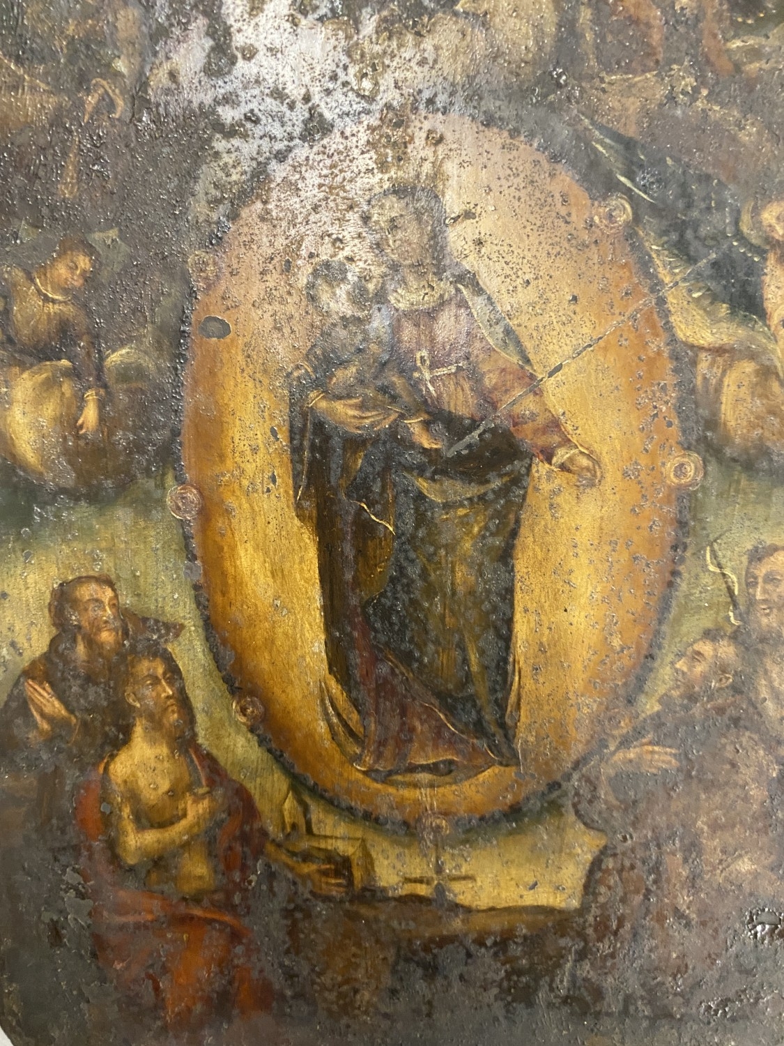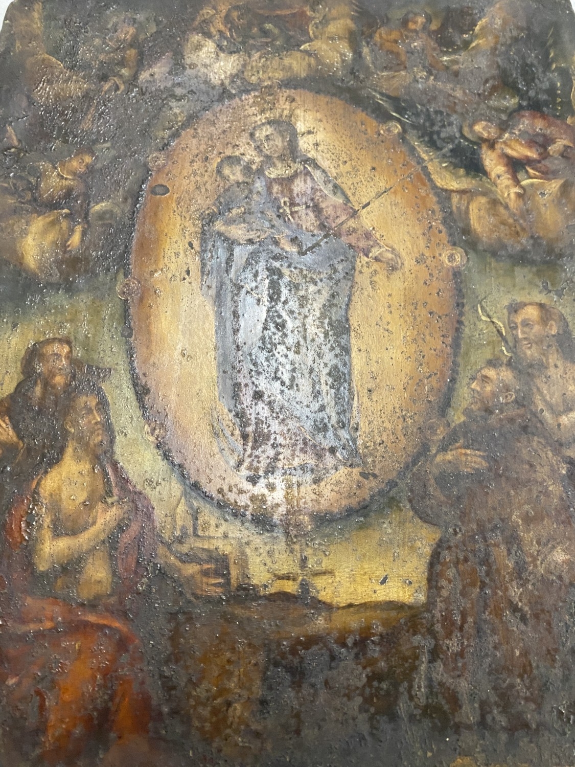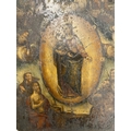 AN ANTIQUE OIL PAINTING OF THE VIRGIN MARY ON TIN, 27CM X 22CM