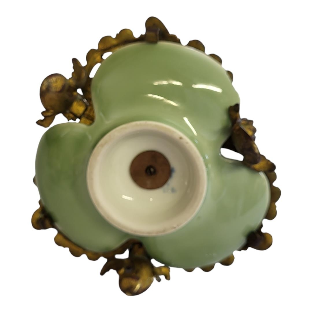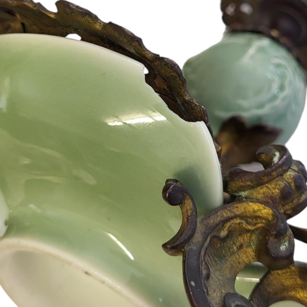 In transitional Wucai manner, celadon and ormolu mounted table candlestick, moulded in French Rococo style with scrolling motifs, half visible blue underglaze mark to base.