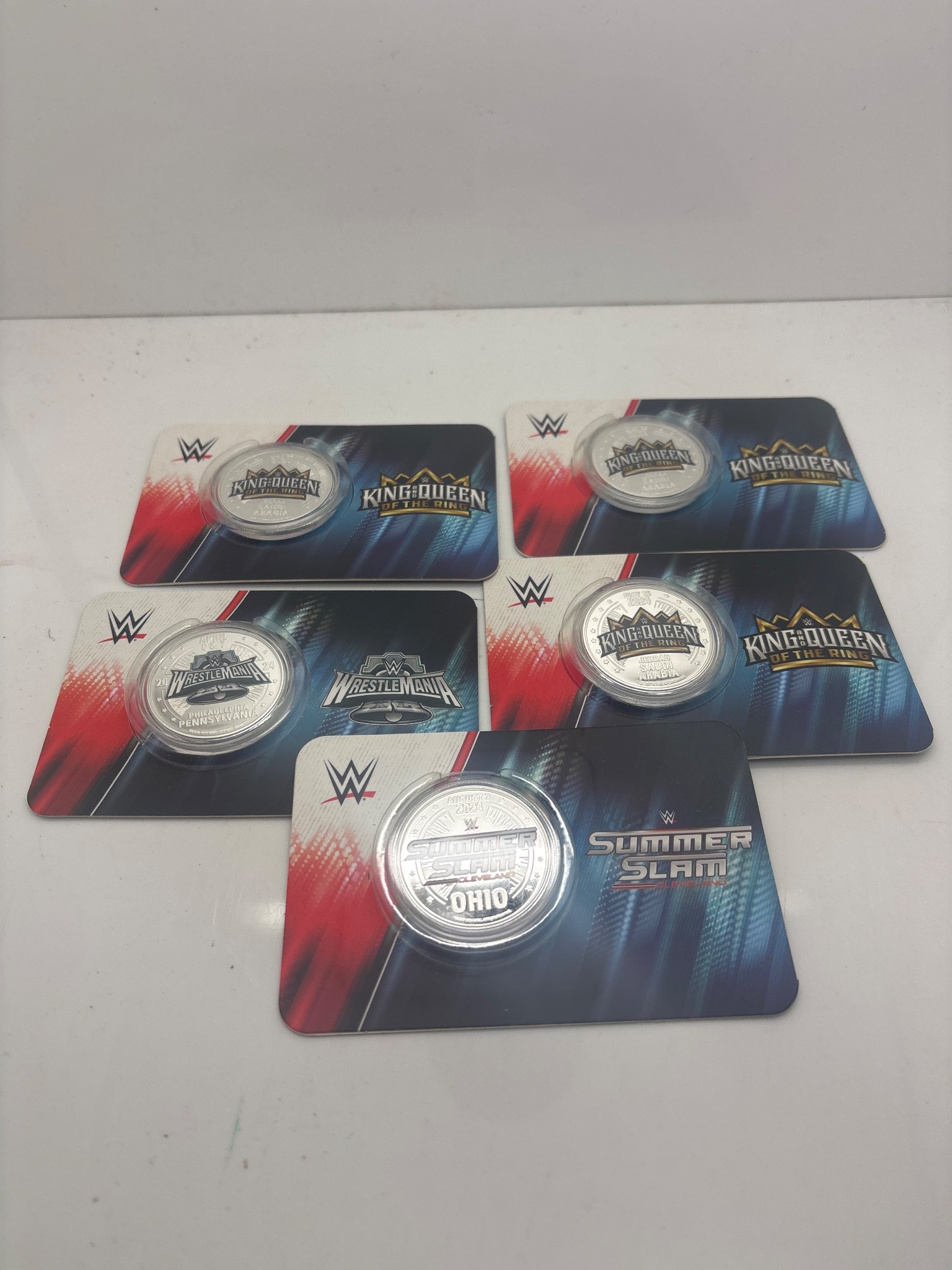Five WWE commemorative coins featuring King and Queen of the Ring, Summerslam, and other themes, presented in themed packaging.