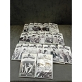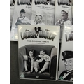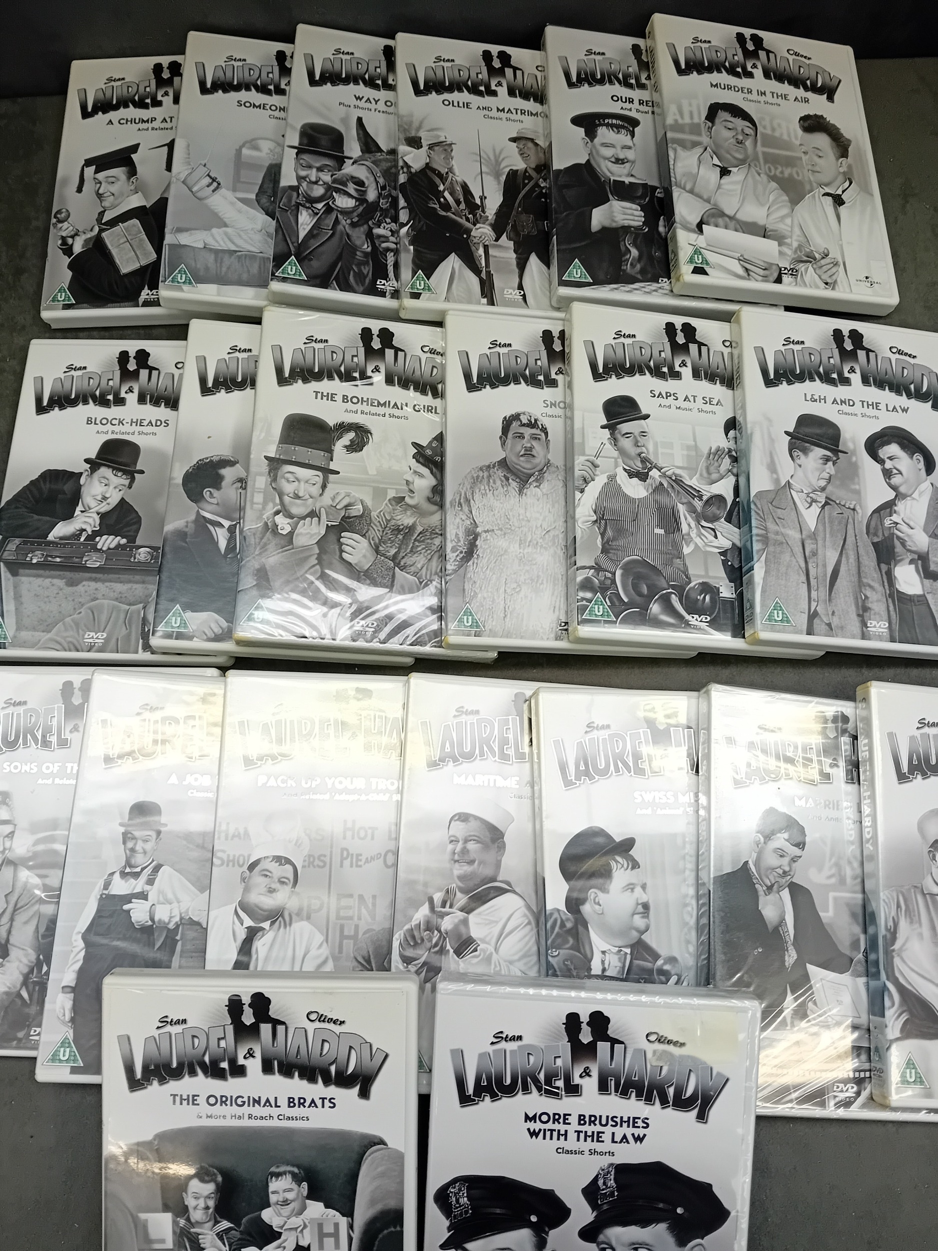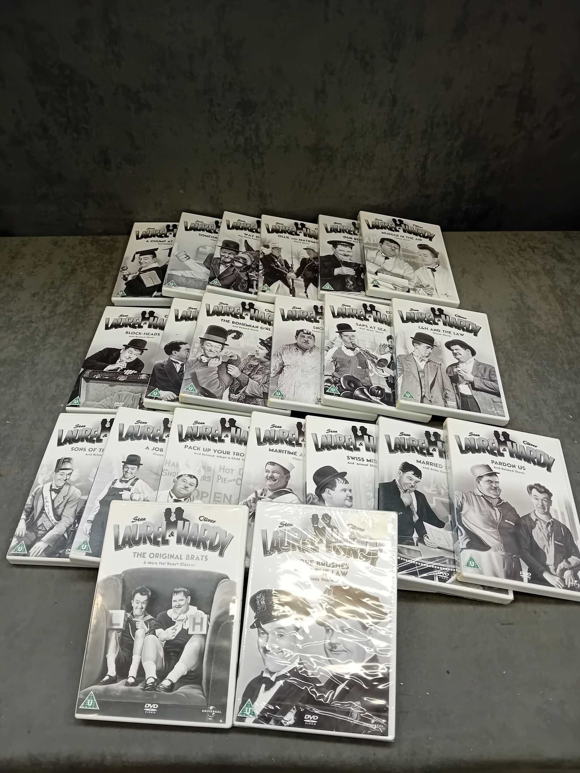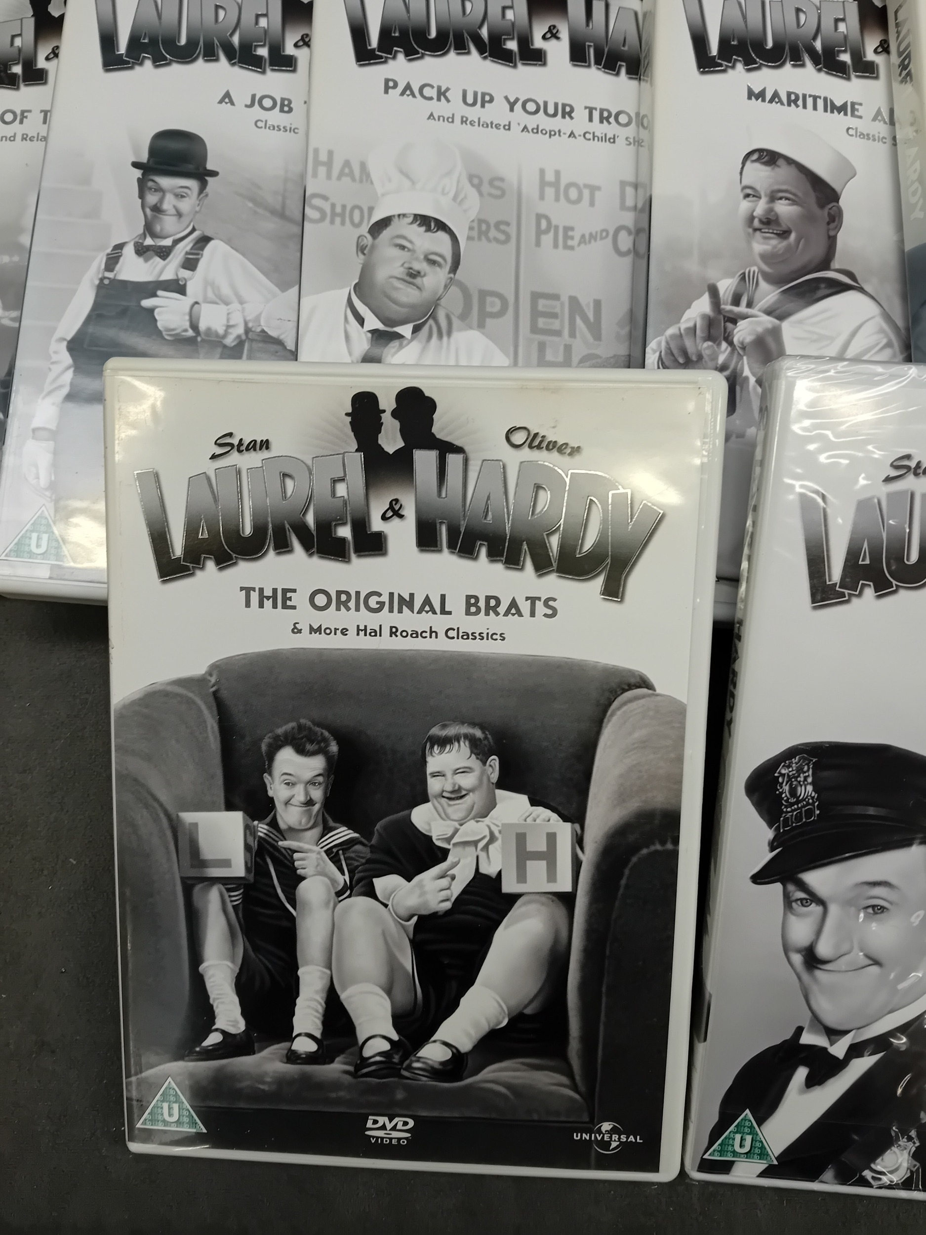 A collection of 21 Laurel & Hardy DVDs, presented in standard plastic cases with photographic paper inserts, primarily depicting the comedic duo in black and white stills from their classic film era. Visible titles include "The Original Brats, " "A Chump at Oxford, " "Sons of the Desert, " "Block-Heads, " "Way Out West, " "Our Relations, " "Murder in the Air, " "Saps at Sea, " "L&H and The Law, " "The Bohemian Girl, " "More Brushes With The Law, " "Pack Up Your Troubles, " and "Maritime Maid." Markings such as "DVD, " "Universal, " "Classic Shorts, " and "U" age ratings are consistently present.