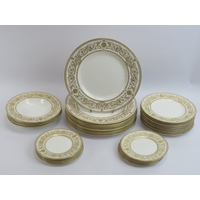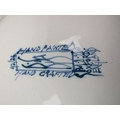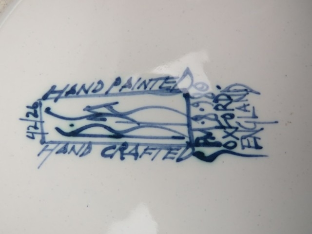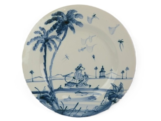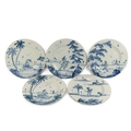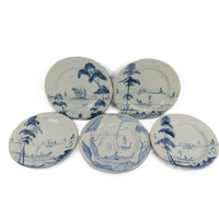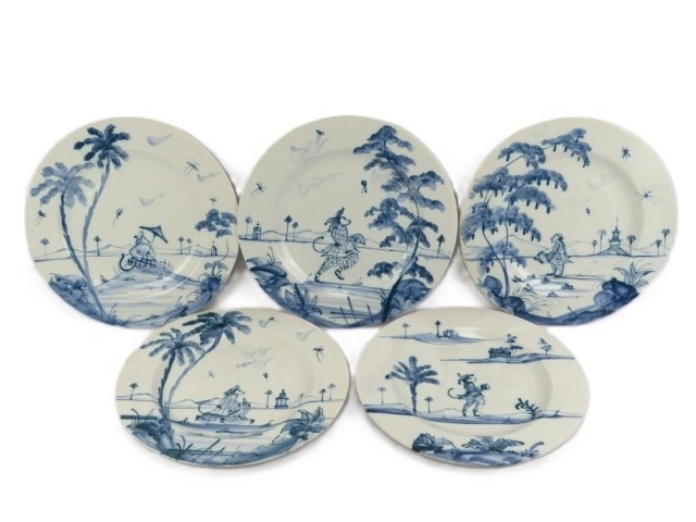 Five Isis Pottery of Oxford blue and white Delft style decorated plates depicting monkeys inspired by 18th century singeries, designed by Deborah Sears, circa 1990’s. (5 items) 28.5 cm diameter.