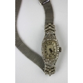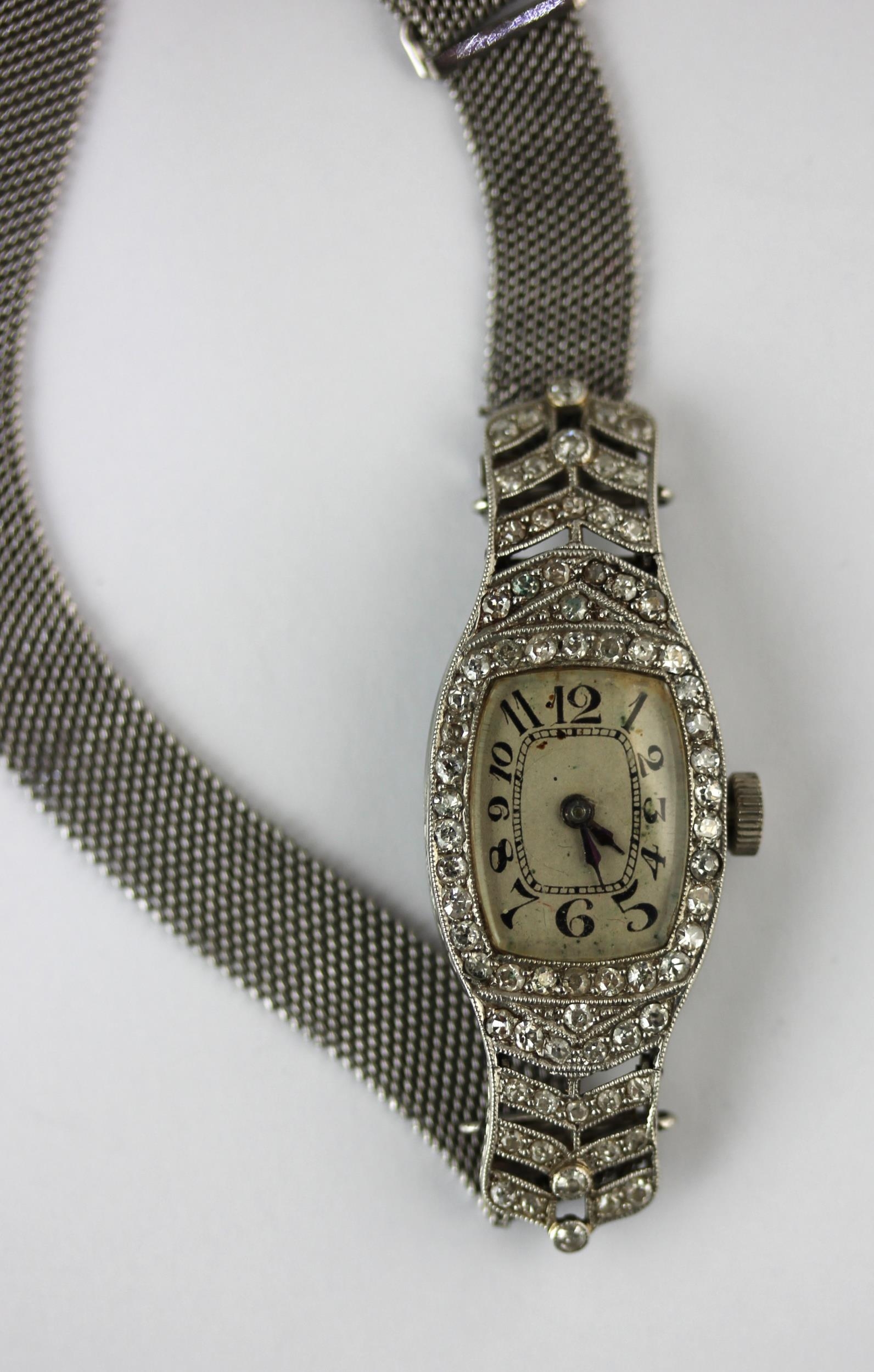 A lady's platinum cased and diamond set dress wristwatch, the Swiss jewelled oval movement detailed 'F. FISCHER', detailed within the case 'ALL PLATINUM', the cased mounted with eight cut diamonds, on a white gold woven mesh link bracelet the clasp detailed '9ct', gross weight 20.6g, with a case
