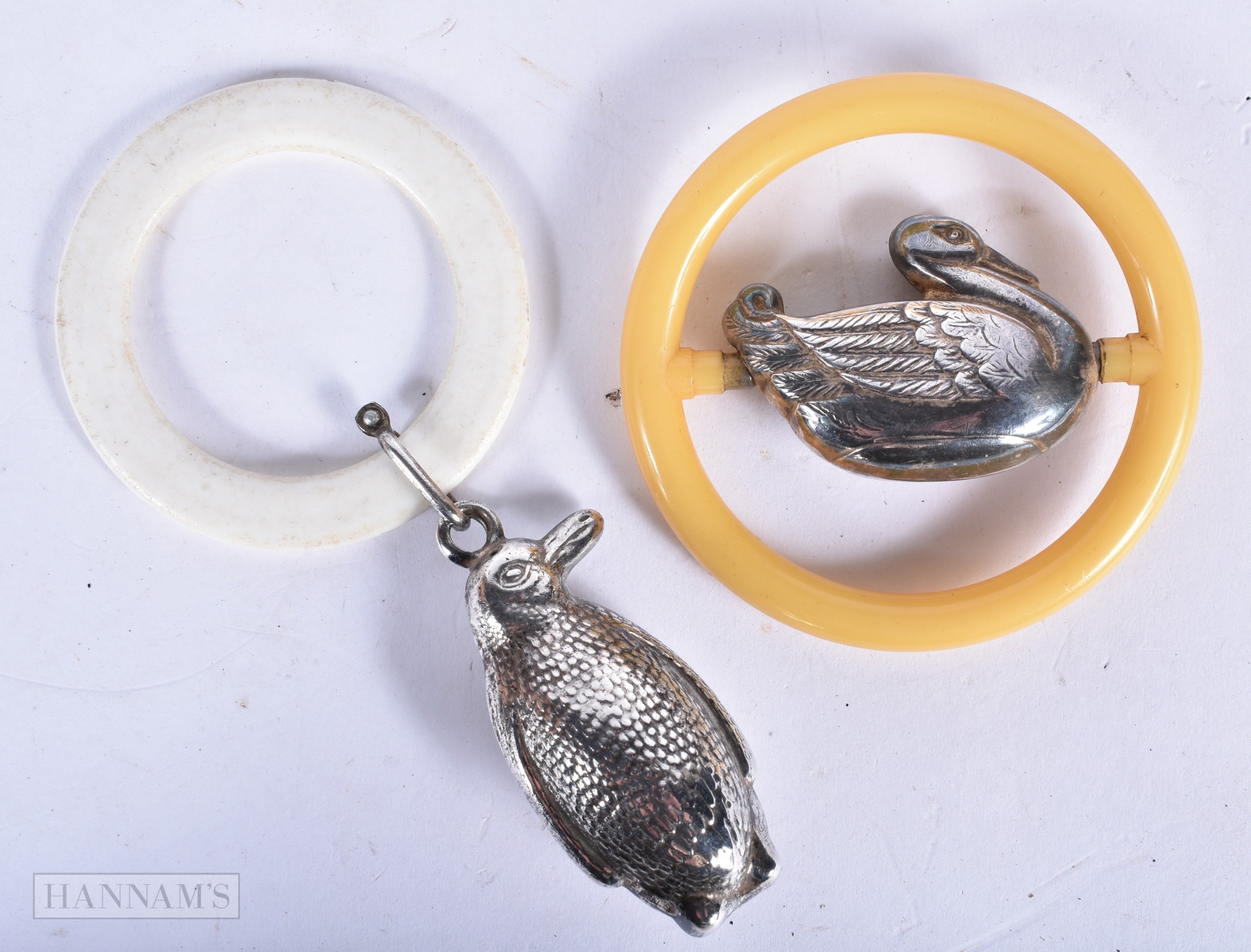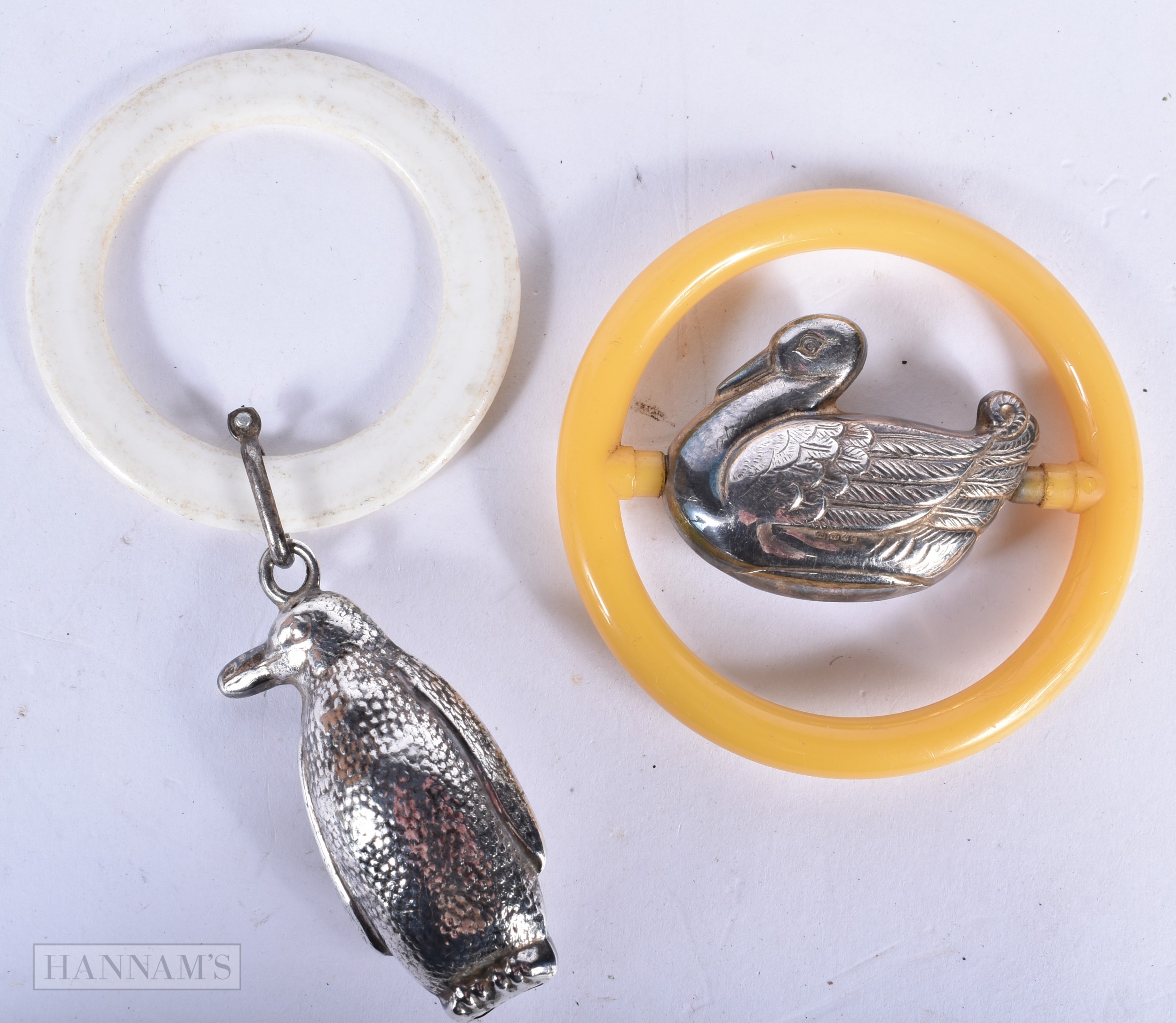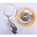 Two antique silver plate babies rattles in the form of a Penguin and a duck 13cm (2).