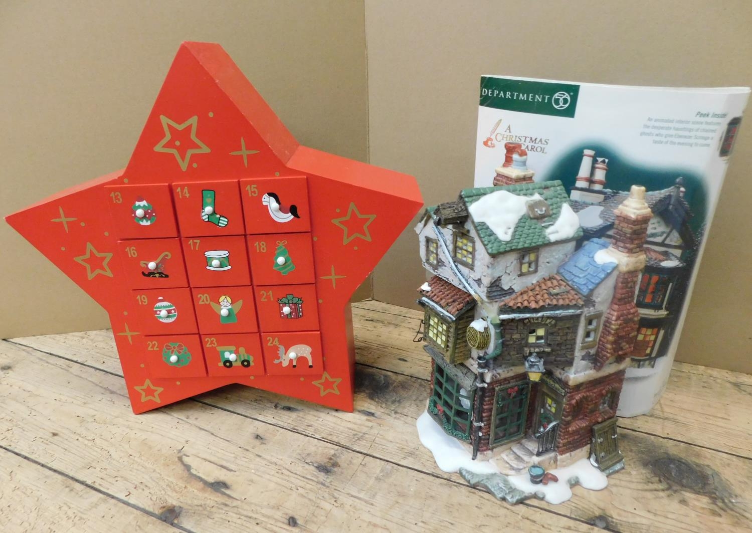Wooden star advent calendar with drawers and Ebeneezer Scrooges house for a candle