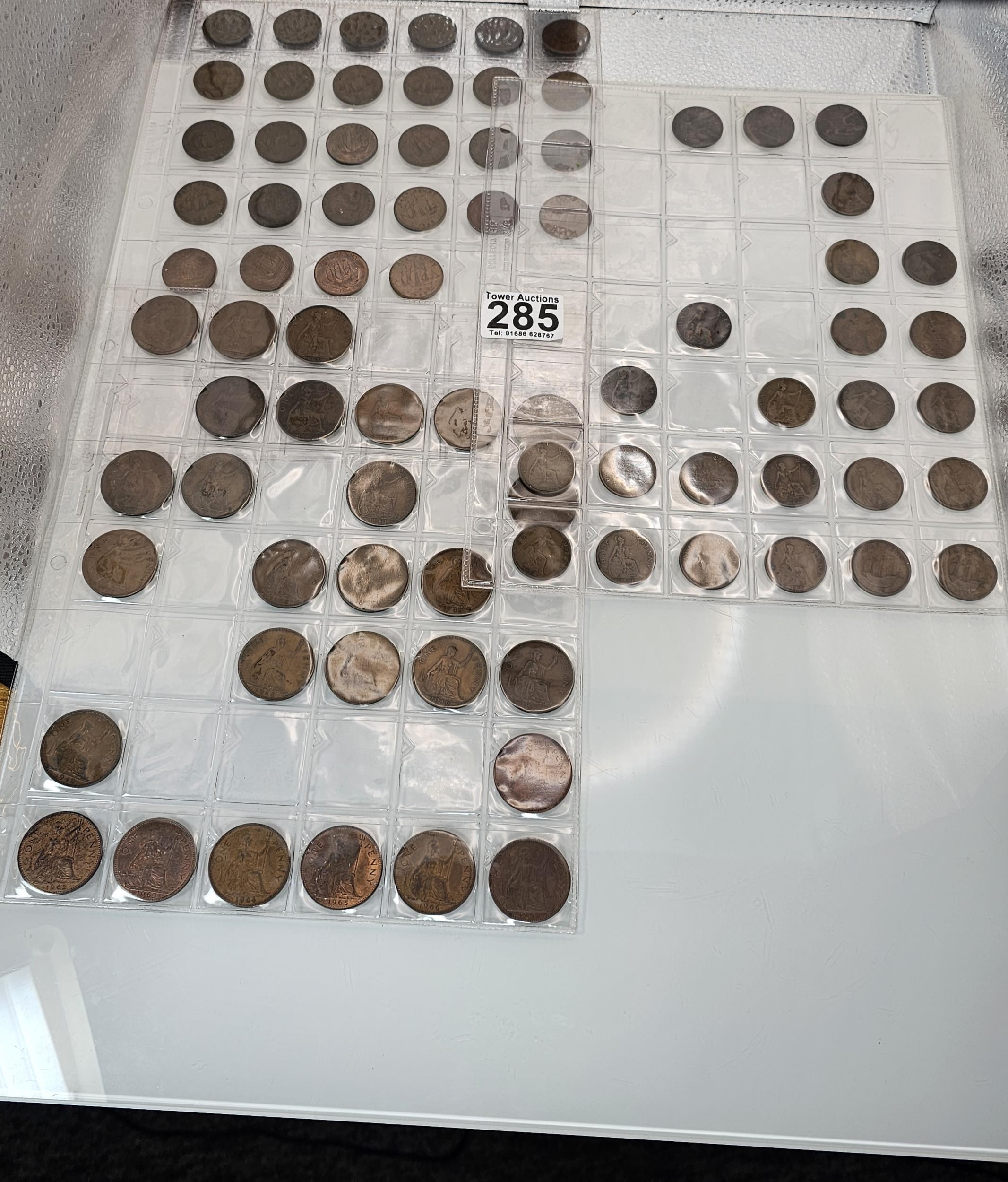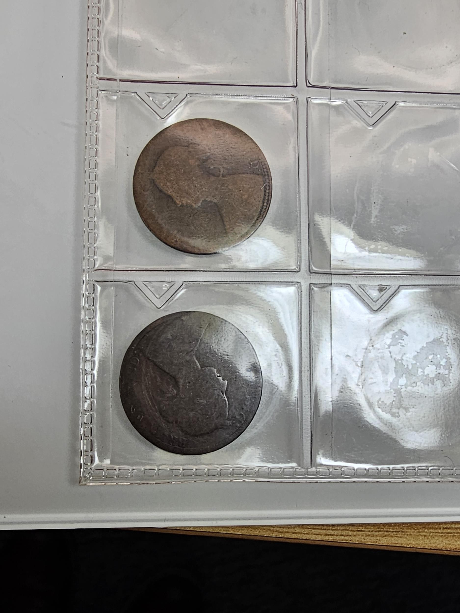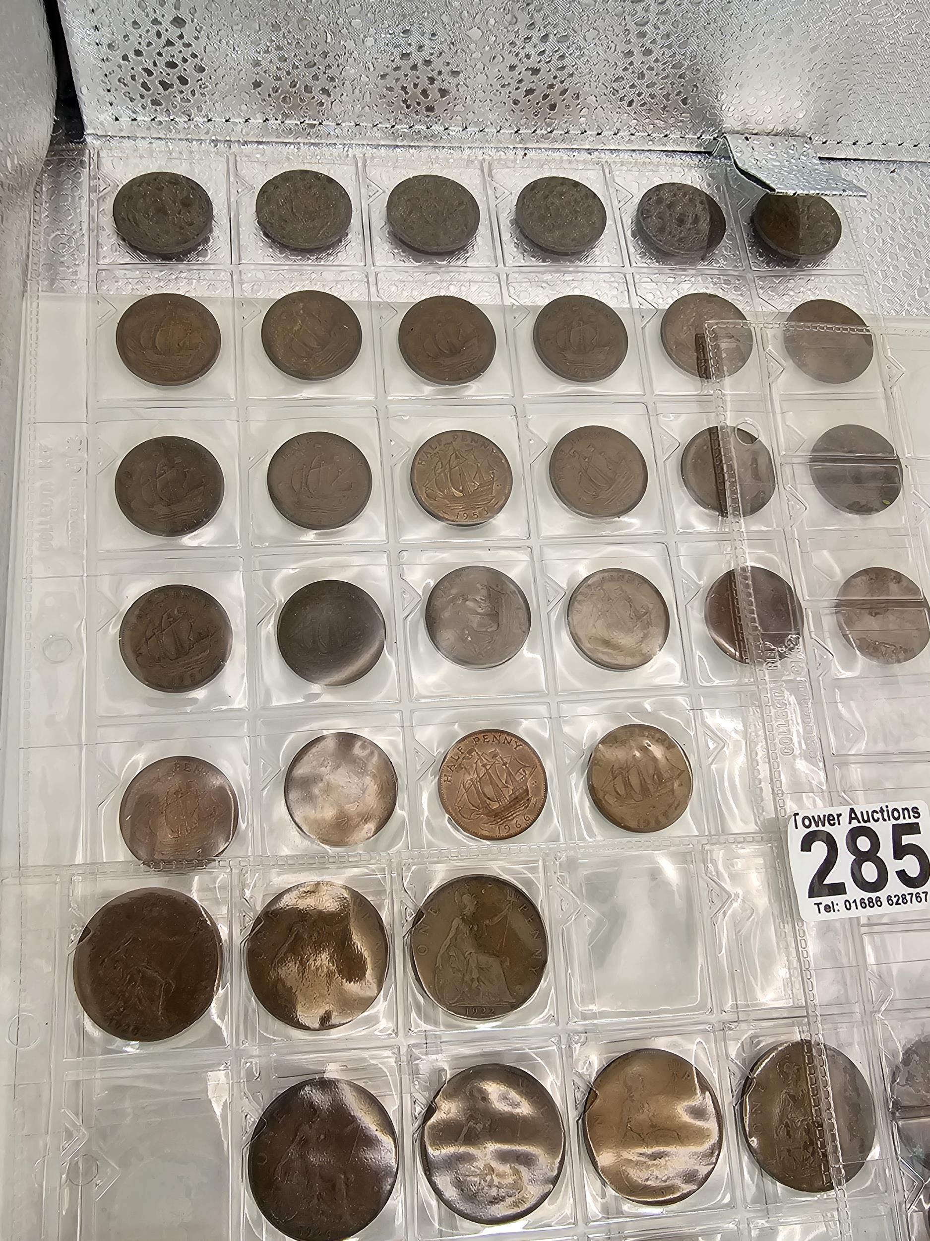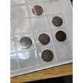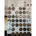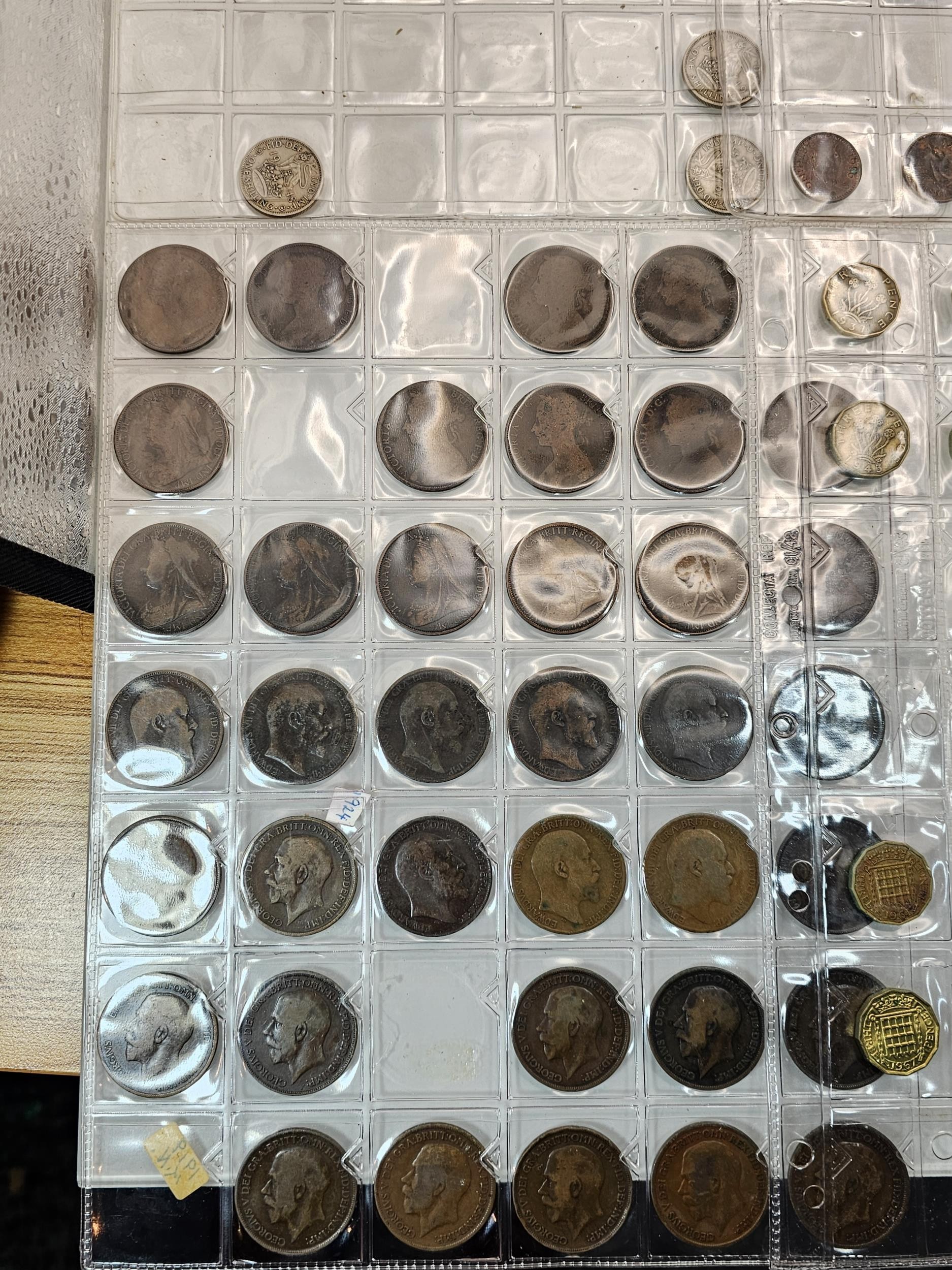 A coin album containing a large quantity of Victorian and later copper one penny coins and half penny coins, three pence coins and size pence coins. A large quantity is included, please study the photos.