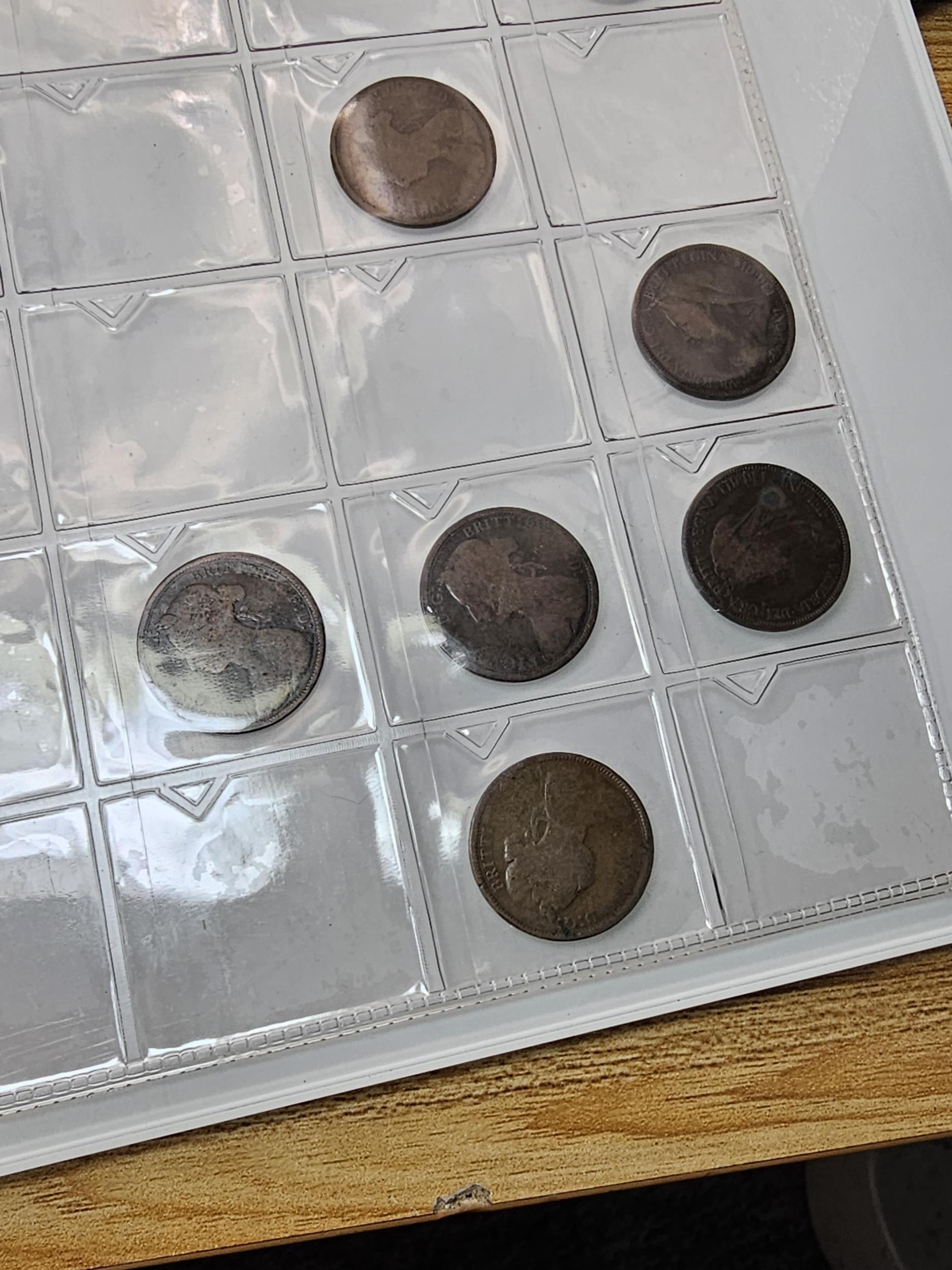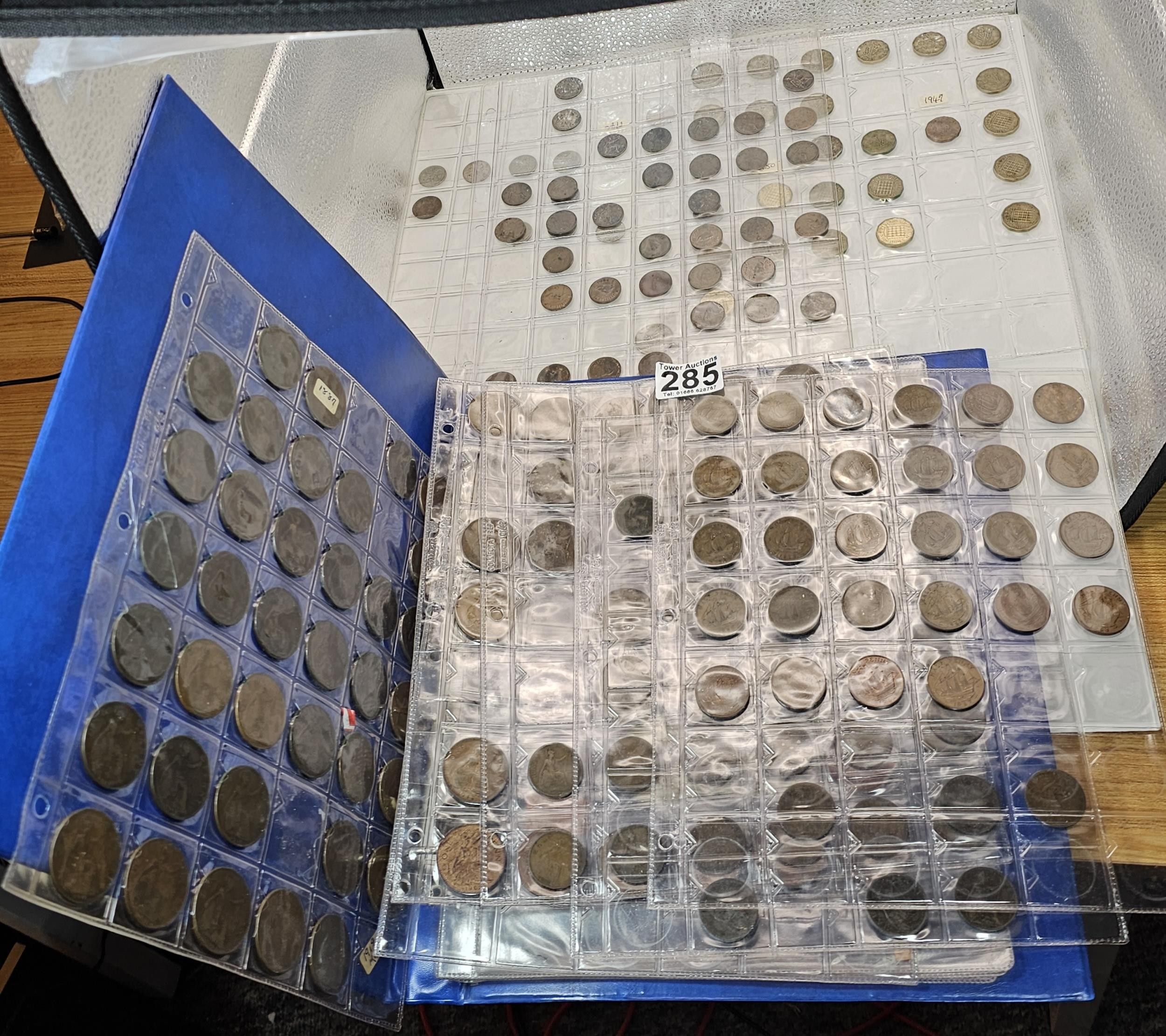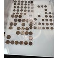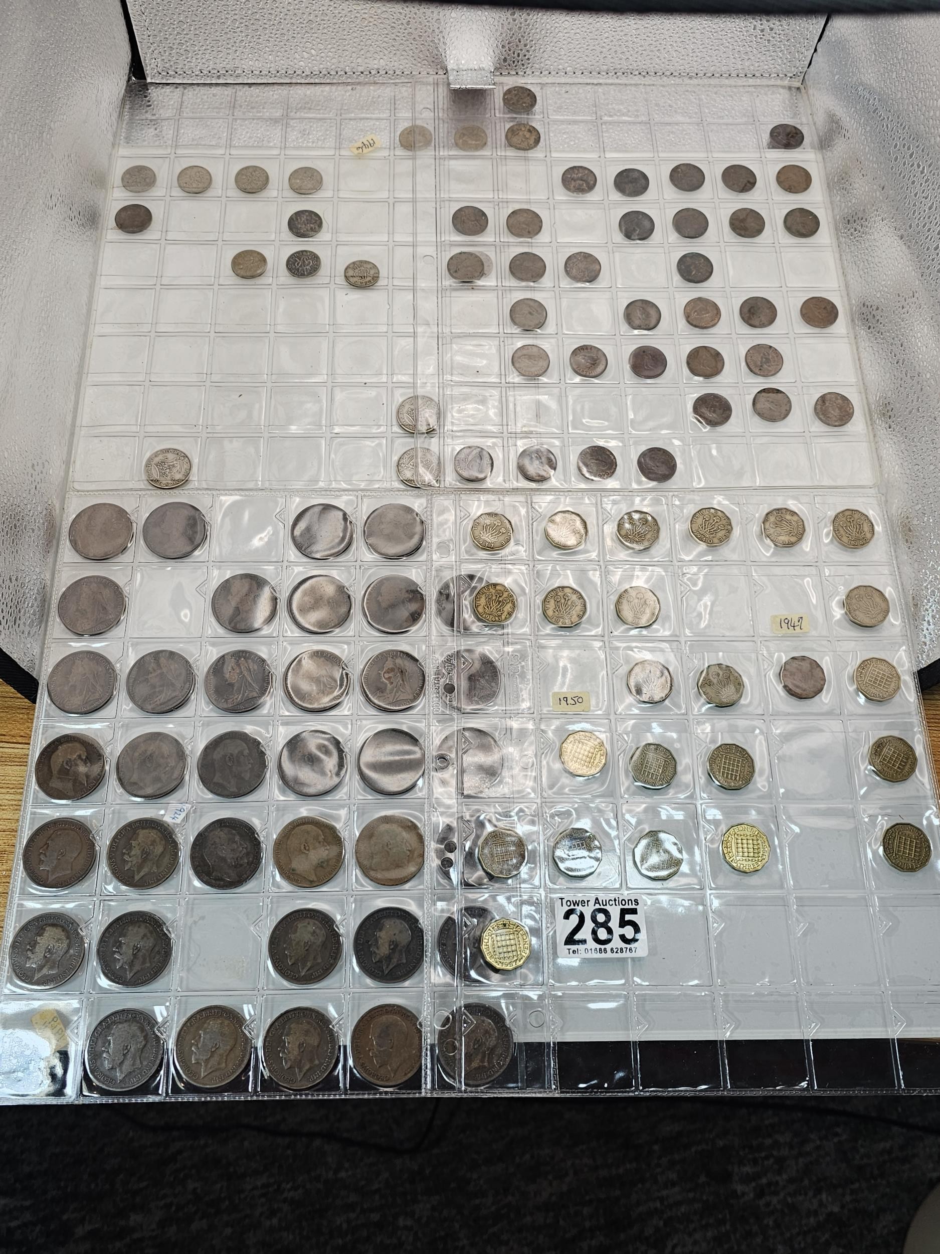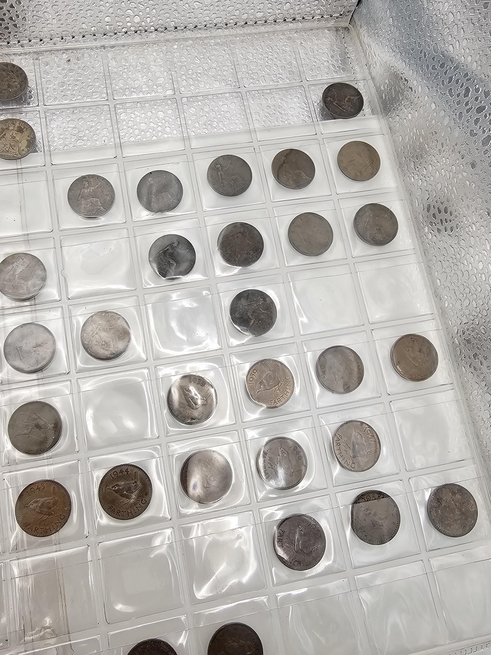 A coin album containing a large quantity of Victorian and later copper one penny coins and half penny coins, three pence coins and size pence coins. A large quantity is included, please study the photos.