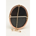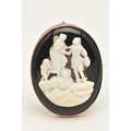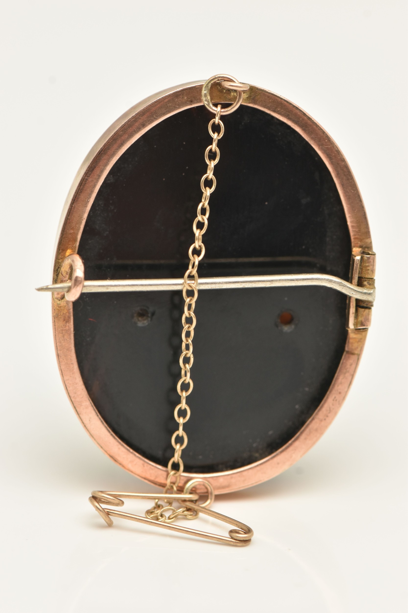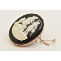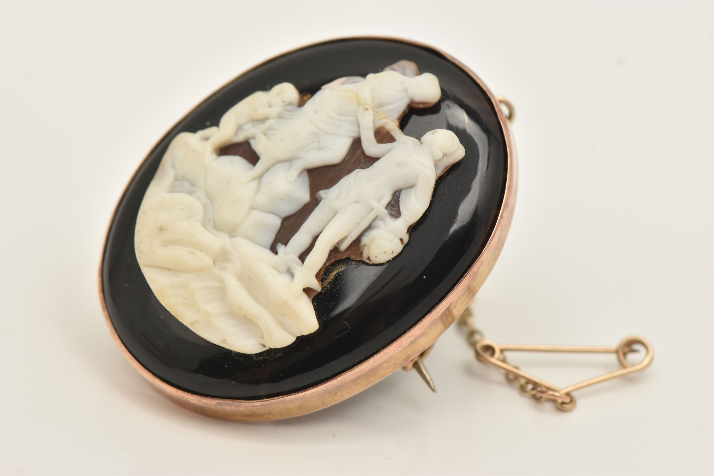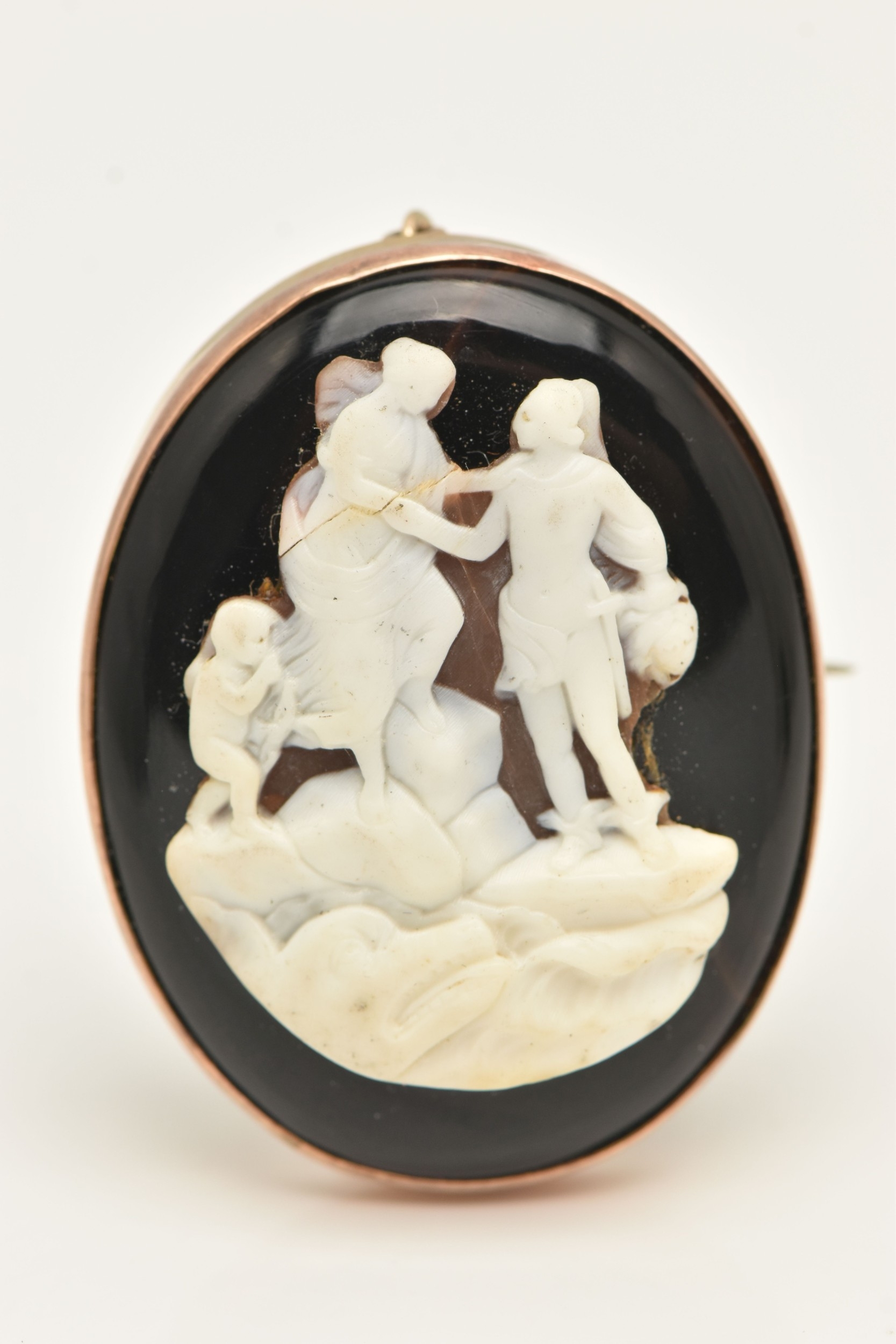 A ROSE METAL ONYX CAMEO BROOCH, of an oval form, depicting Perseus (cracked cameo), attached to a polished onyx cabochon, collet set in rose metal unmarked, fitted with a base metal pin C clasp and additional safety chain, approximate dimensions length 39.8mm x width 31.1mm, approximate gross weight 16.0 grams (condition report: metal has not been tested, crack within the cameo, two drill holes to the reverse of the onyx, general wear, viewing is advised to satisfy requirements)