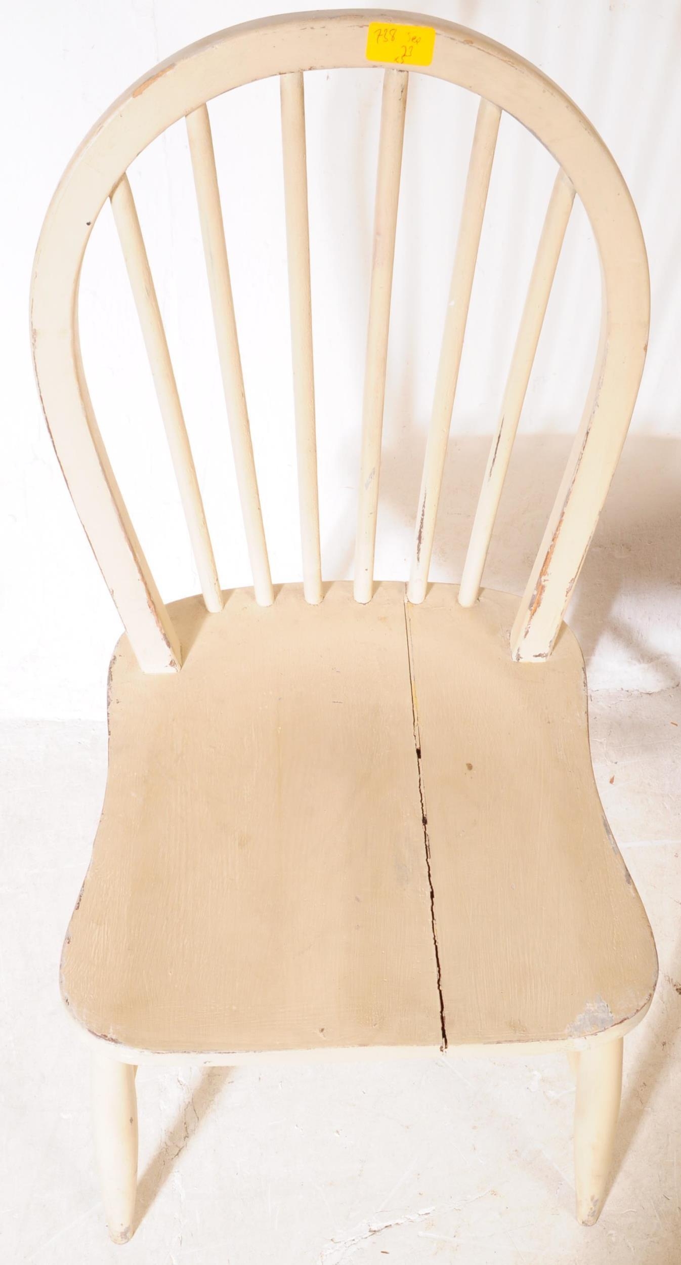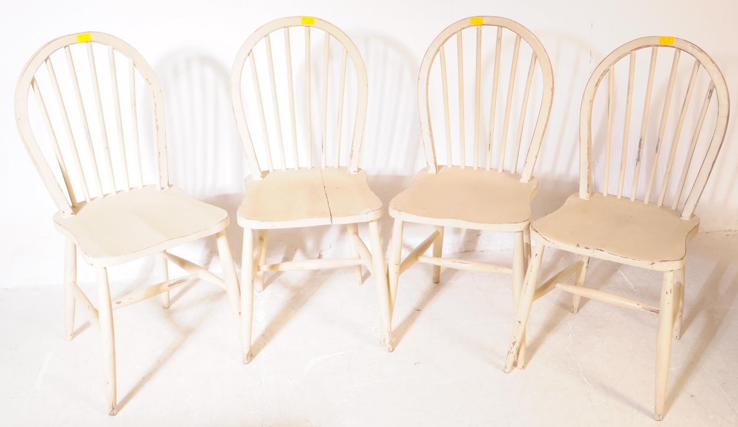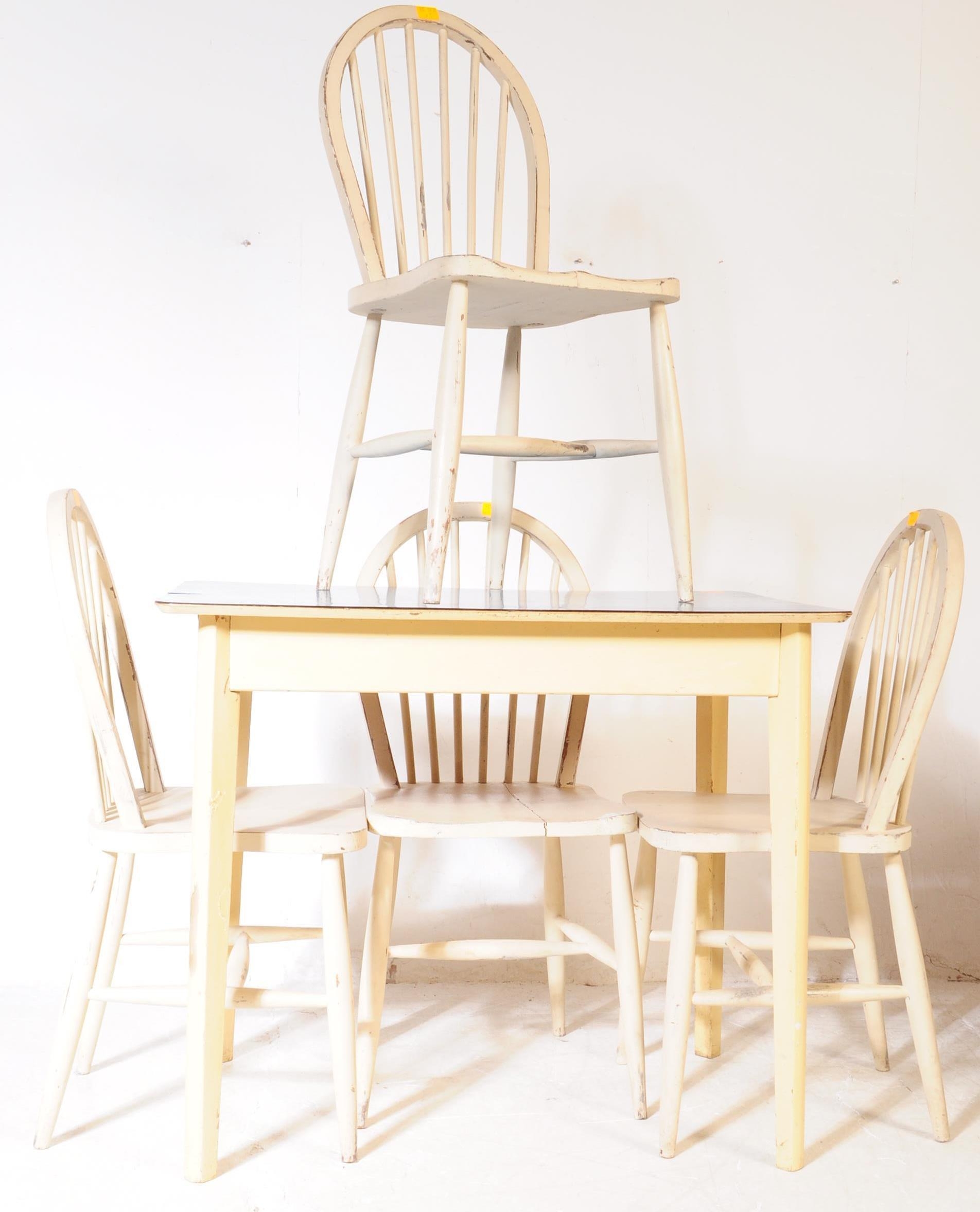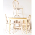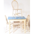 A vintage 20th century kitchen / dining table. With a blue rectangular top with painted frame with tapering upright supports. With four Ercol dining chairs. With arched spindle back on a saddle seat, with splayed tapering angled circular legs united by h stretcher. Measures approx. 77cm x 90cm x 60cm.