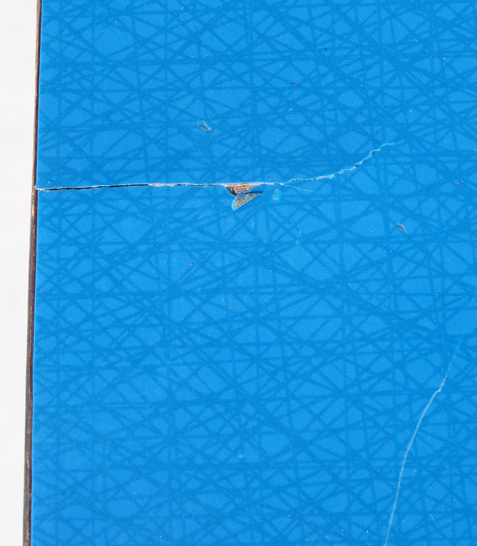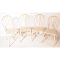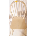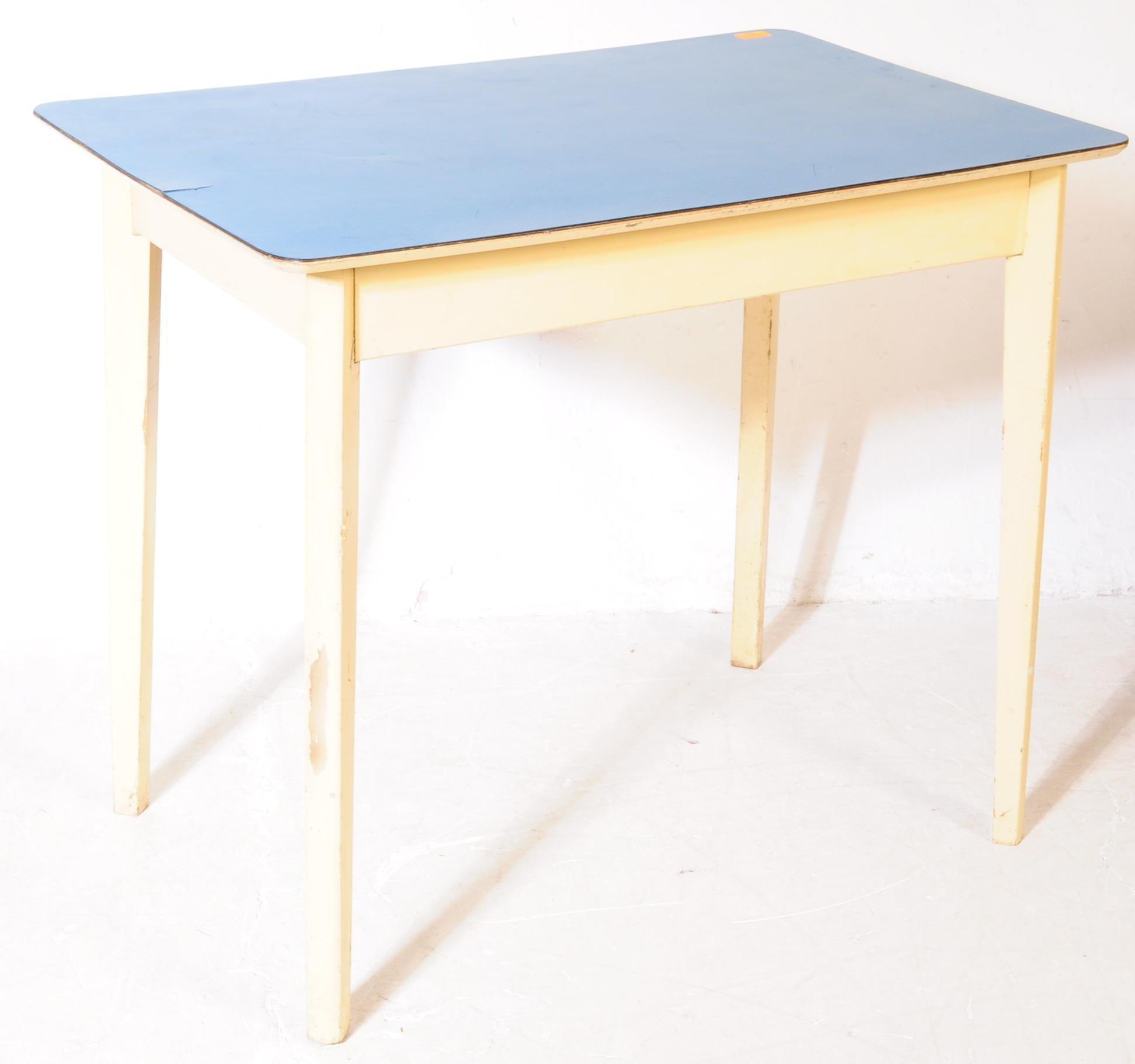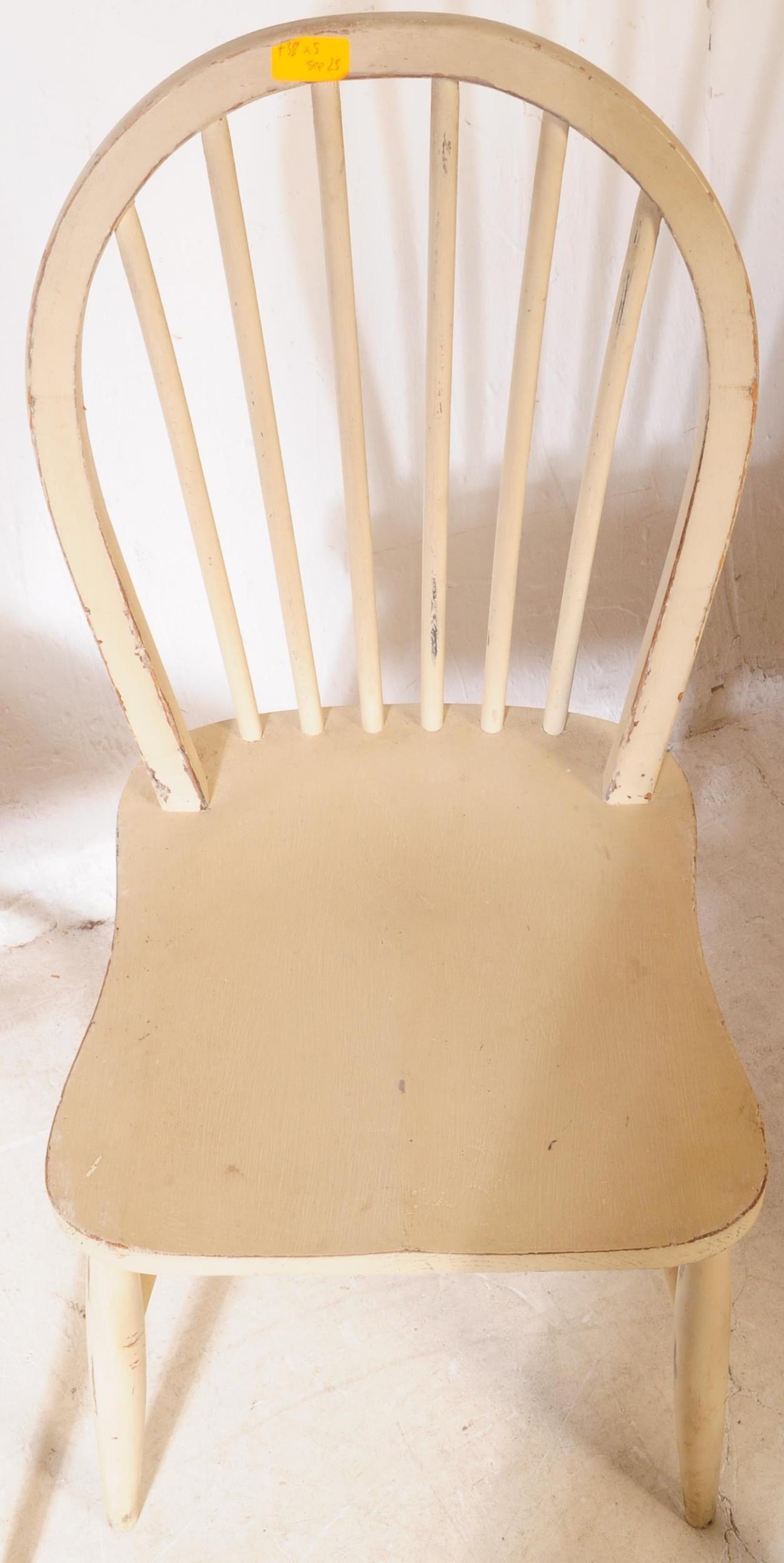 A vintage 20th century kitchen / dining table. With a blue rectangular top with painted frame with tapering upright supports. With four Ercol dining chairs. With arched spindle back on a saddle seat, with splayed tapering angled circular legs united by h stretcher. Measures approx. 77cm x 90cm x 60cm.