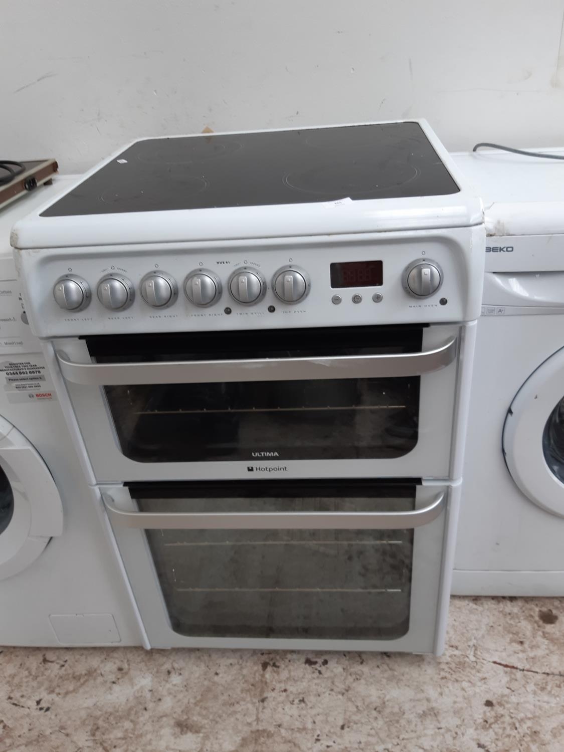 A HOTPOINT ULTIMA HUE61 ELECTRIC COOKER WITH TWIN GRILL, DOUBLE OVEN AND MAIN OVEN WITH FAN