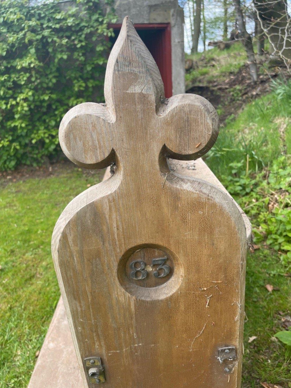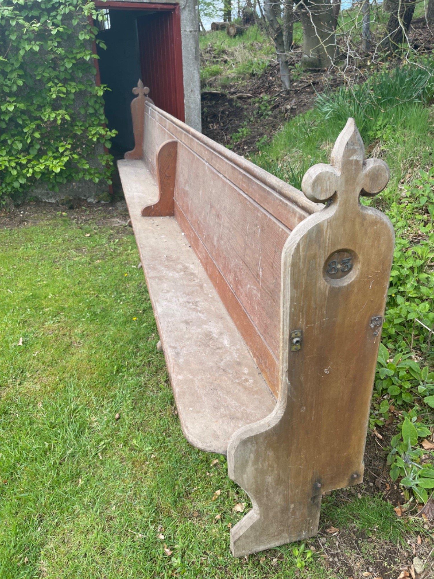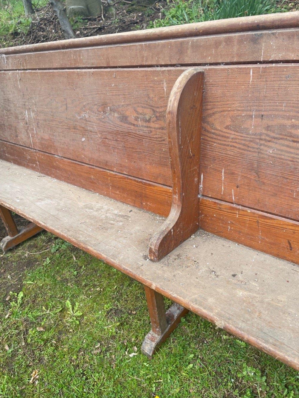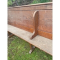A FULLY INTACT LOCAL CHURCH VICTORIAN PEW - this can be adapted as a stylish bespoke corner seat or half in two for two separate and unusual seats - this has lovely hand carved ends which are numbered separately at each end - quite UNIQUE- length 16ft approx