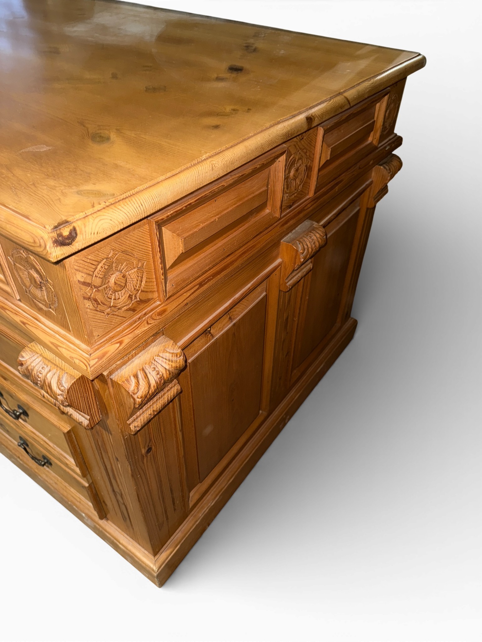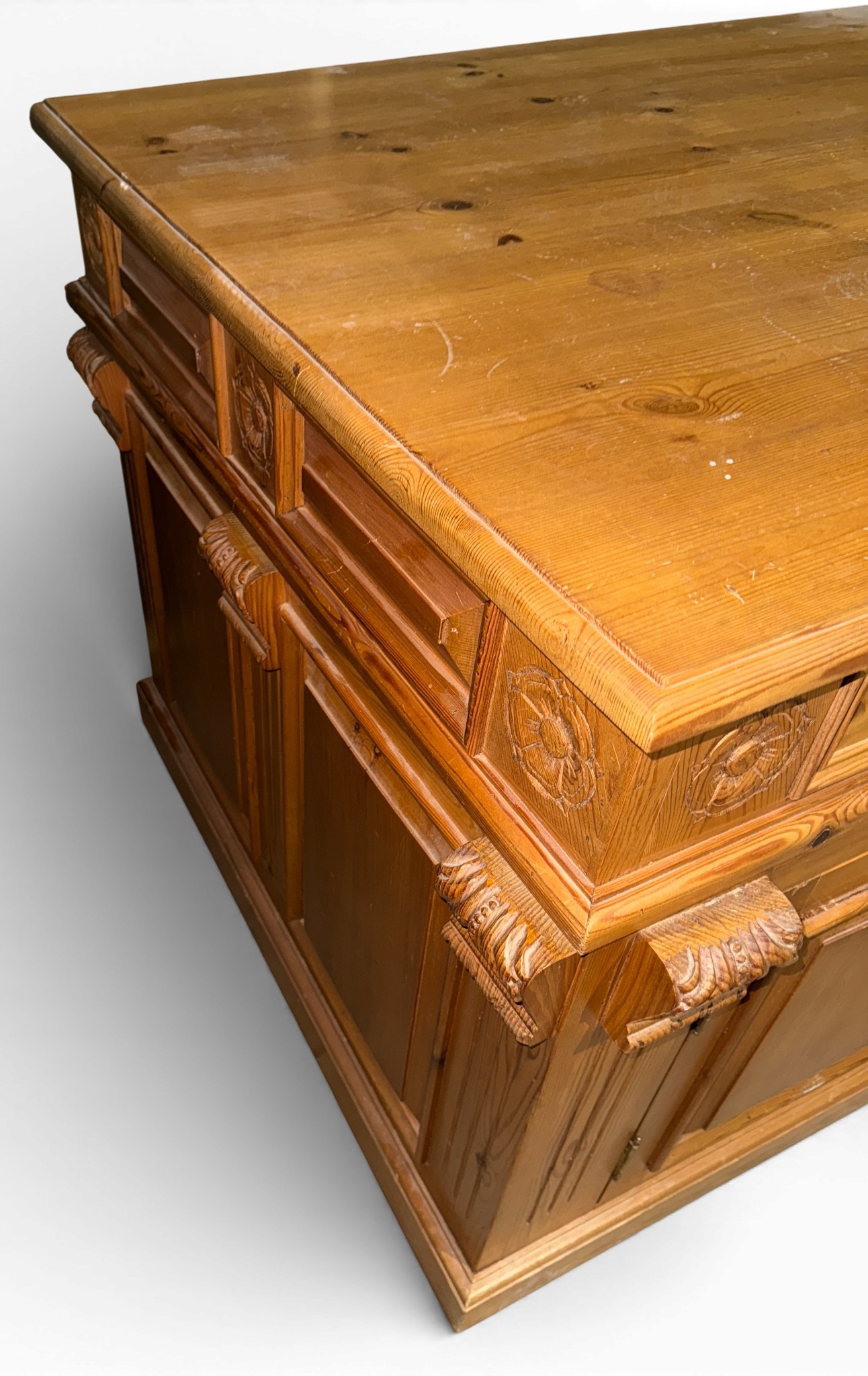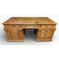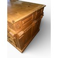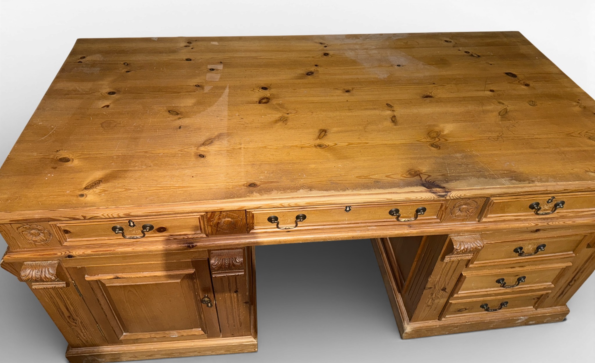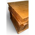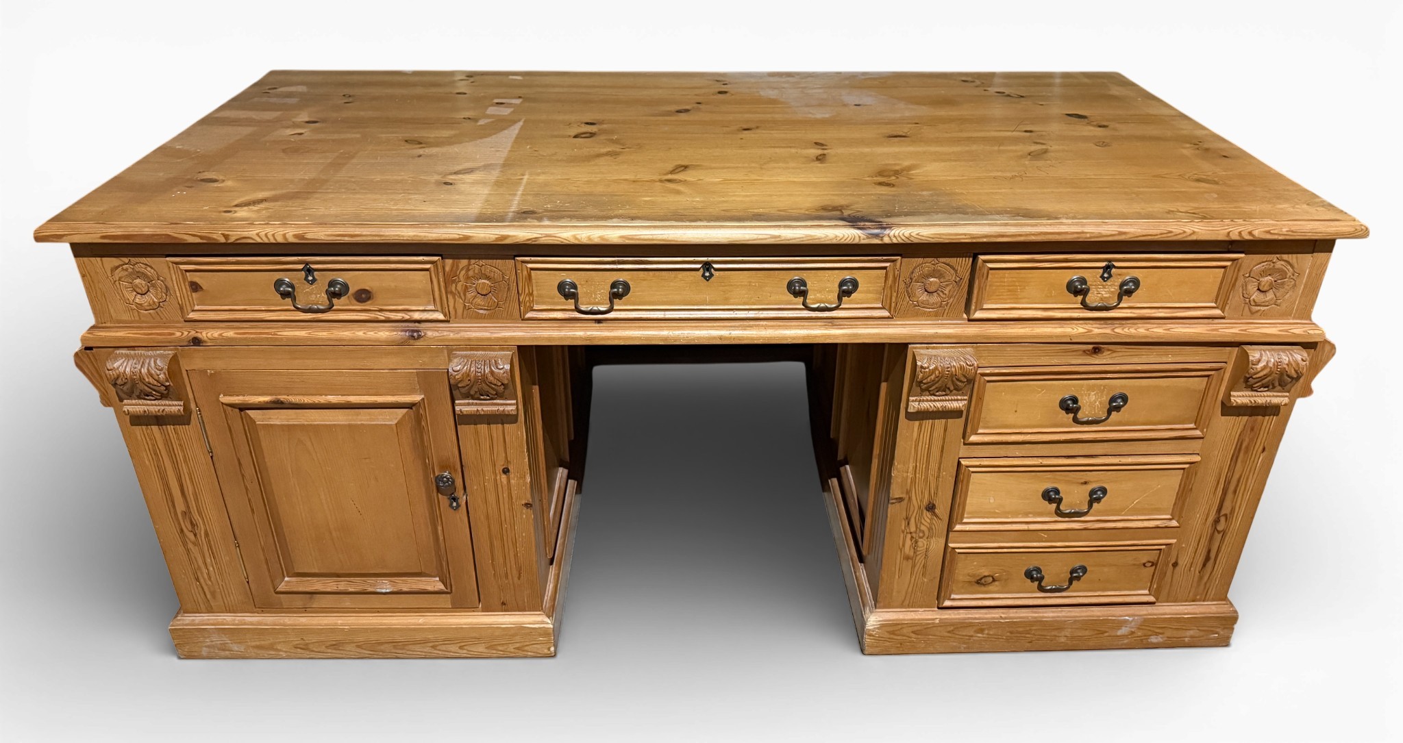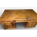 A pine pedestal kneehole desk. 185cm w x 90cm d x 80cm h.