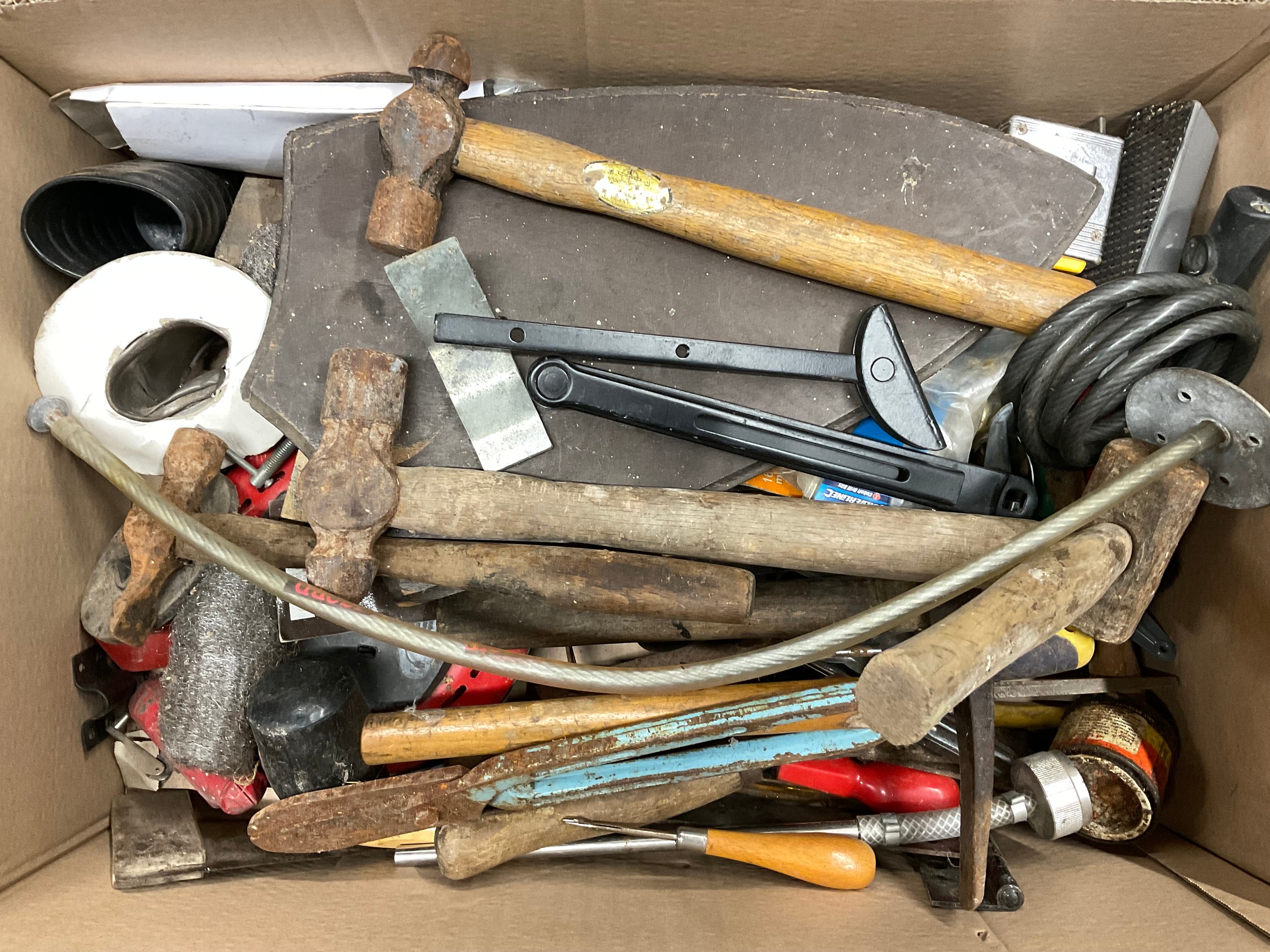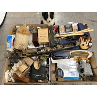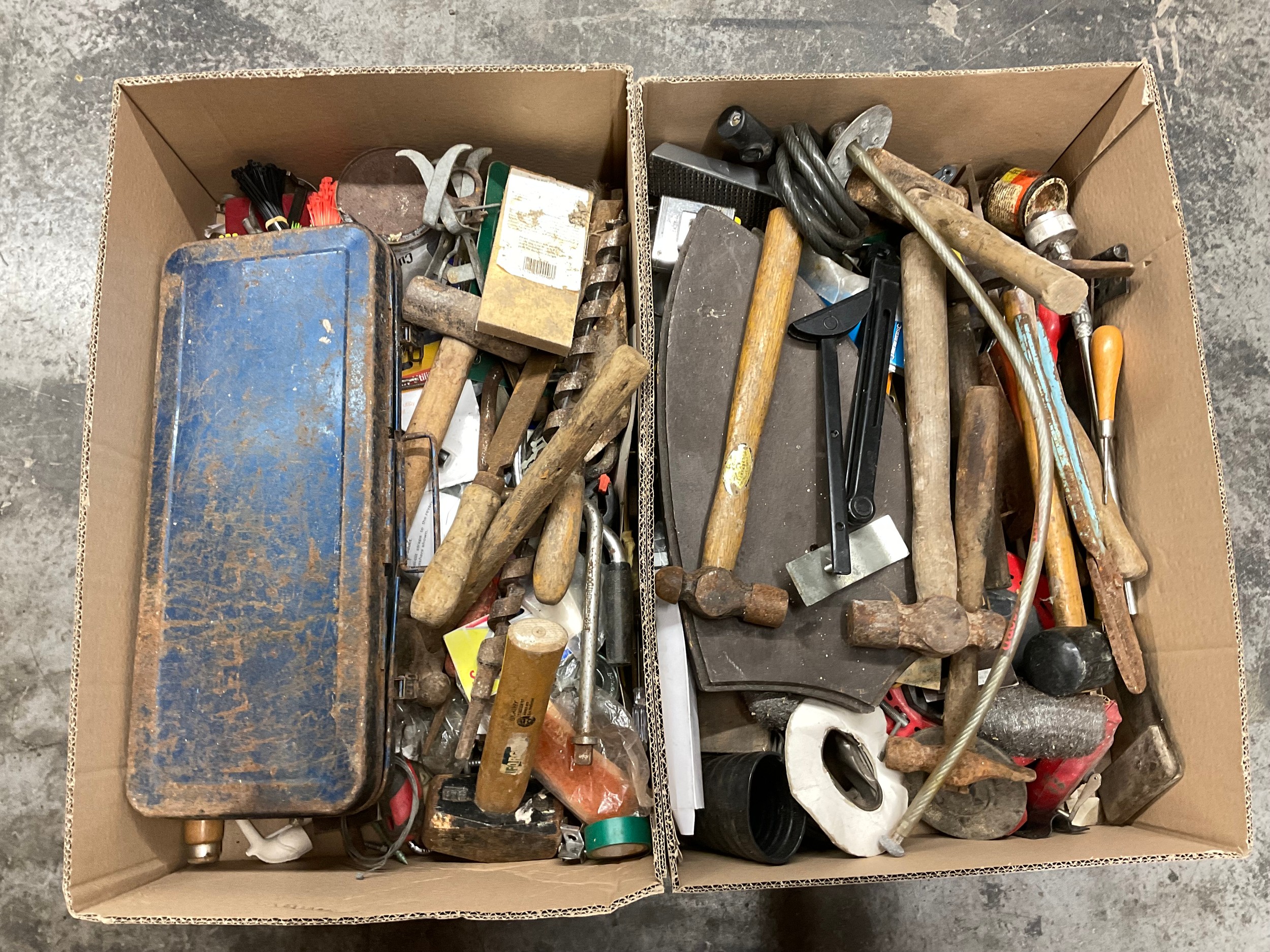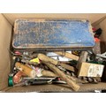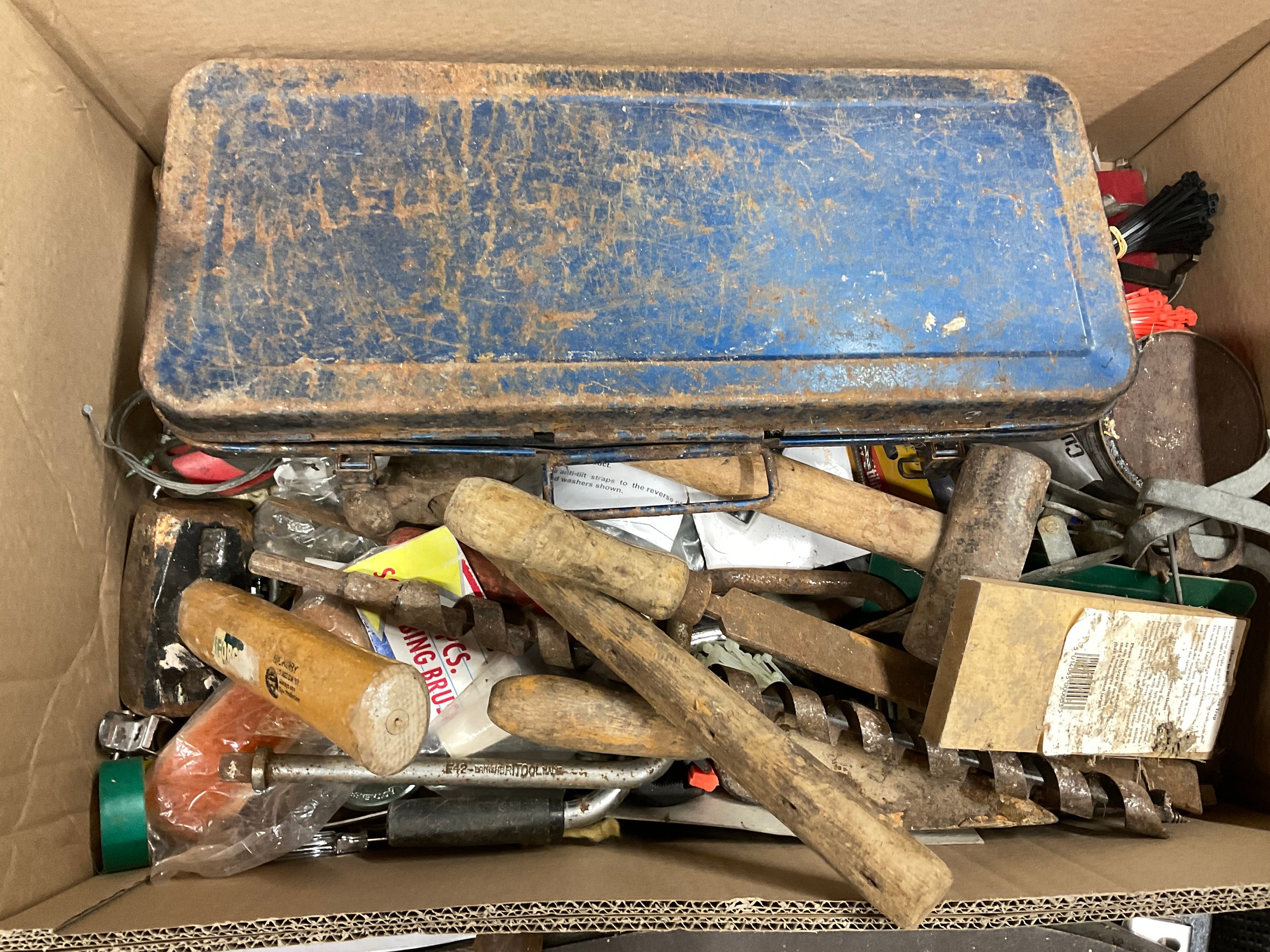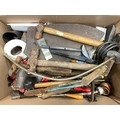 2 BOXES OF VINTAGE TOOLS AND HARDWARE TO INCLUDE SOCKET SET, MALLET HAMMERS ETC