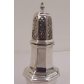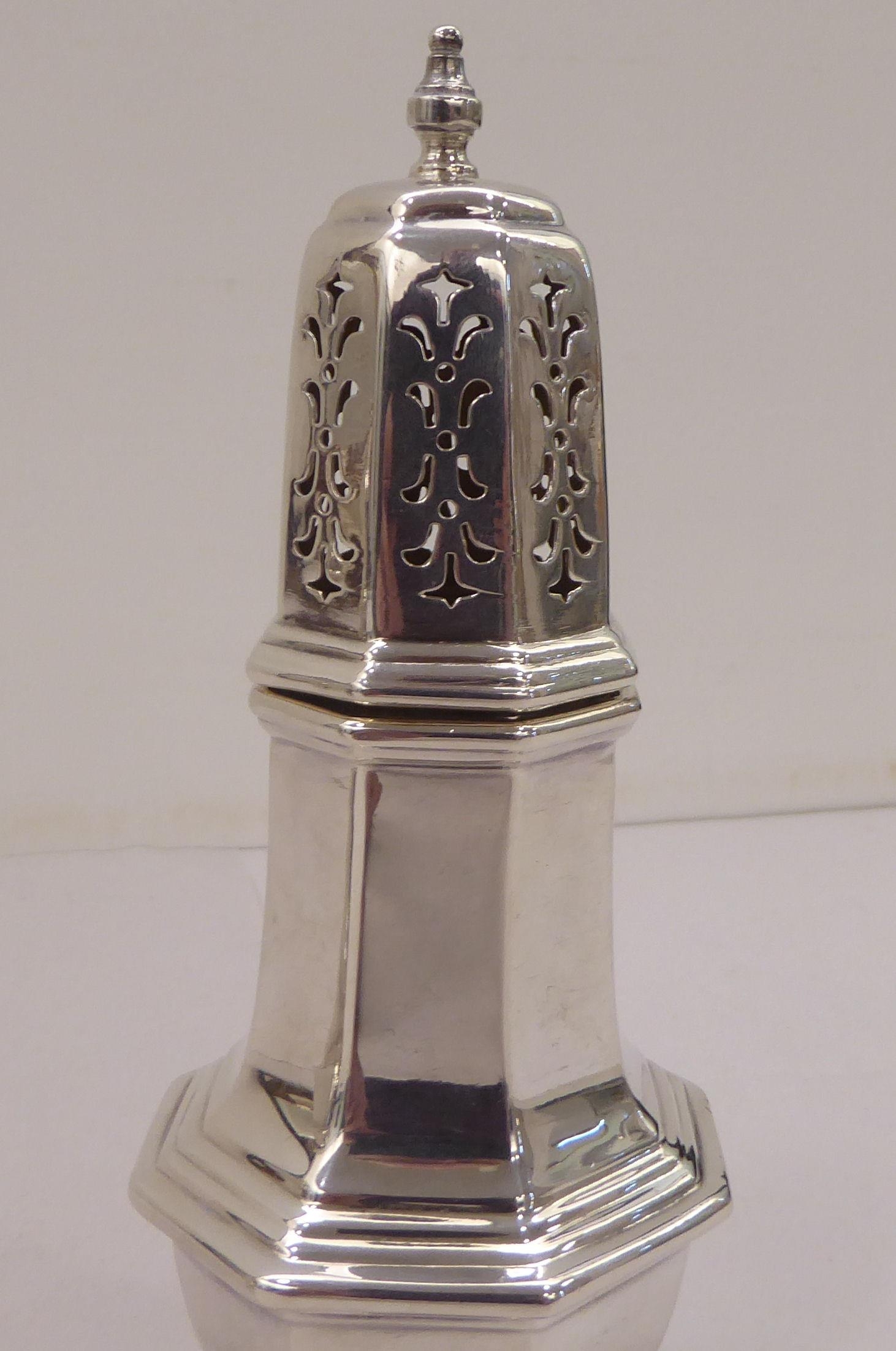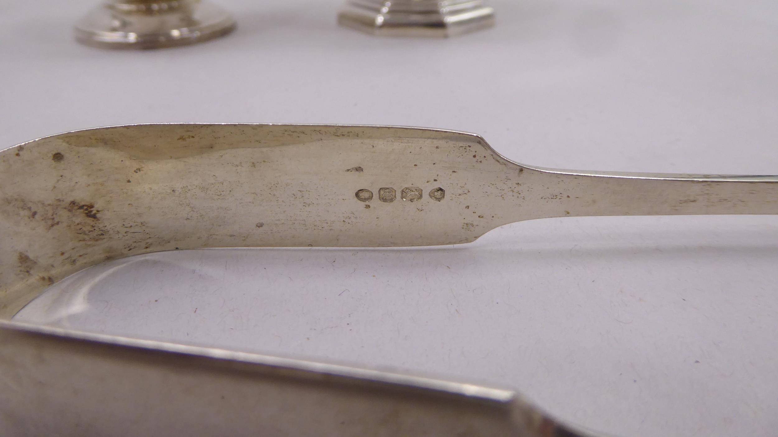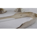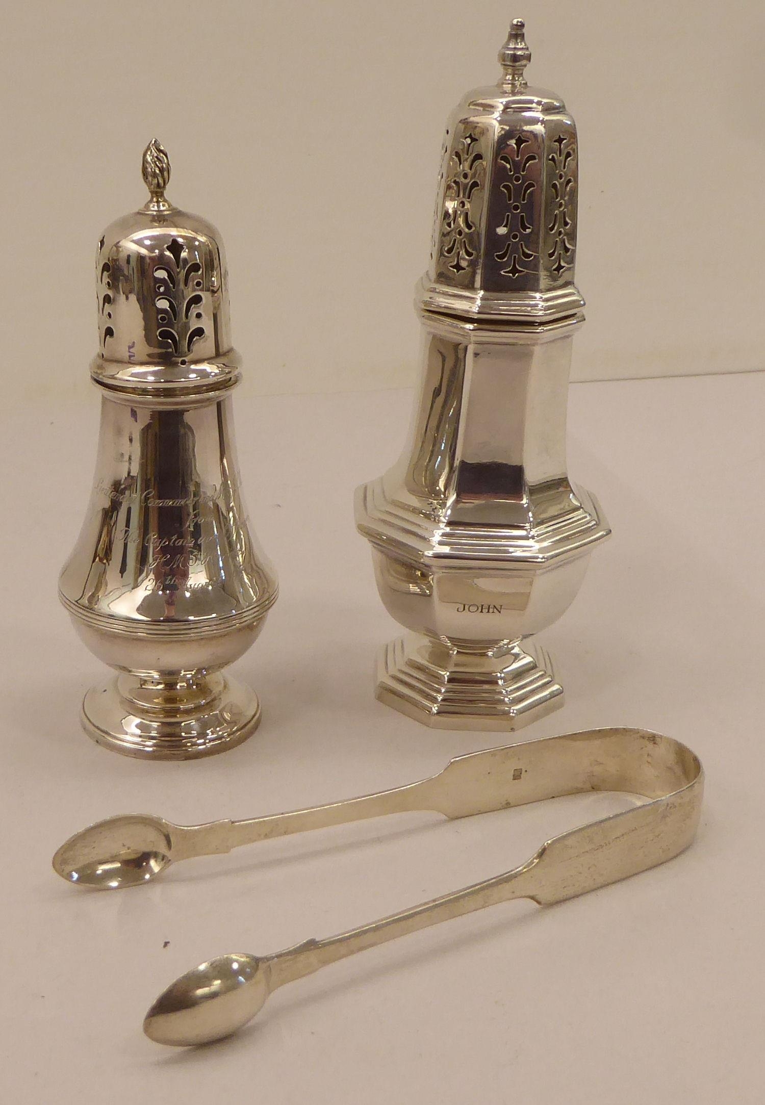 A silver plated caster; another in silver; and a pair of silver sugar tongs mixed marks