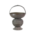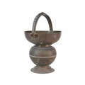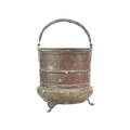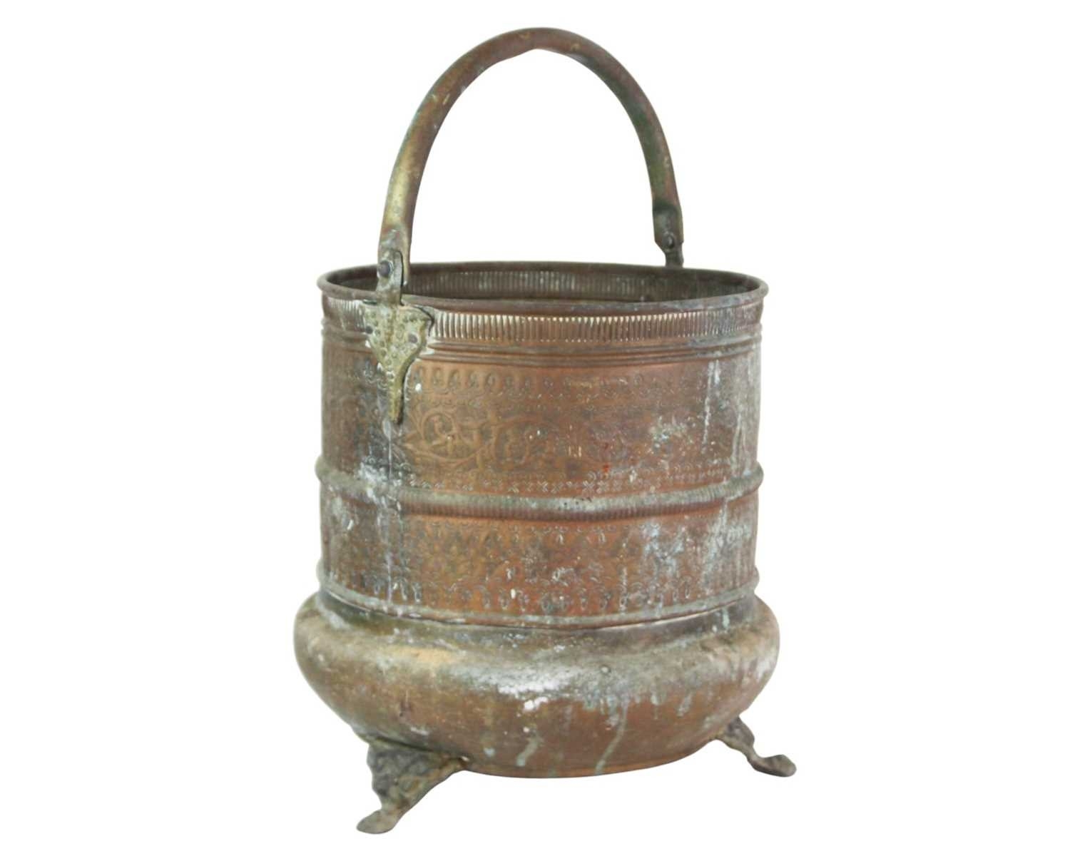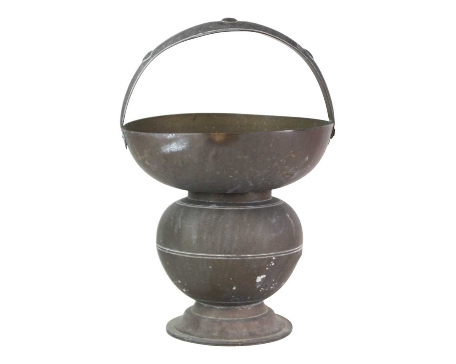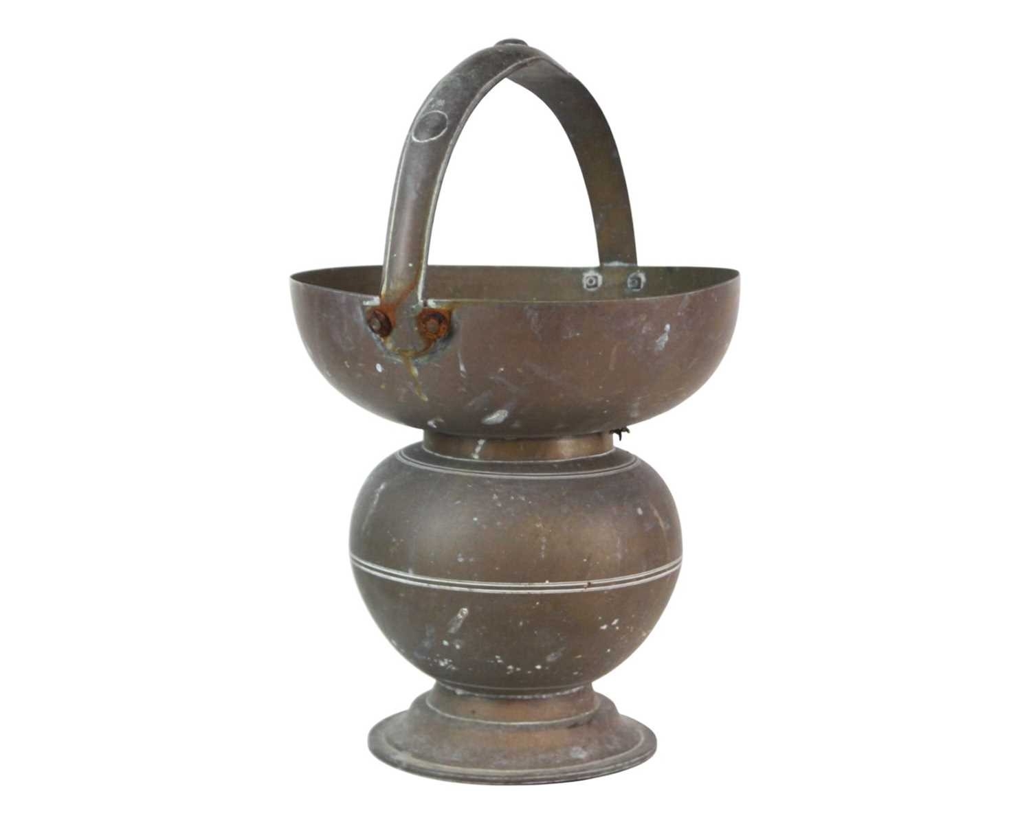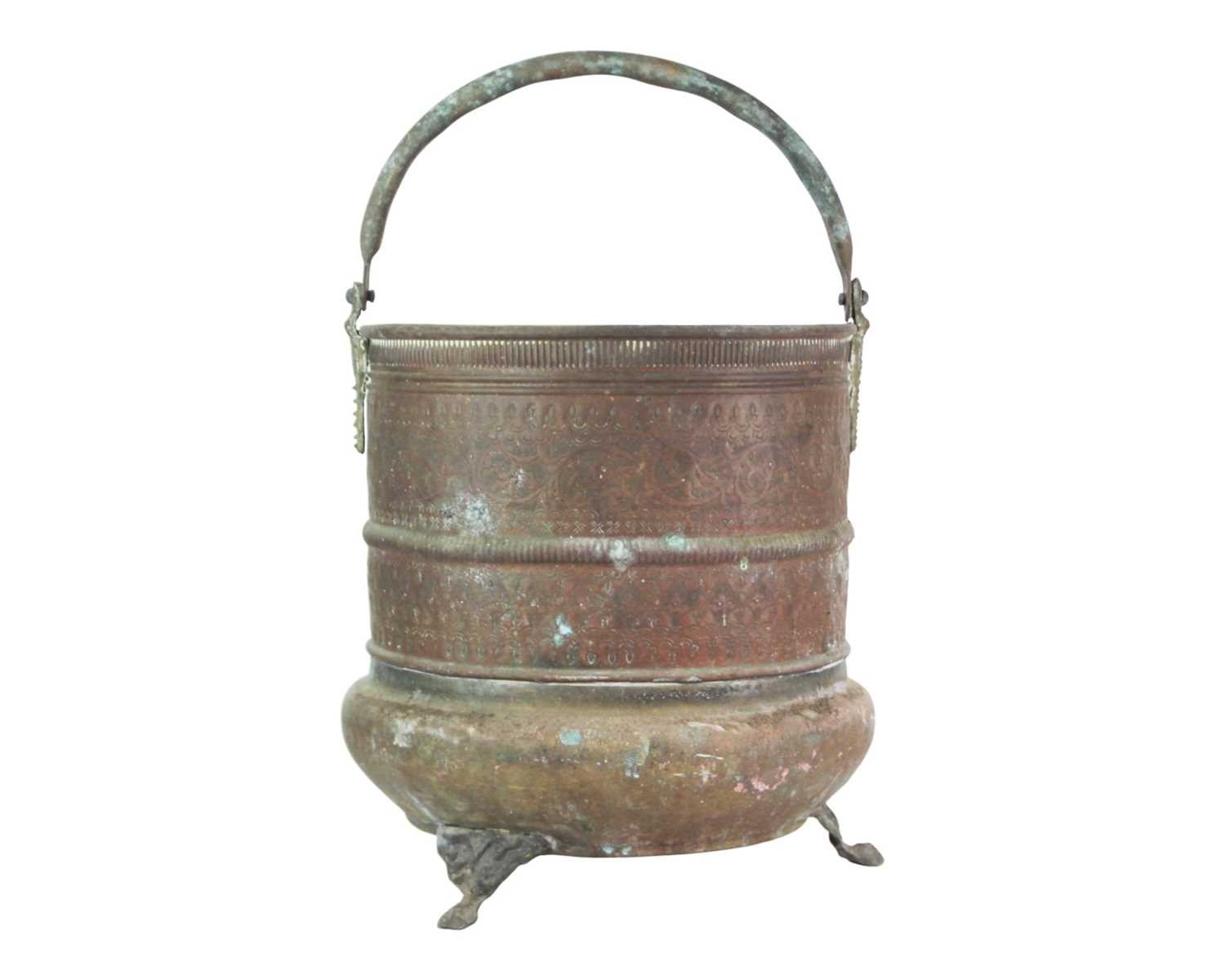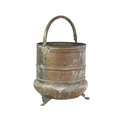 A brass Indian Kamandalu water pot. Early 20th century, with simple banded decoration, the handle decorated with roundels, height 45cm, with a copper log bin on three cast iron feet, with a brass handle, repousse decorated with repeating fleur de lys, cross and leaf motifs (2).