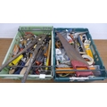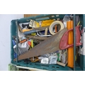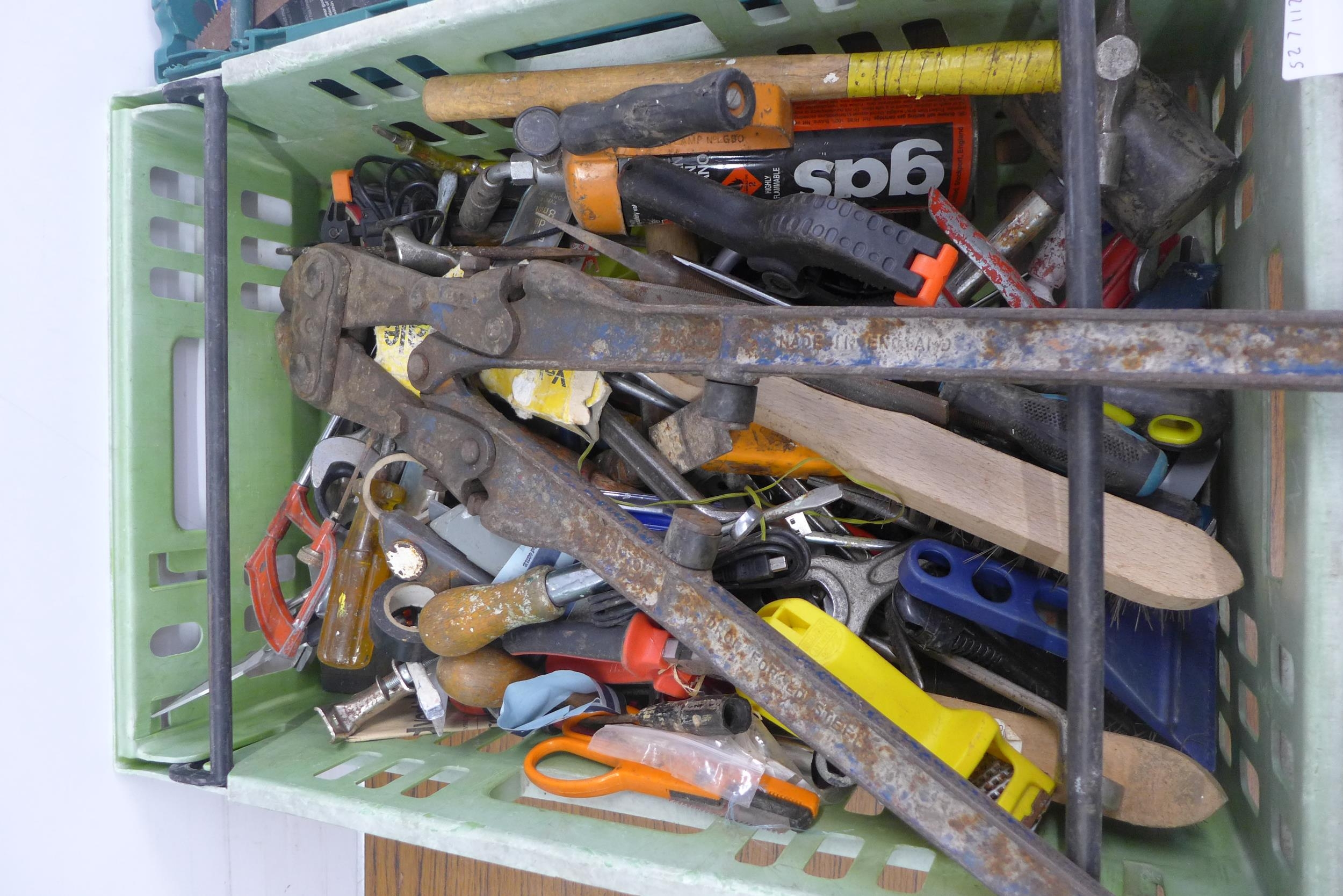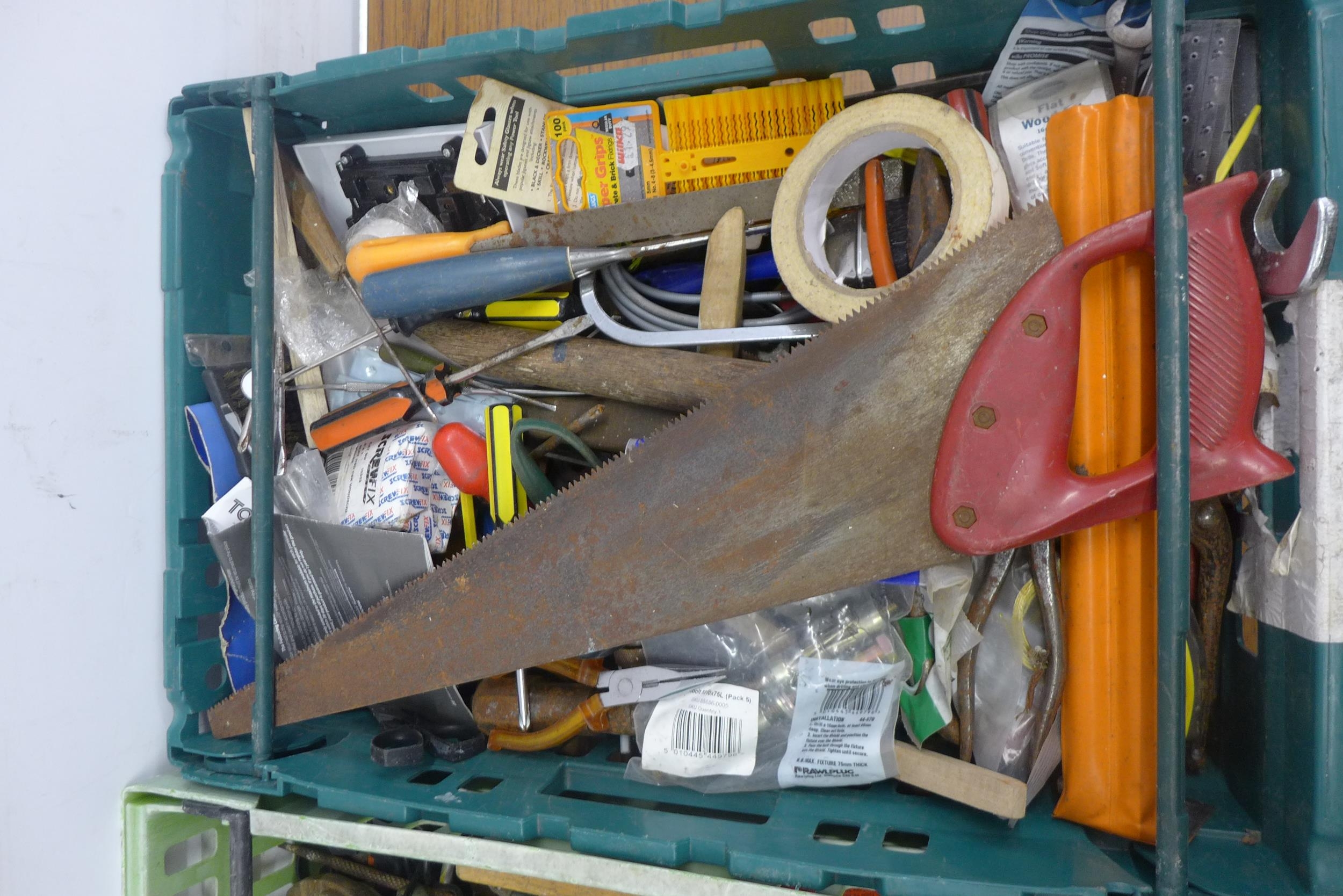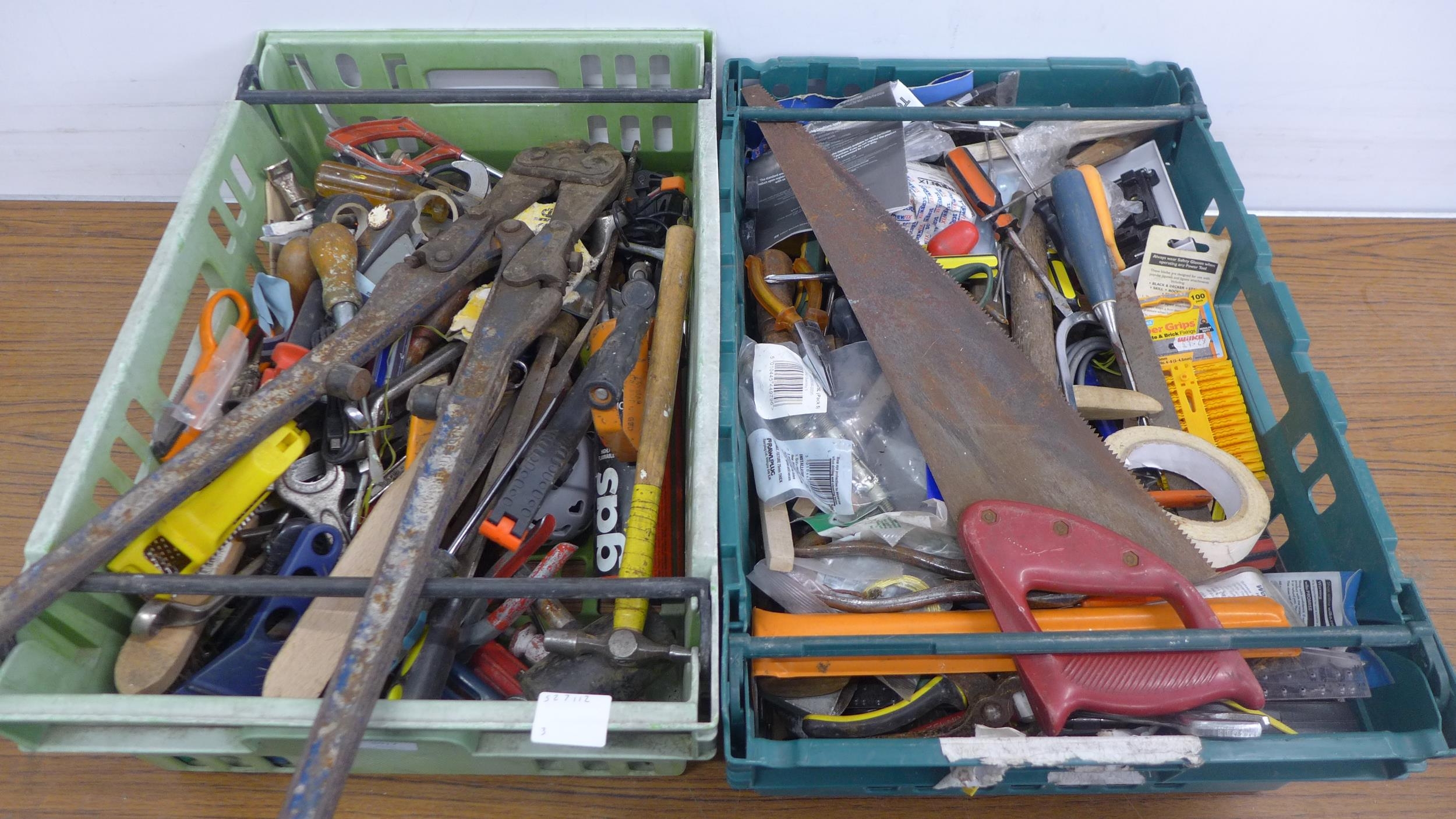 Two trays of assorted tools and other items including bolt croppers, saws, screwdrivers, wall plugs, tape, hammers, brushes and files, etc.