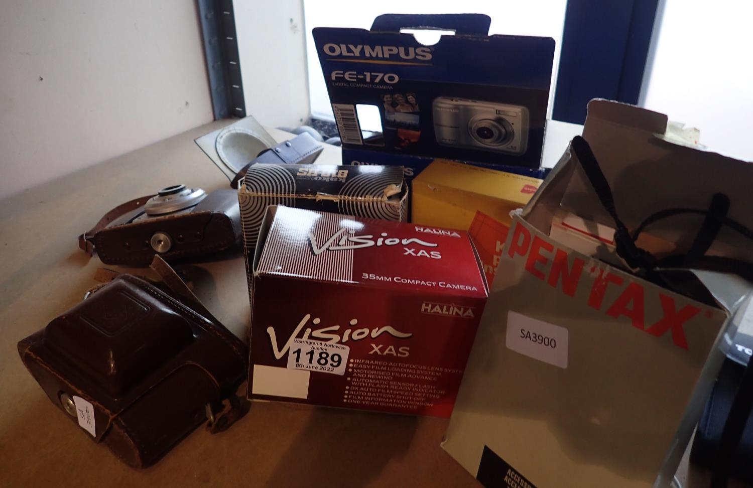 Shelf of mixed cameras, various makes and models. Not available for in-house P&P, contact Paul O'Hea at Mailboxes on 01925 659133
