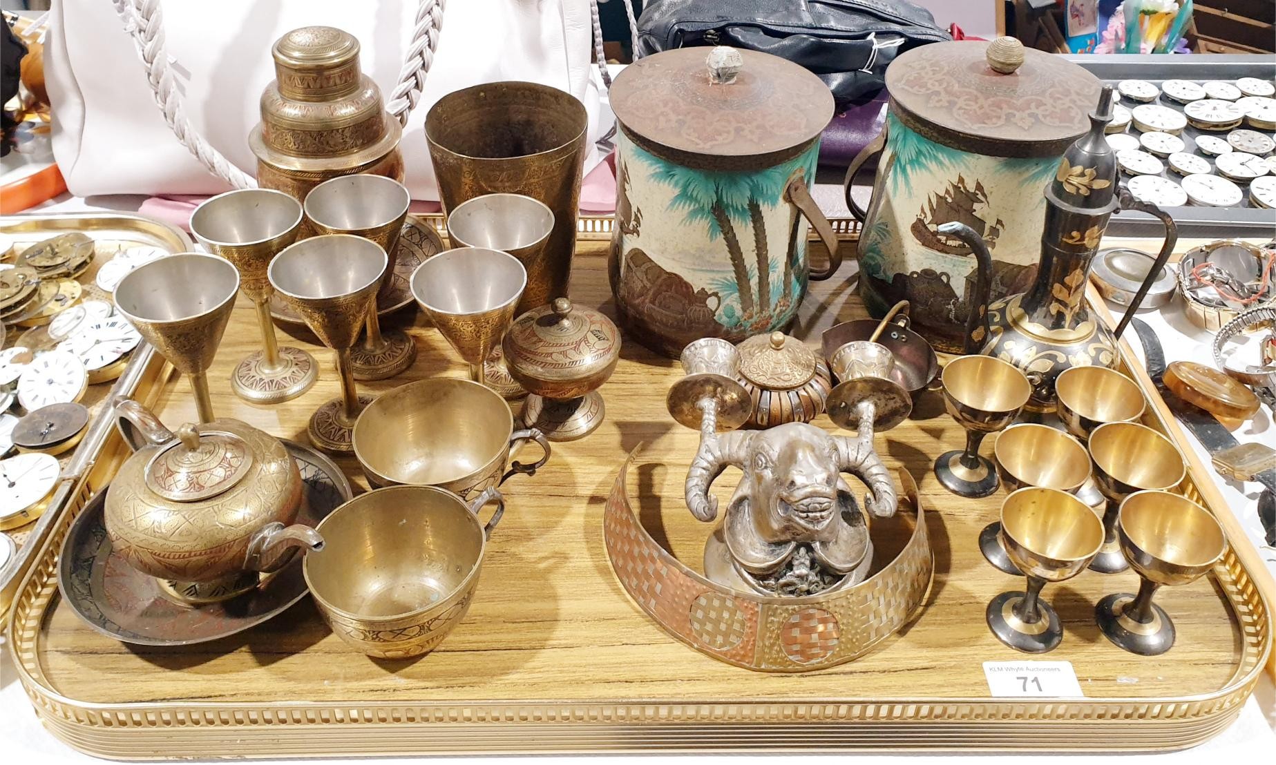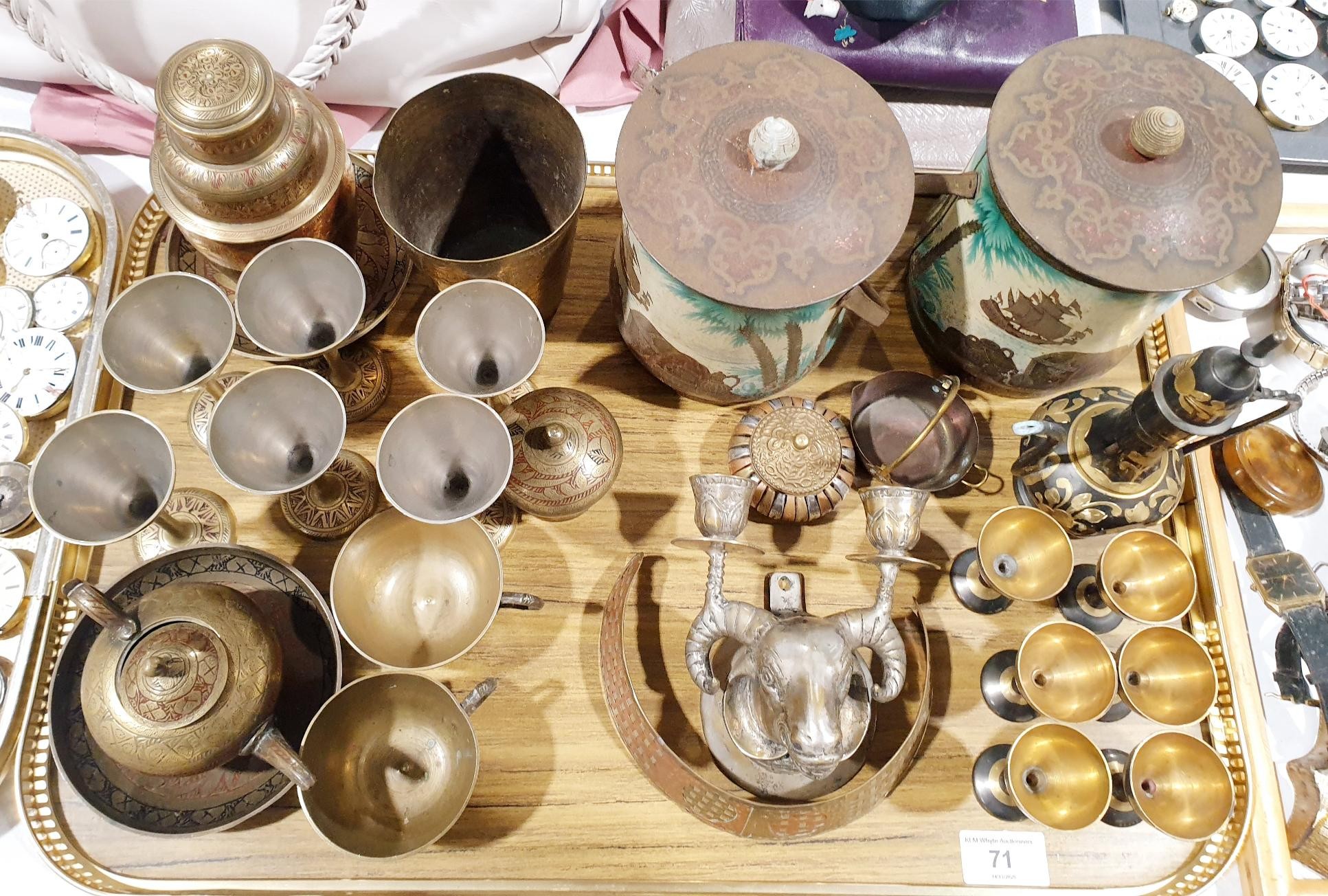 Assorted metal ware including two antique pirate themed biscuit barrels, height 17cm and a silver plated candle wall sconce in the form of a ram's head. No Shipping. Arrange collection or your own packer and shipper, please. Electricals are sold as scrap.