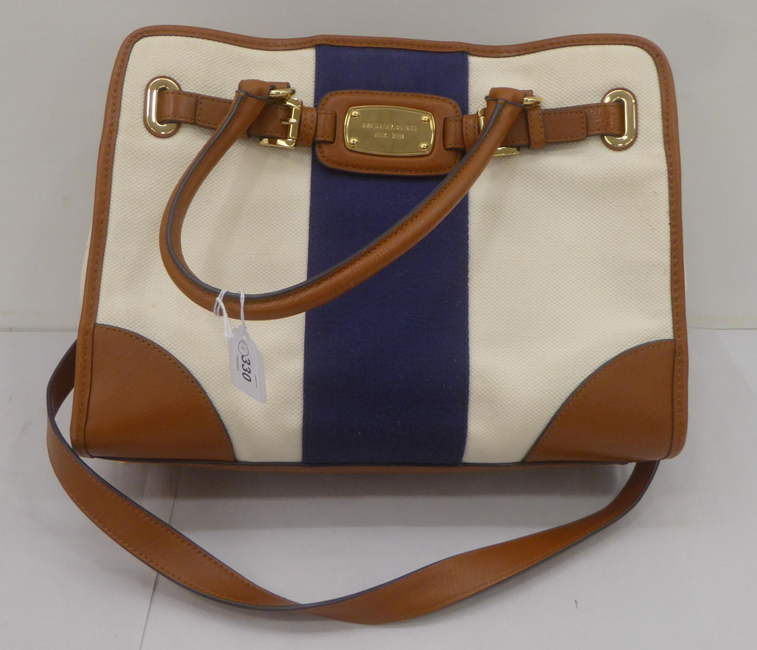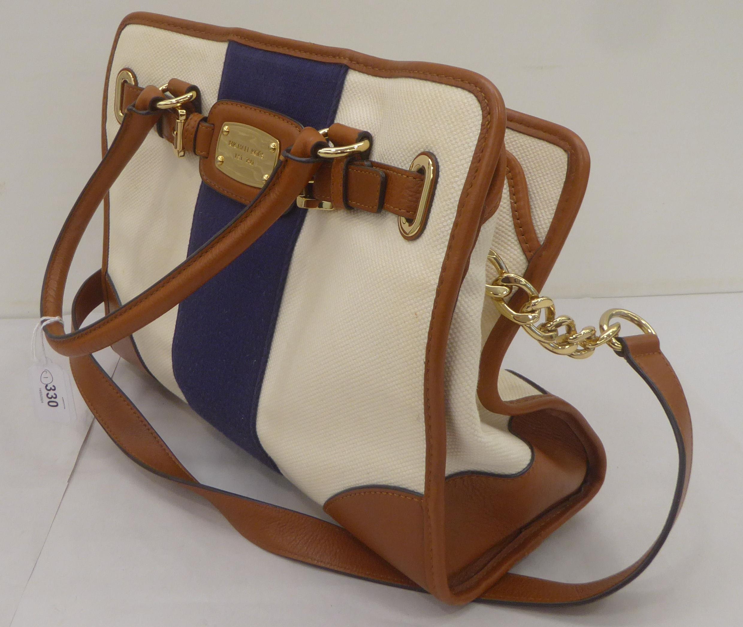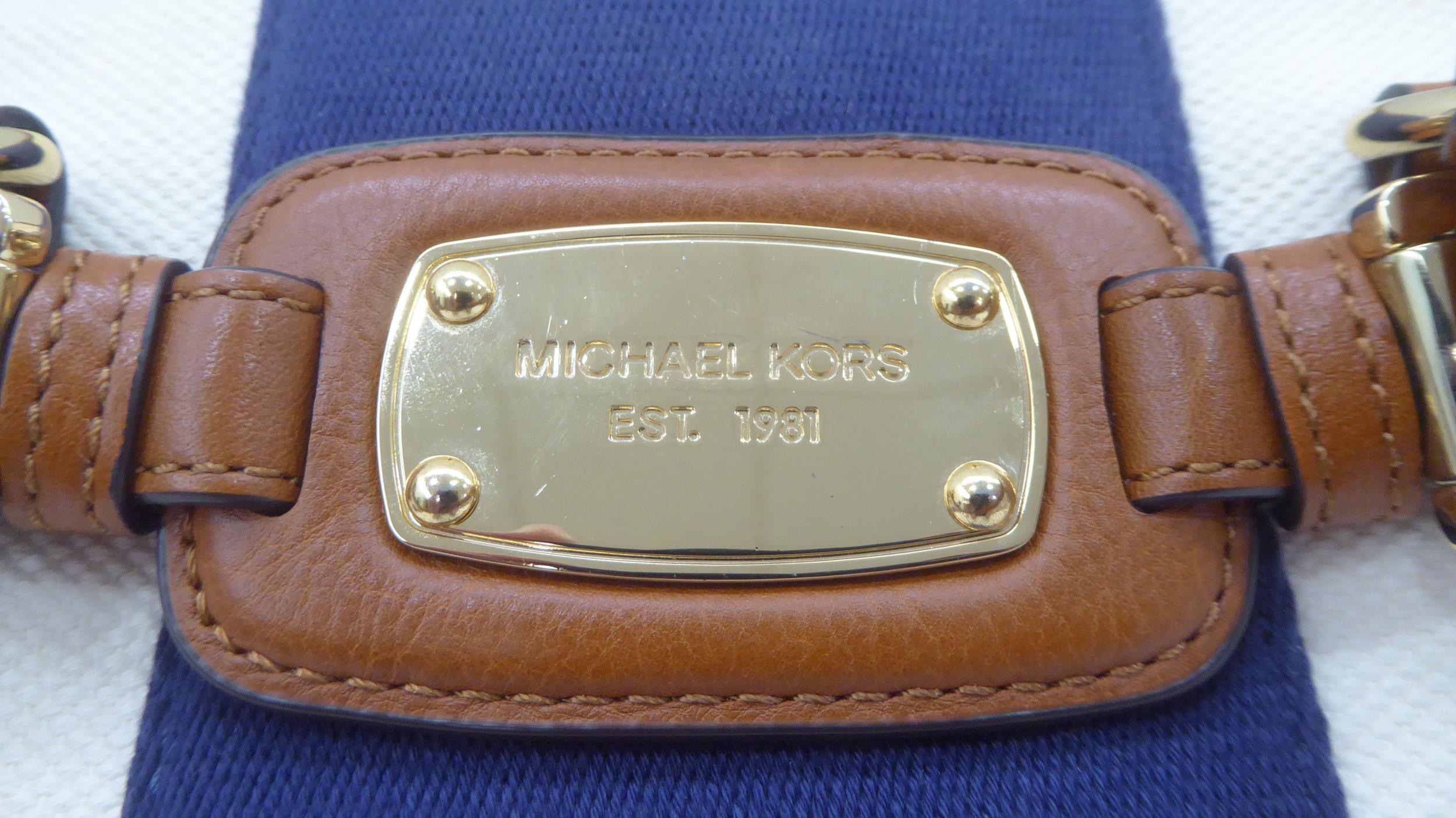 A ladies Michael Kors brown leather, cream coloured and dark blue fabric handbag