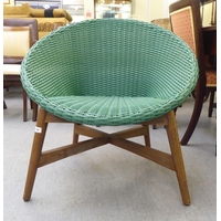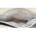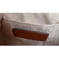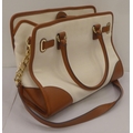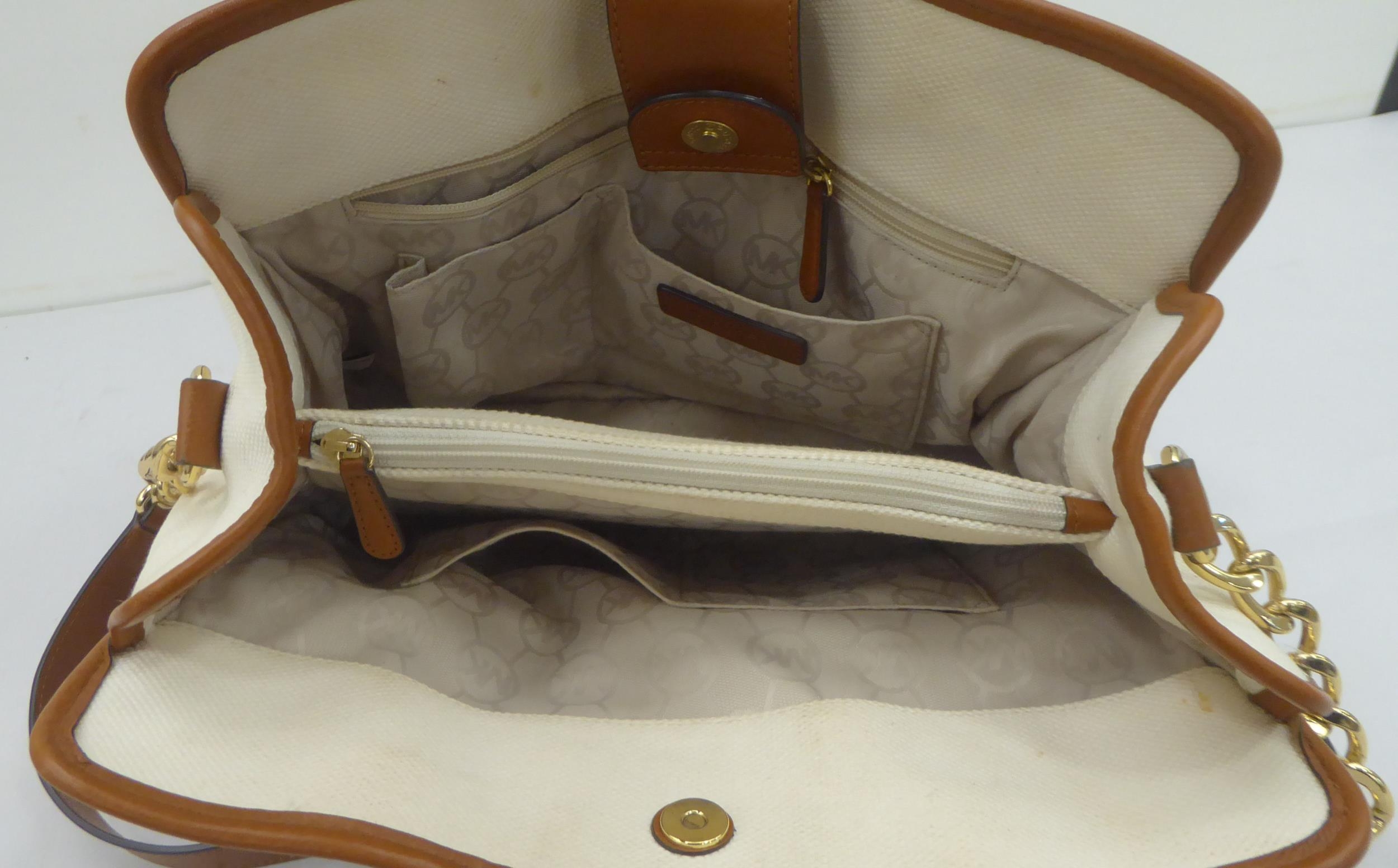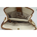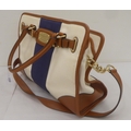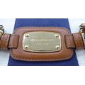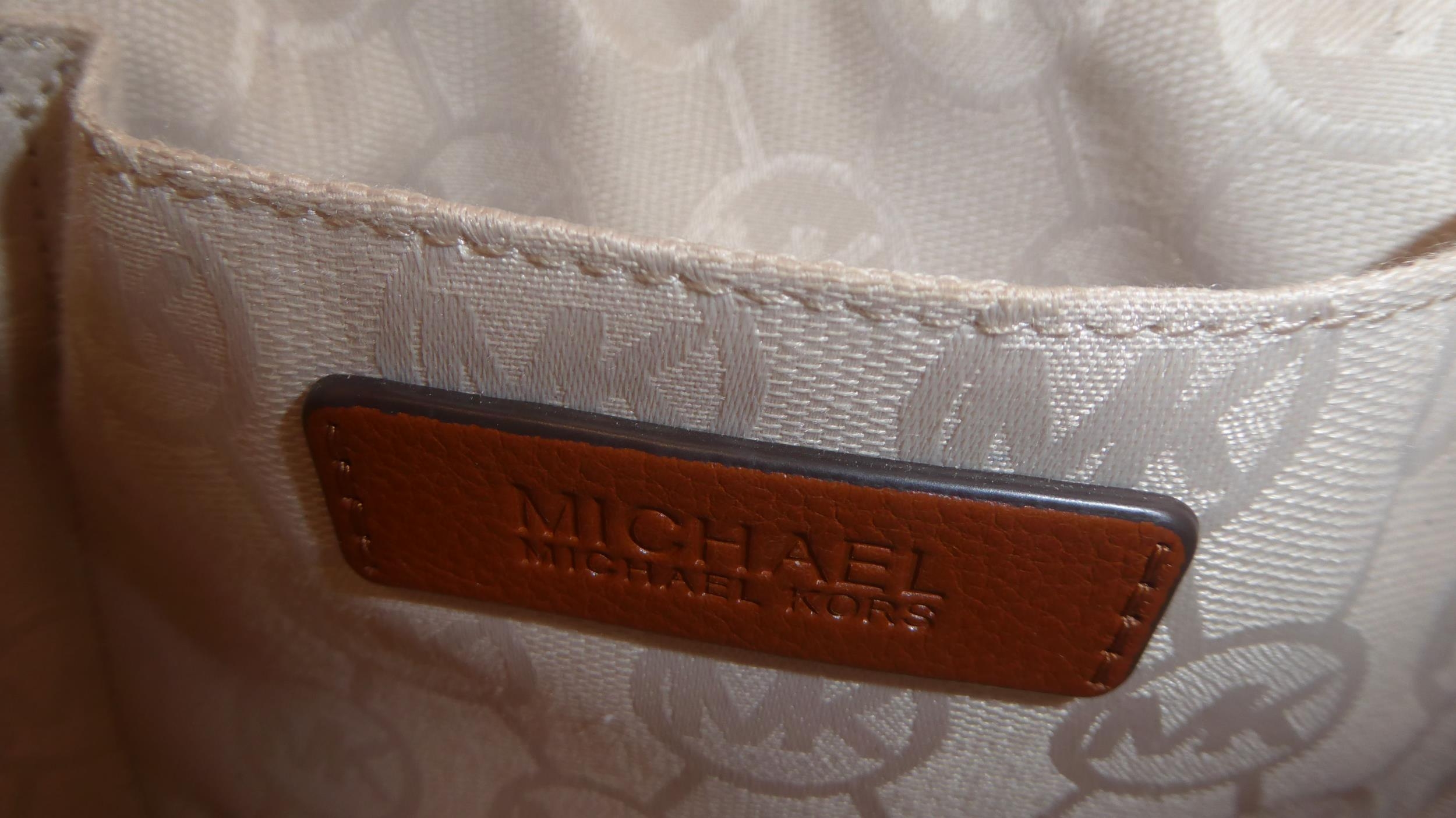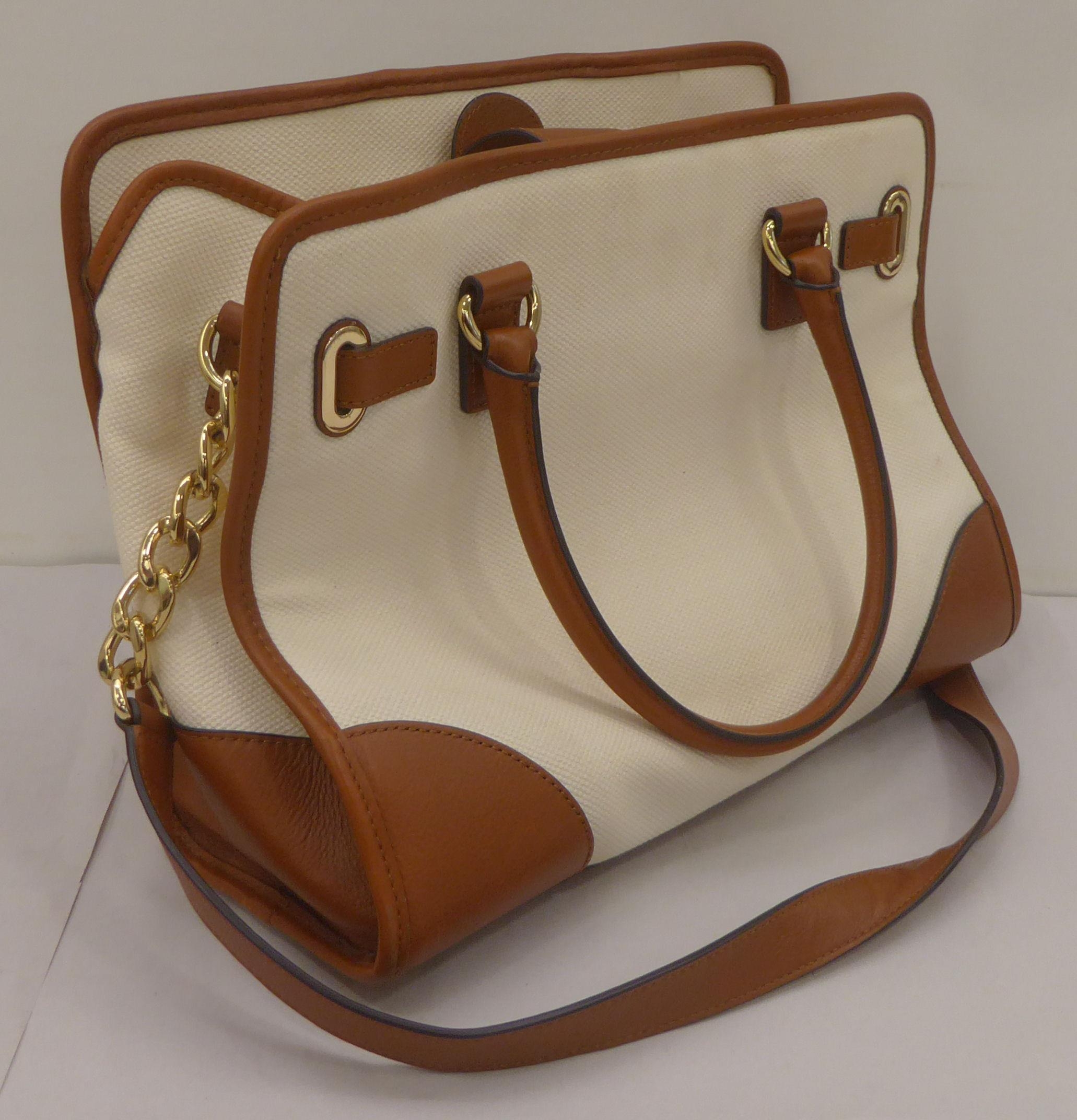 A ladies Michael Kors brown leather, cream coloured and dark blue fabric handbag