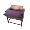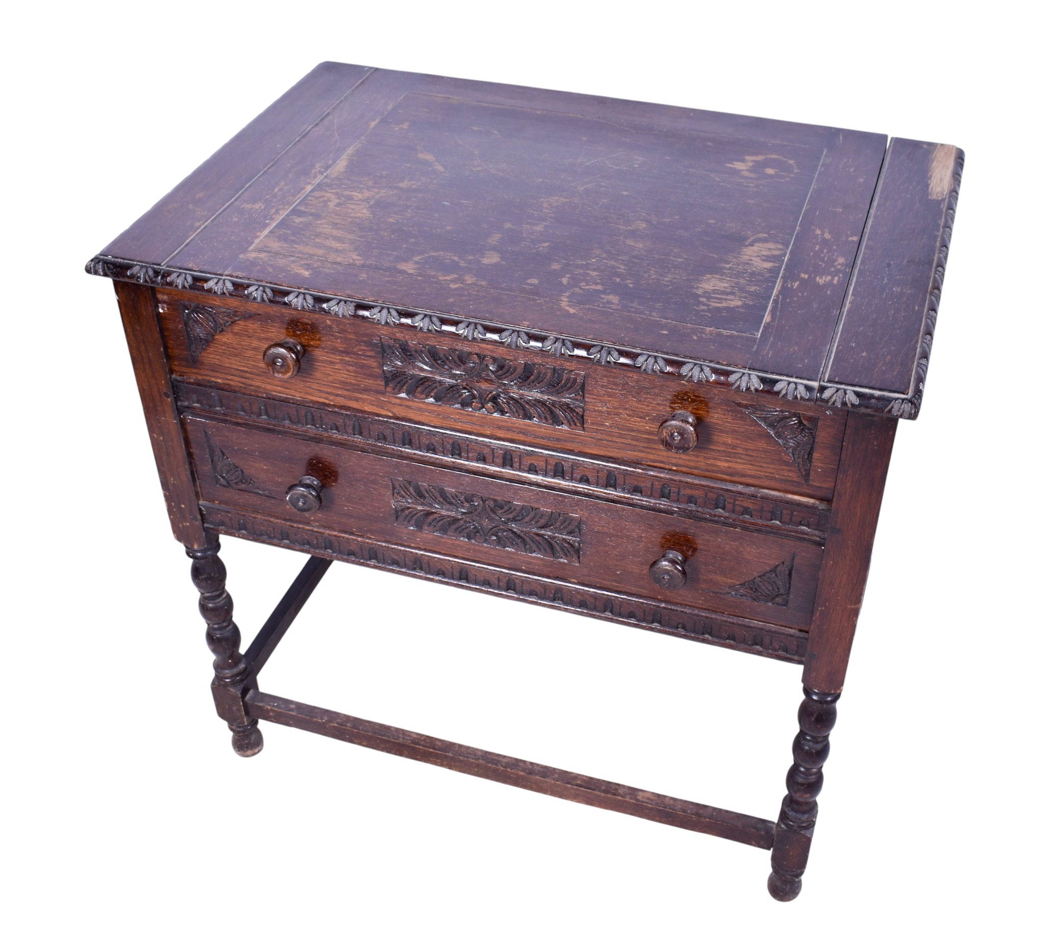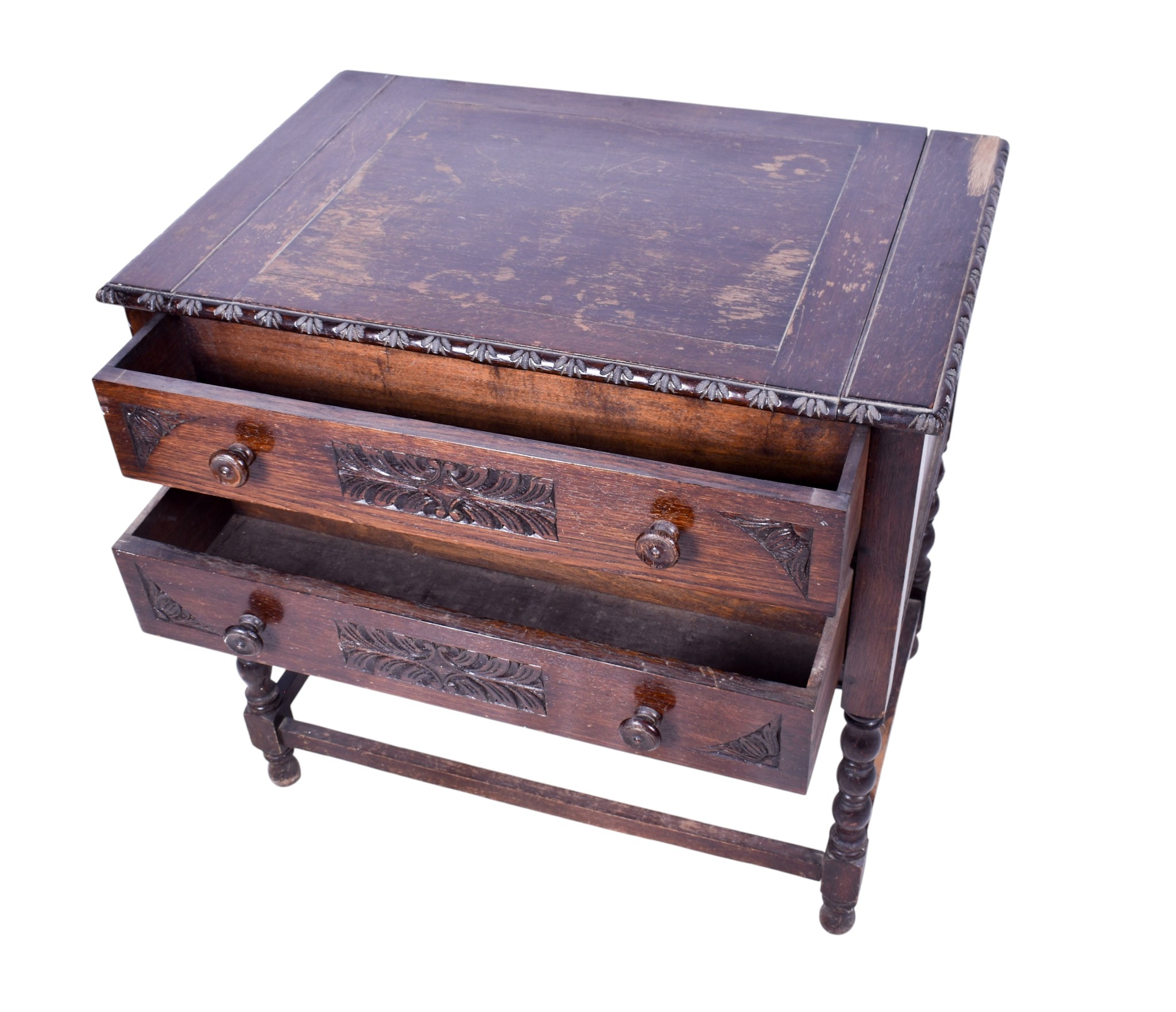 A carved oak writing table. Having two graduated drawers with turned handles, raised on barley twist supports united by stretchers, mounted on bun feet, H77cm x W81cm x D52.5cm.