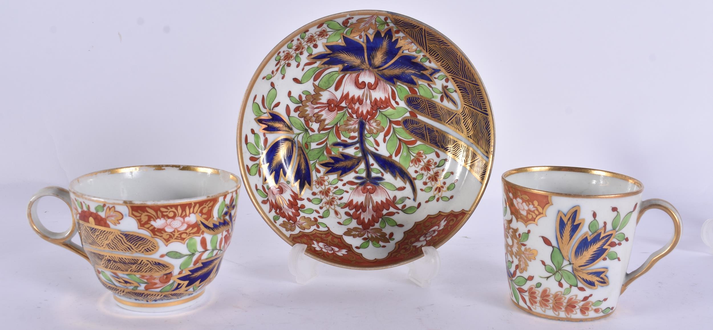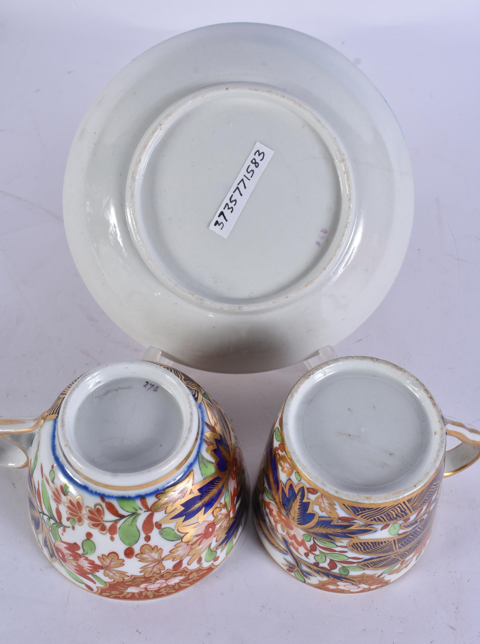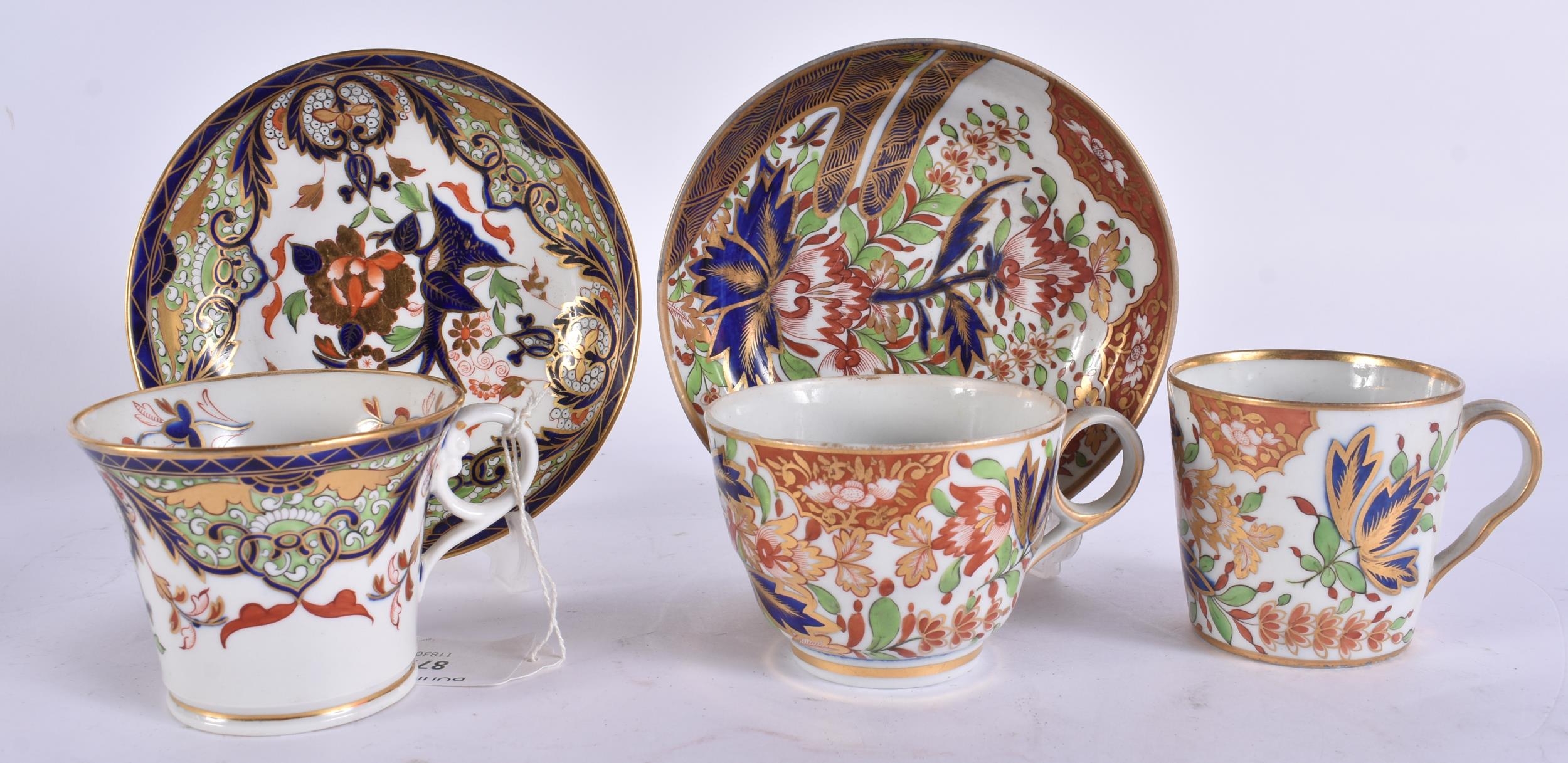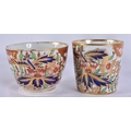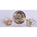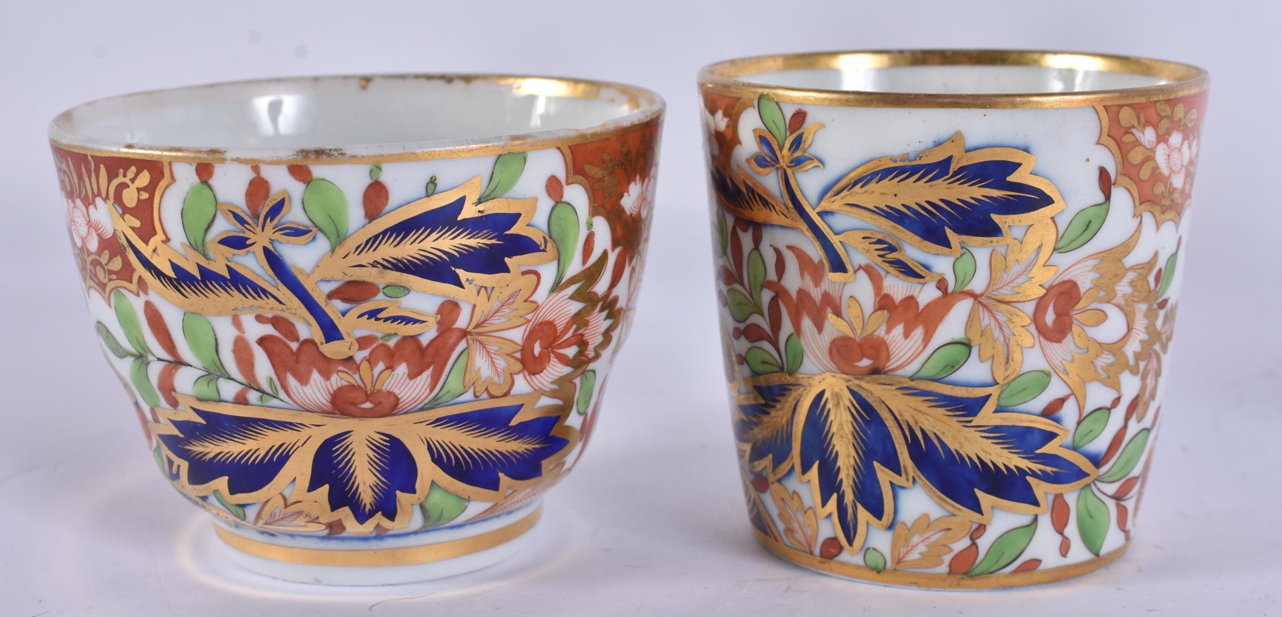 TWO EARLY 19TH CENTURY CHAMBERLAINS WORCESTER CUPS AND SAUCERS painted with imari tones. (5)