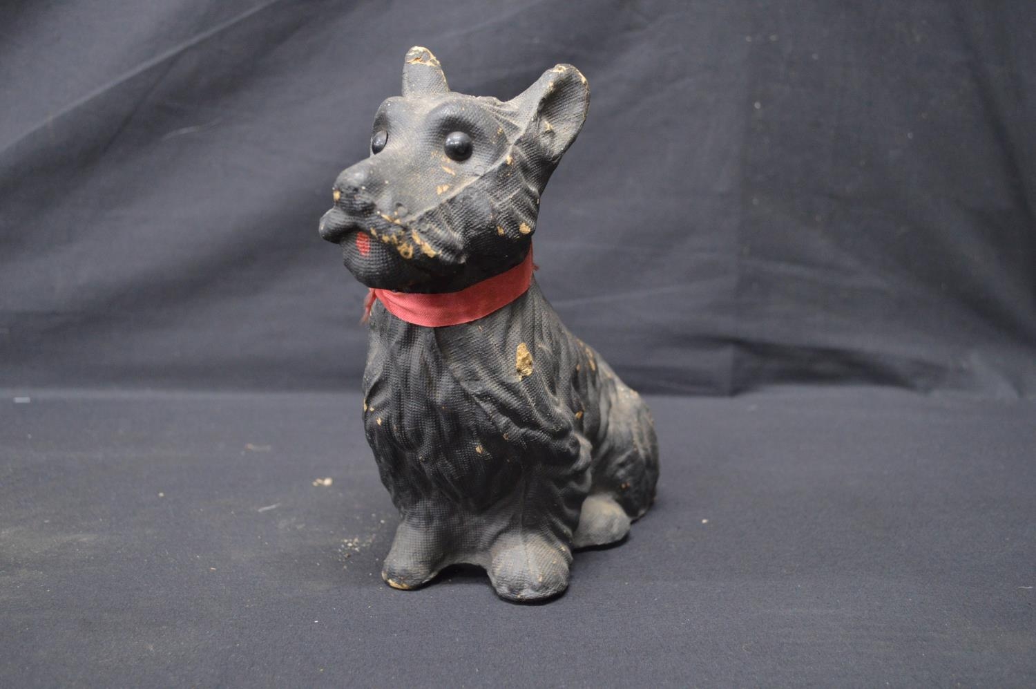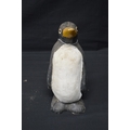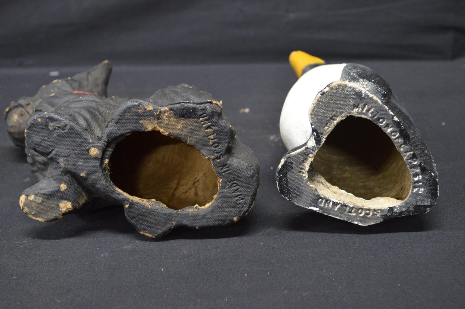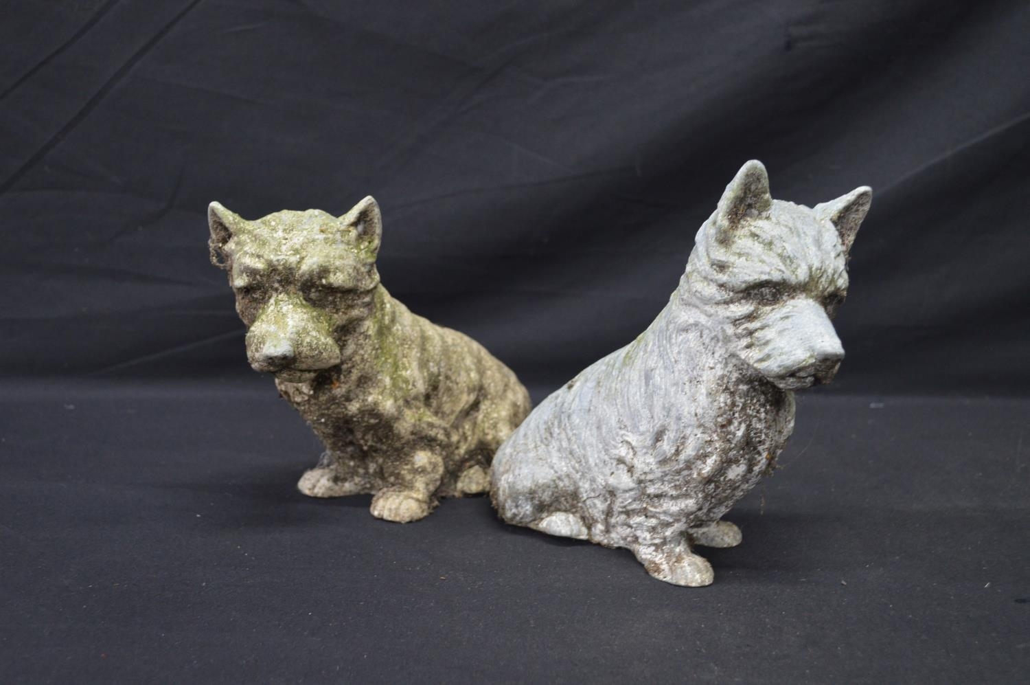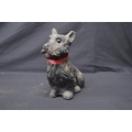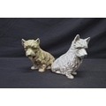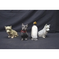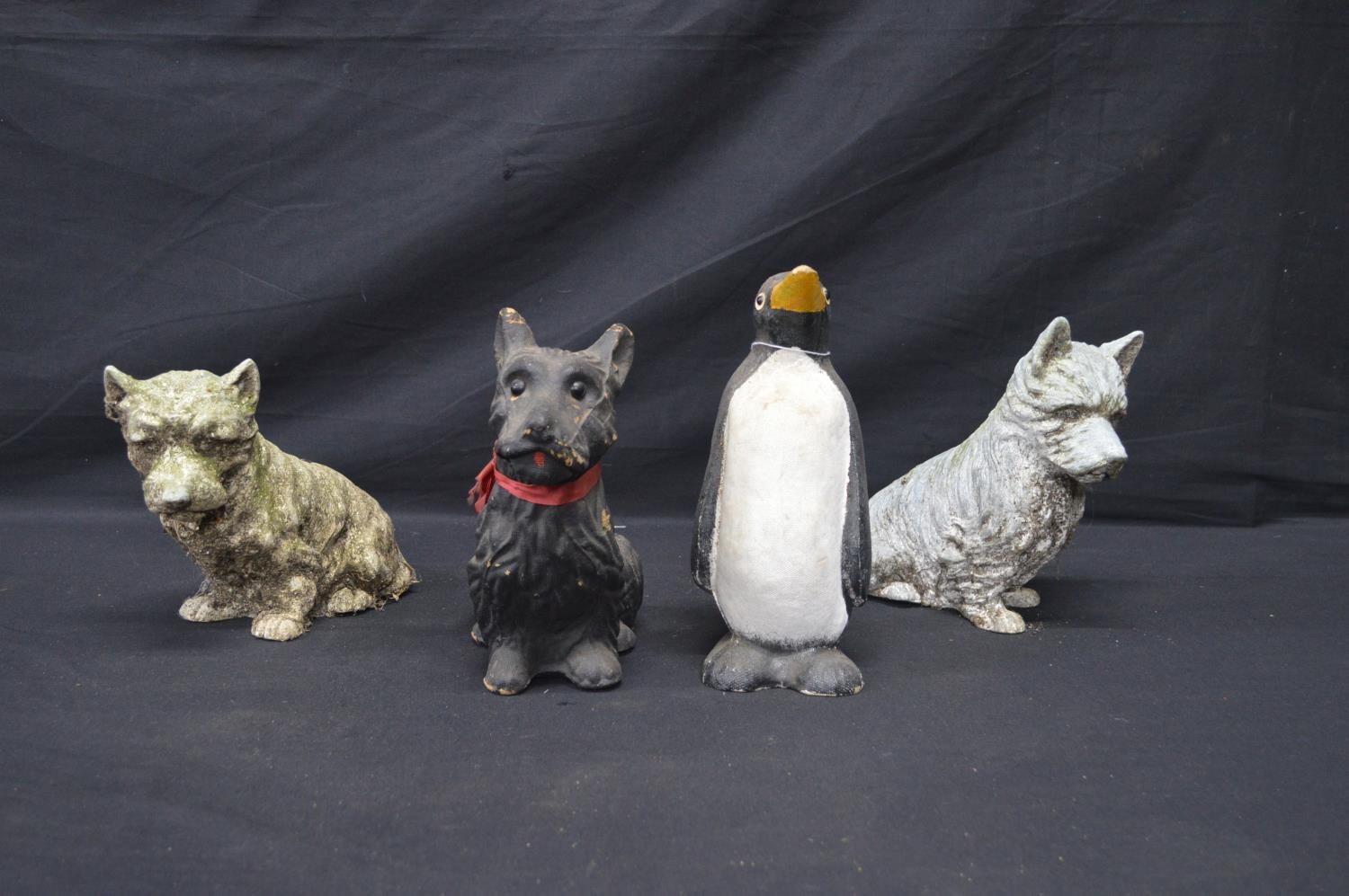 Two spelter figures of seated dogs - 19.5cm x 16.5cm tall together with two Made in Scotland figures comprising: penguin and dog
